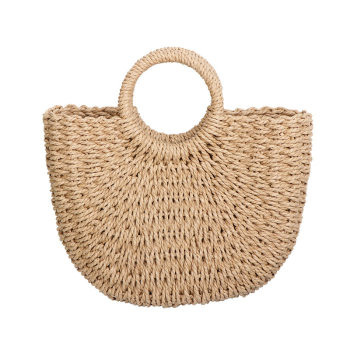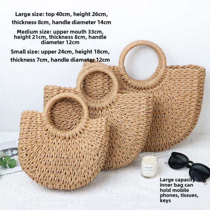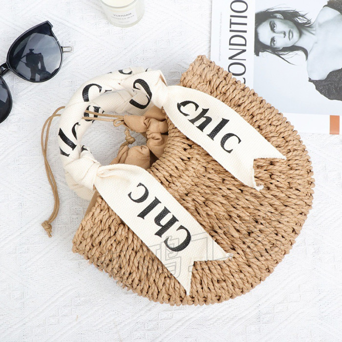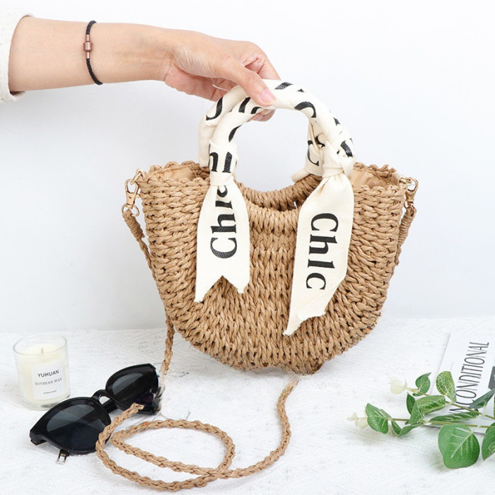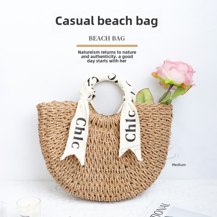 字母絲帶手提包半圓手工編織包百搭度假包沙灘草編包女包
