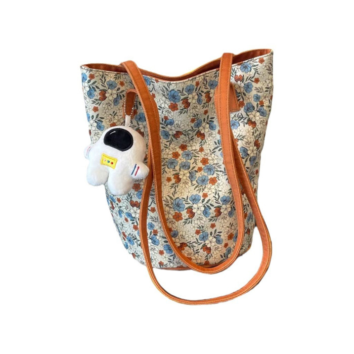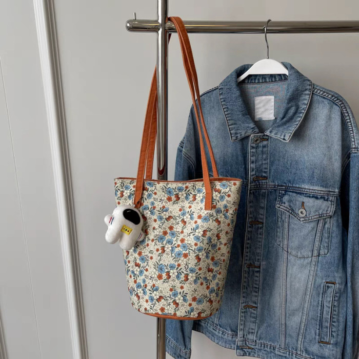 設計碎花單肩包女2024新款高顔值帆布包百搭復古大容量托特慵懶風