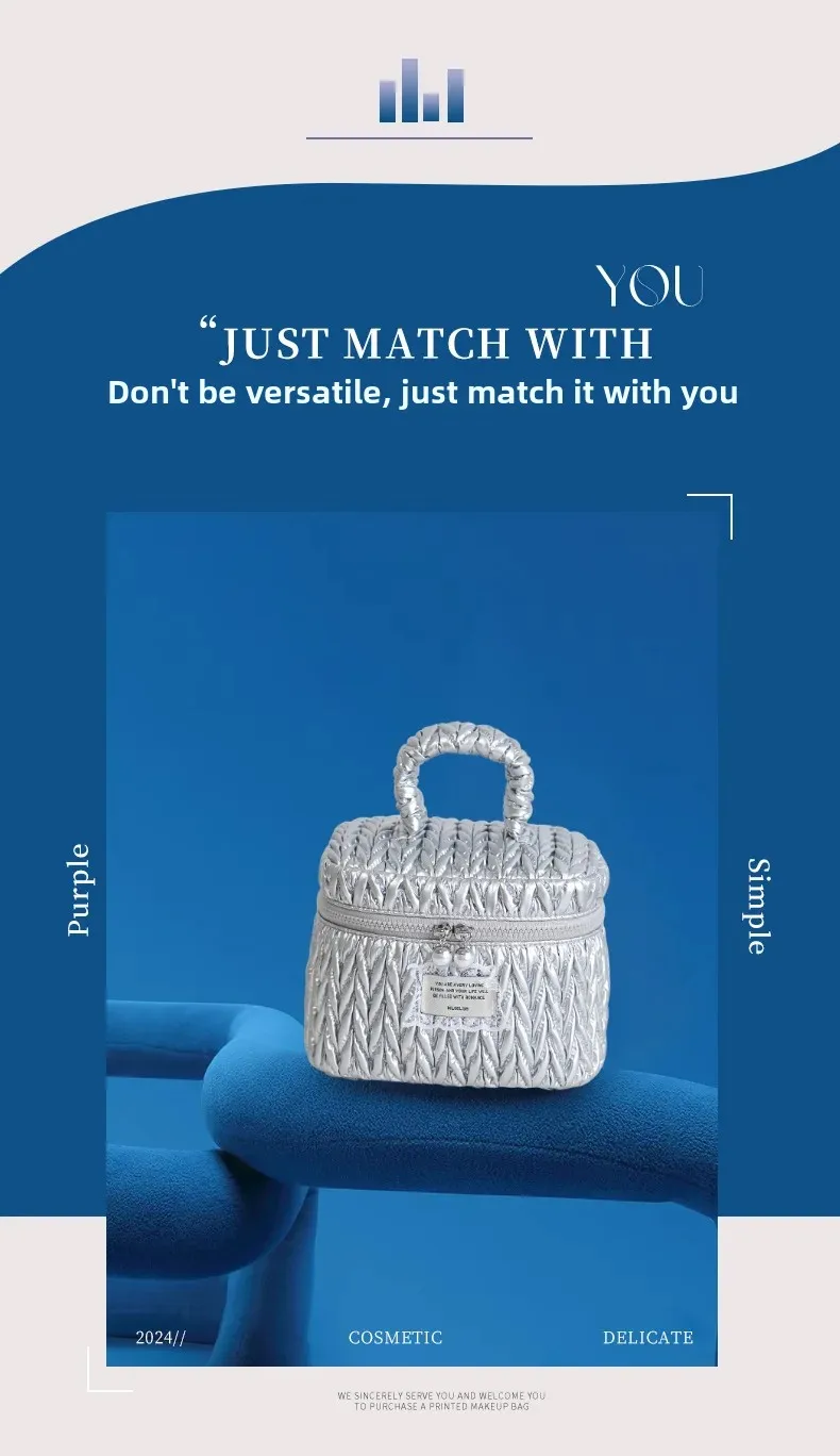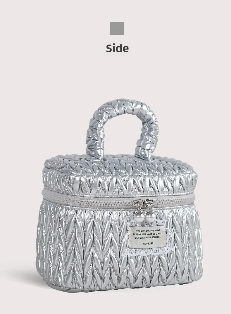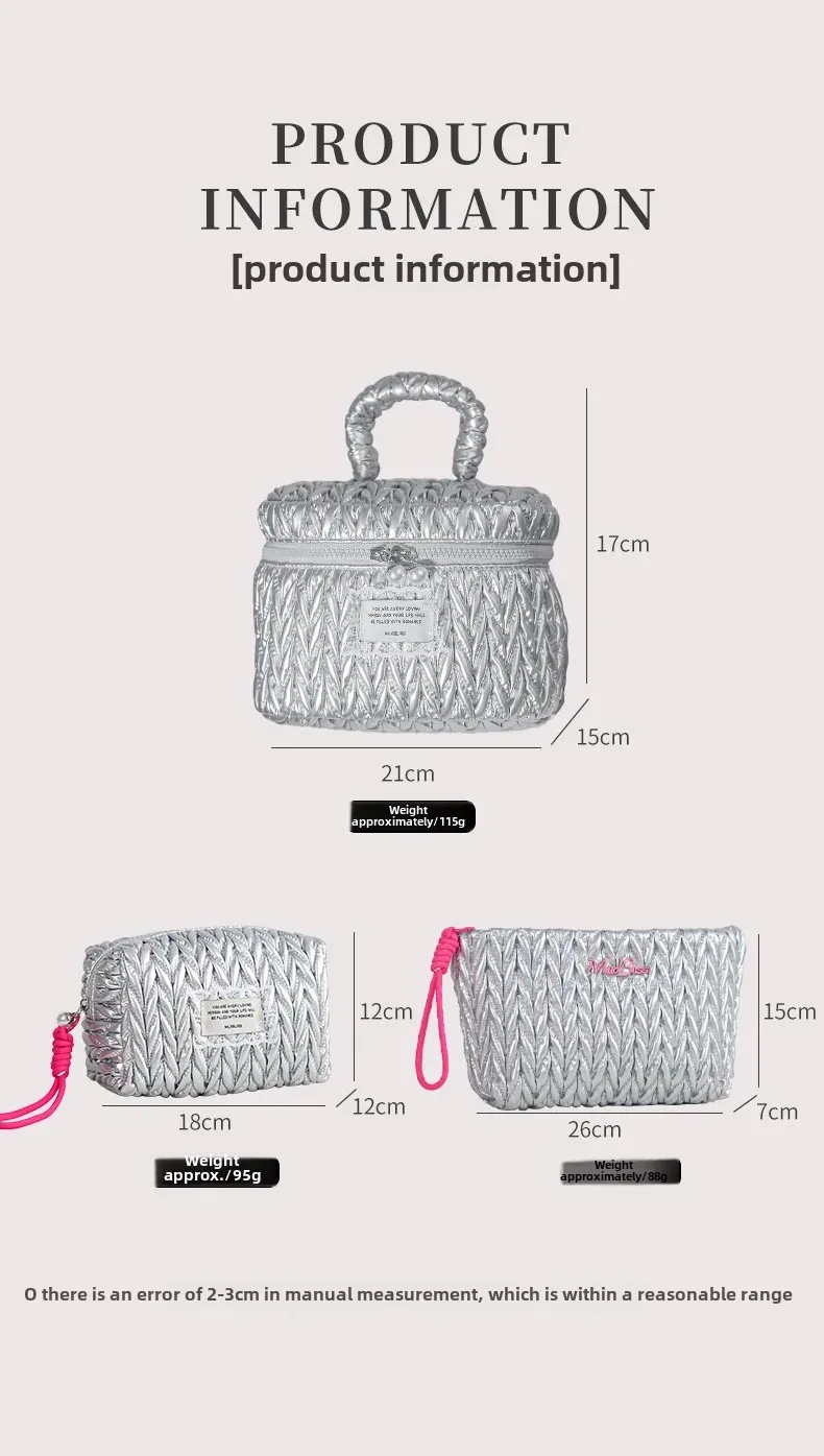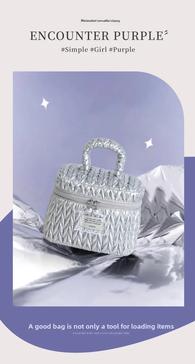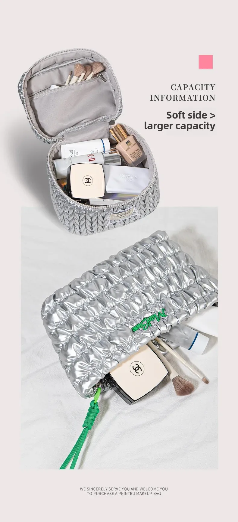 新款個性ins風大容量銀色化妝包大容量手提收納包高級感羽絨質感