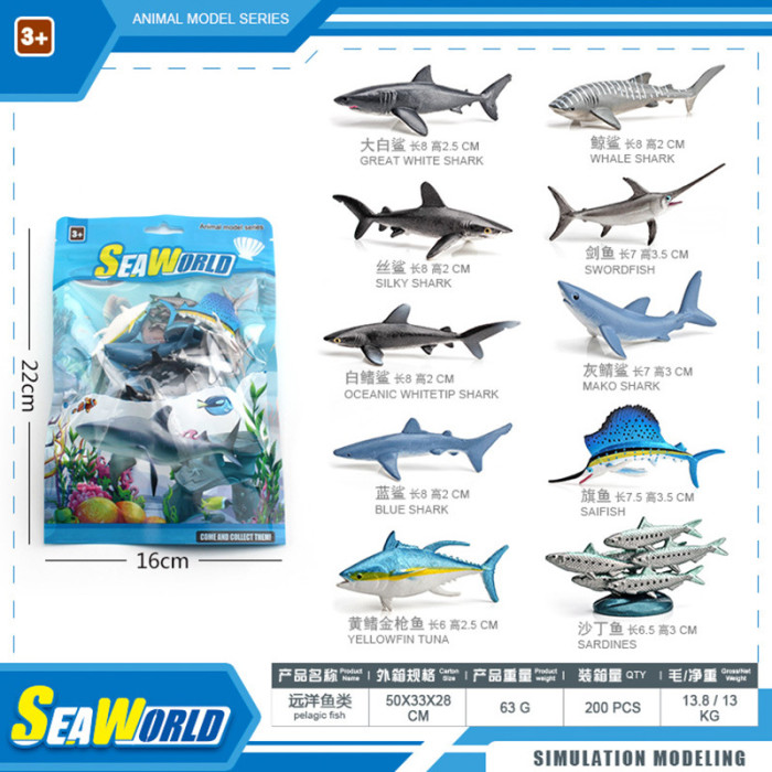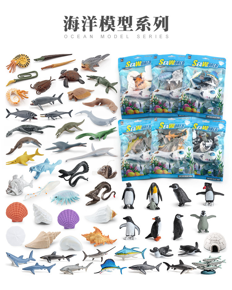 仿真遠古海洋生物靜態模型迷你沙丁魚劍魚大白鯊貝殼彩袋擺件