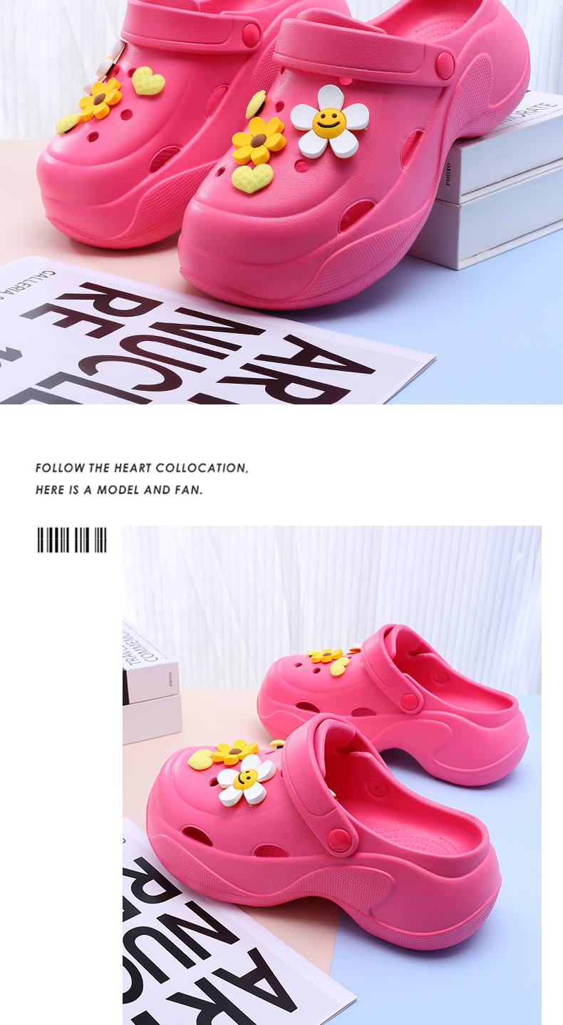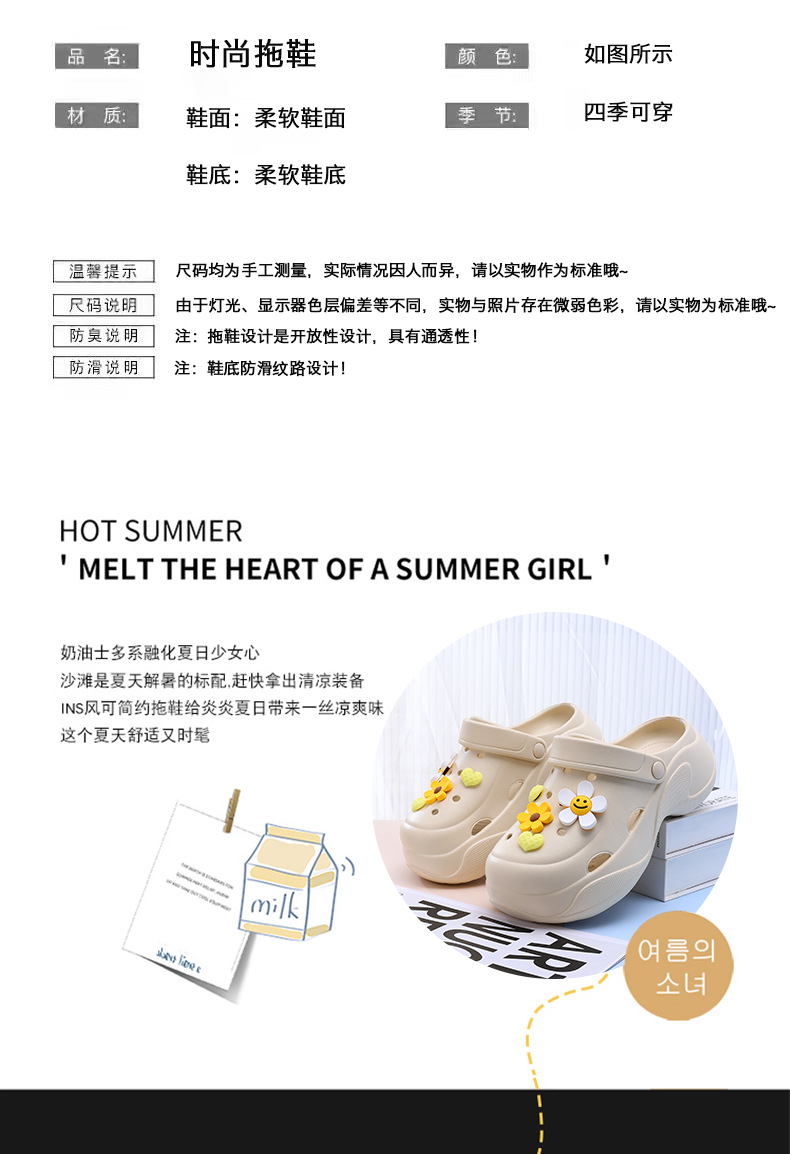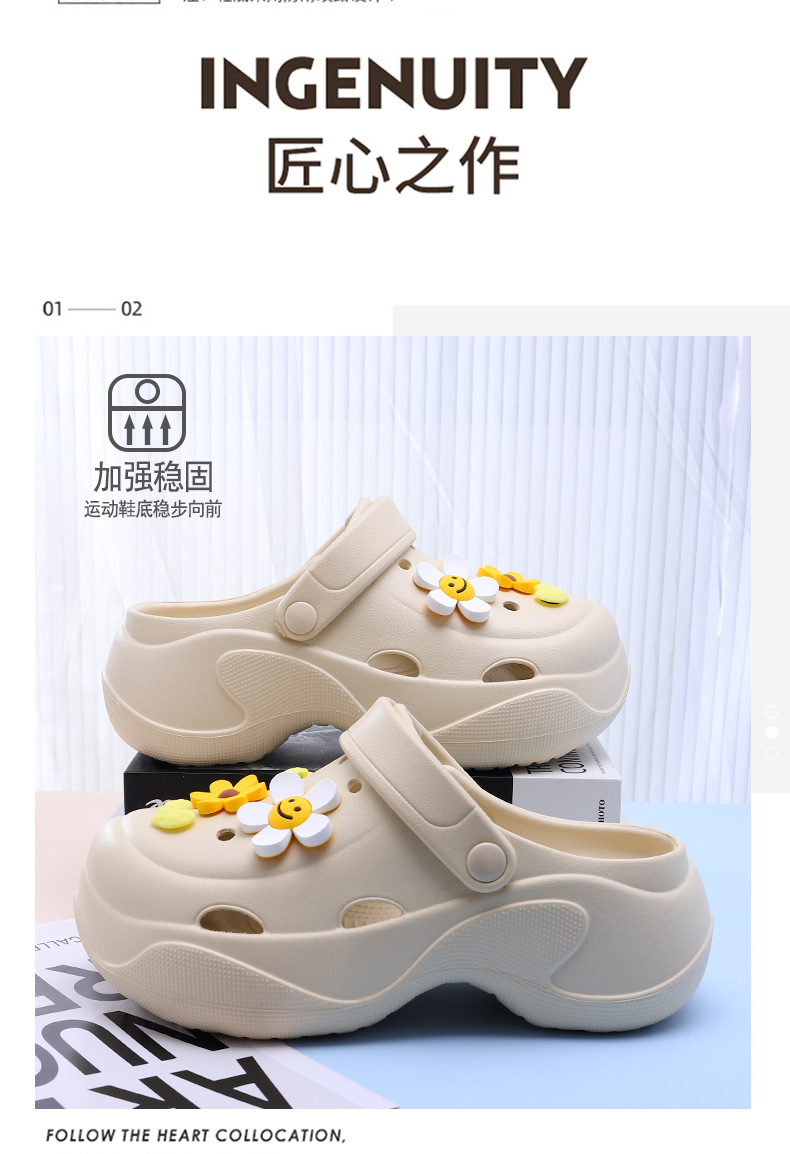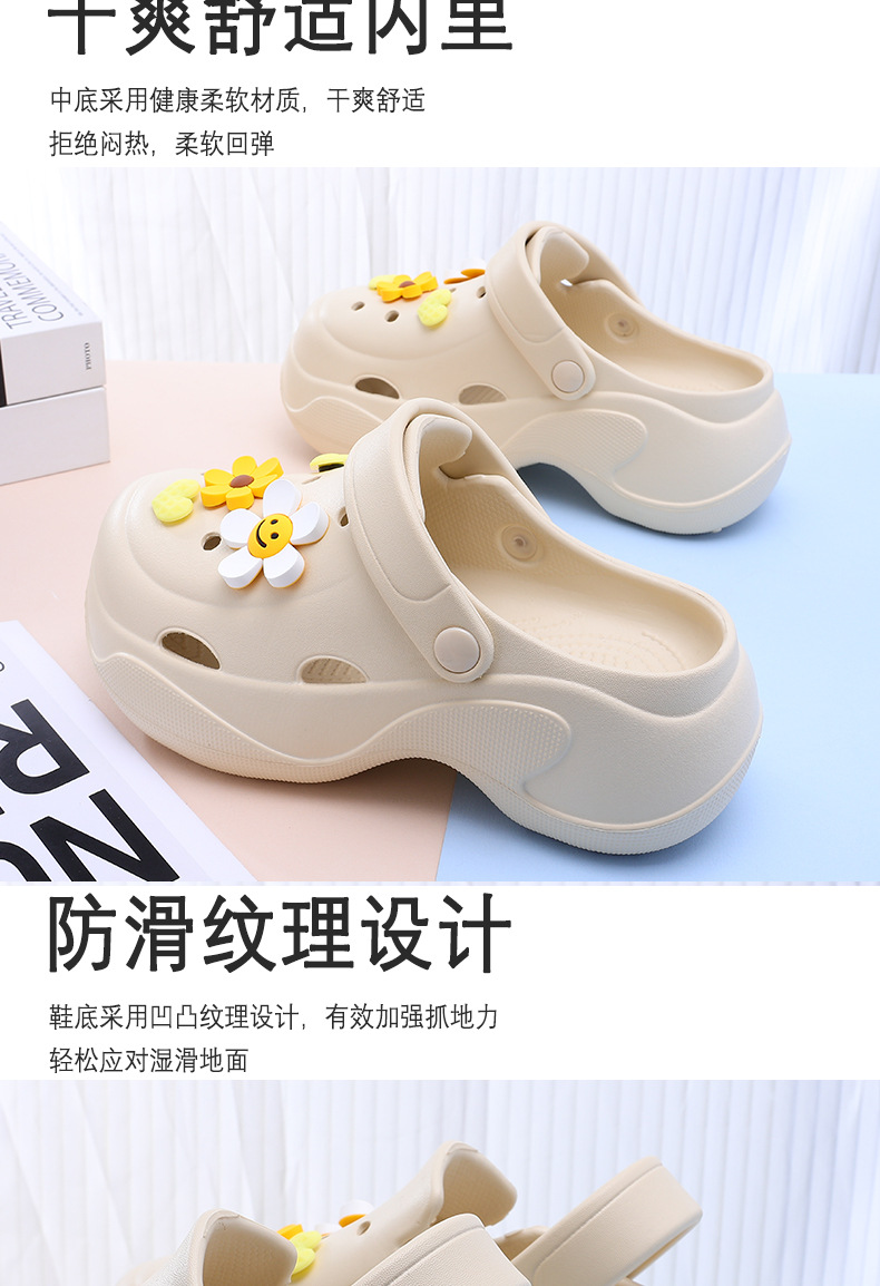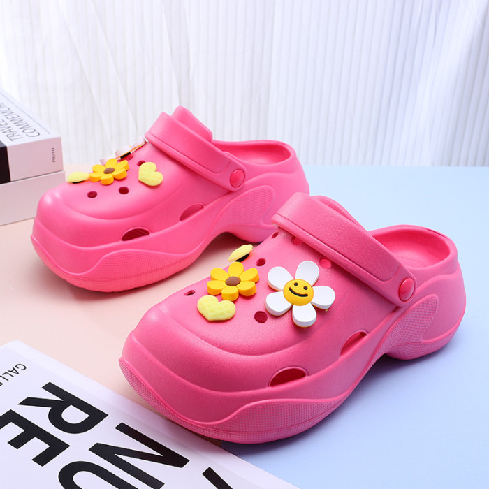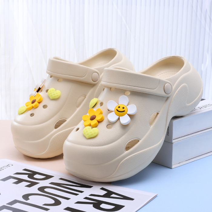 新款黃色太陽花洞洞鞋女鞋花笑臉花可愛卡通鞋可拆卸diy沙灘涼拖