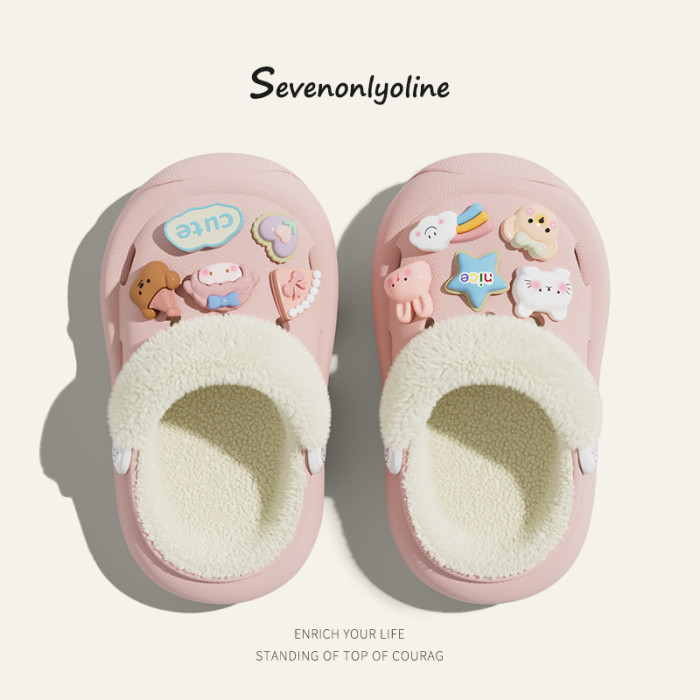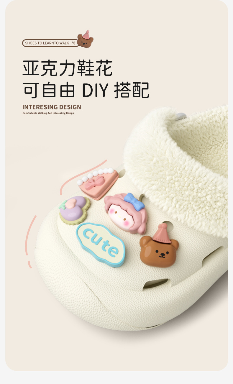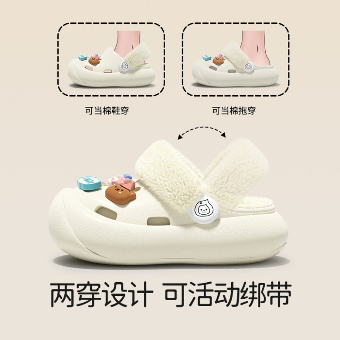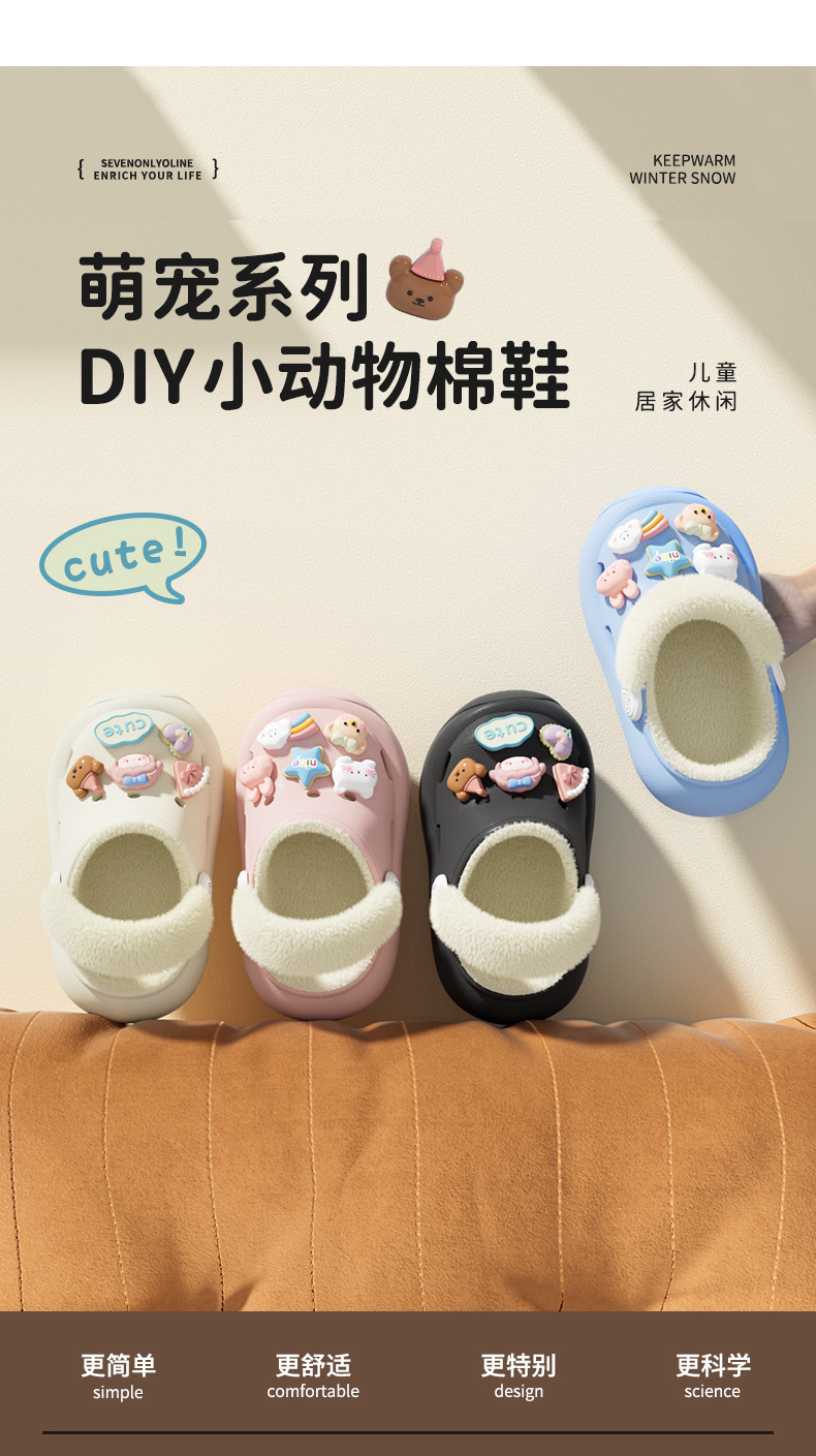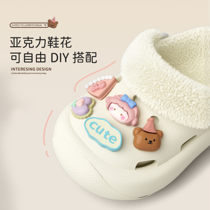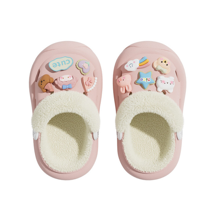 冬季新款兒童綁帶卡通小動物外穿居家內裡加絨保暖DIY鞋花洞洞鞋