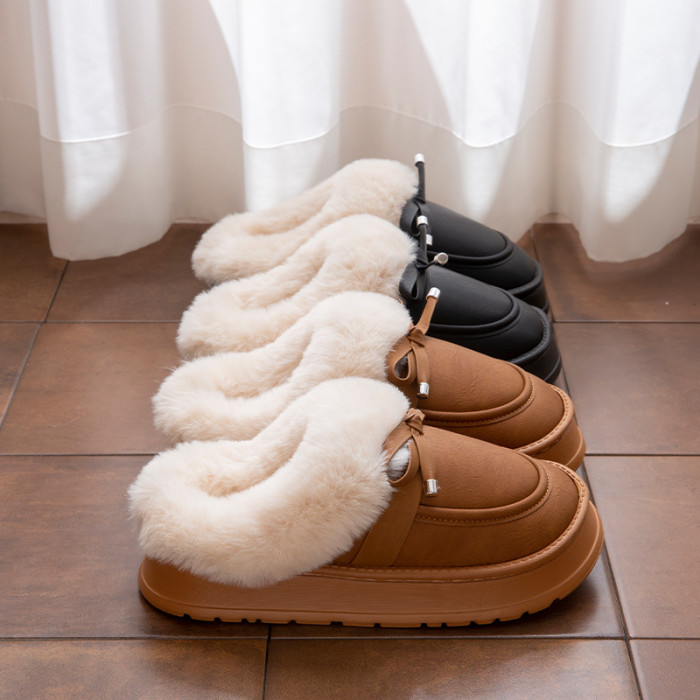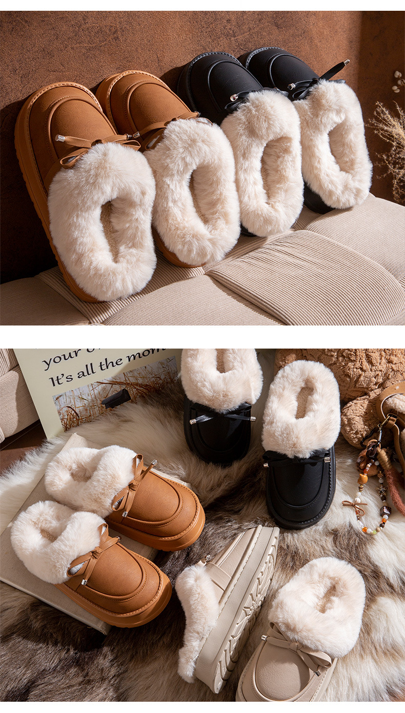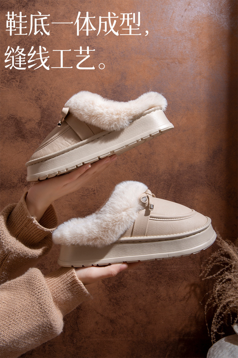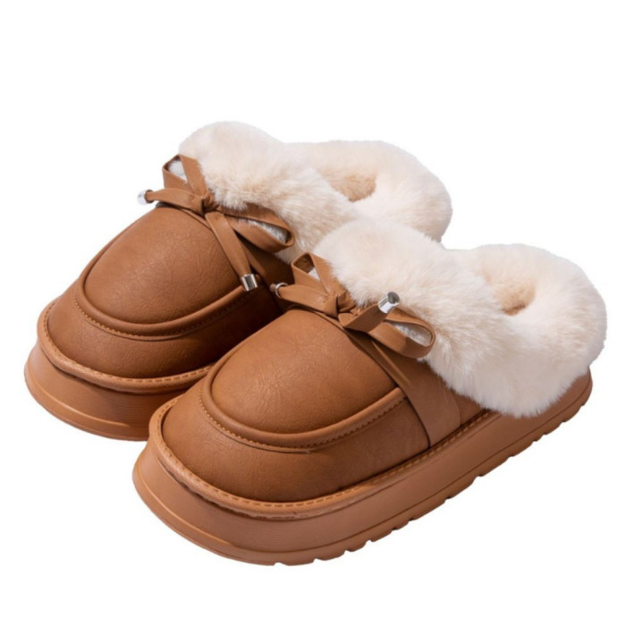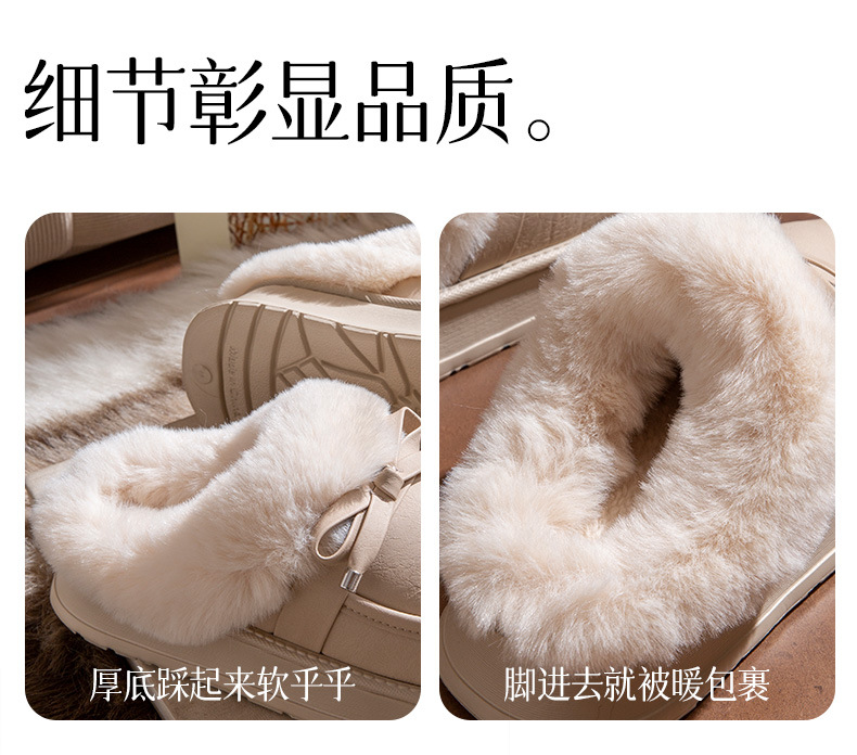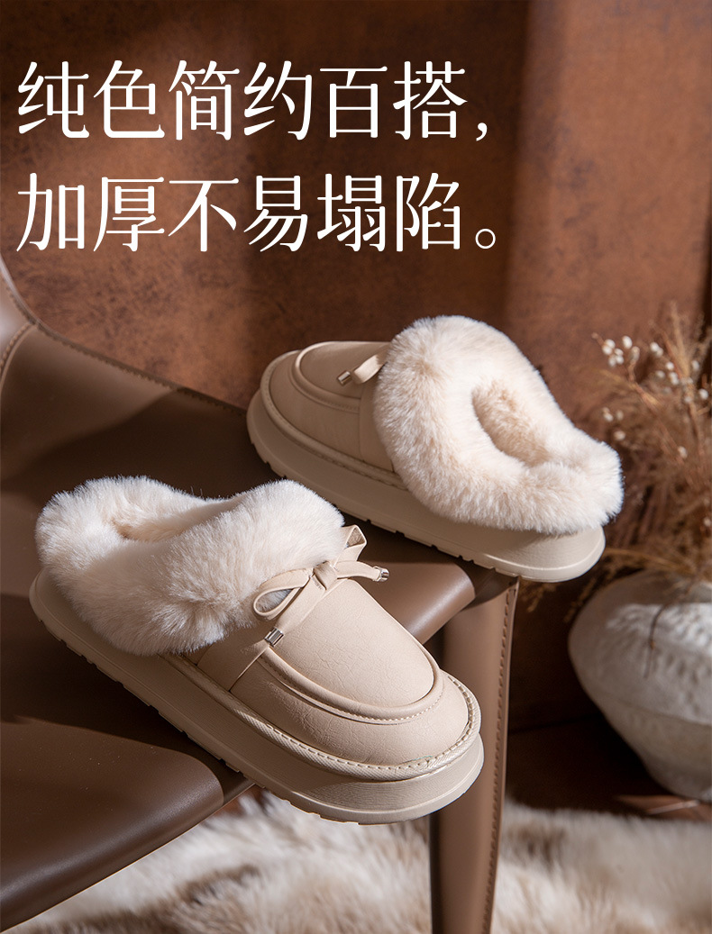 毛毛拖鞋女款冬季室內居家時尚蝴蝶結加絨保暖防滑PU皮防水棉拖鞋
