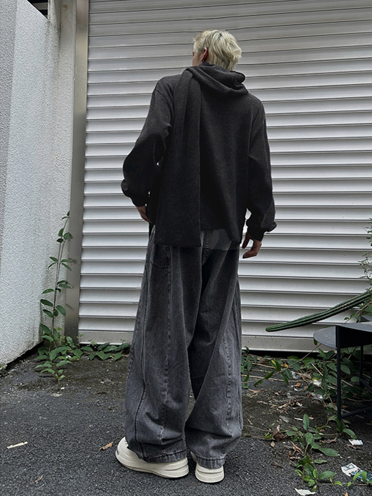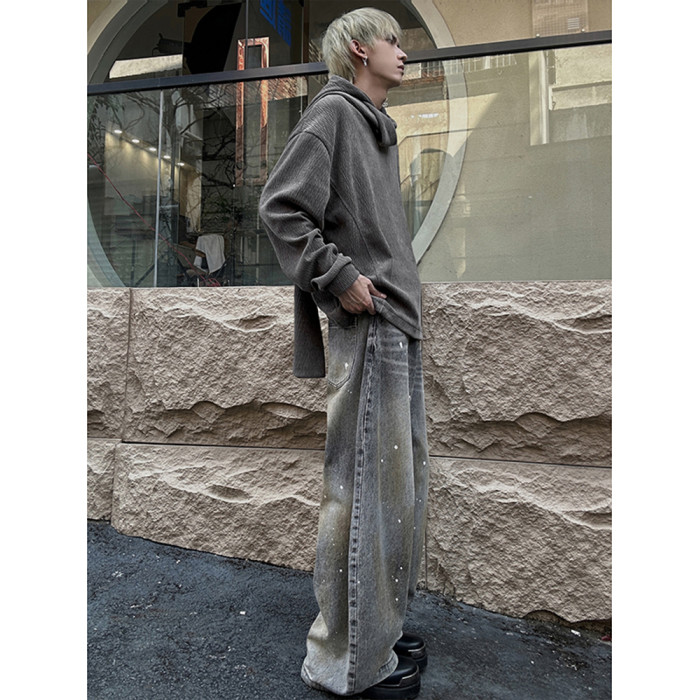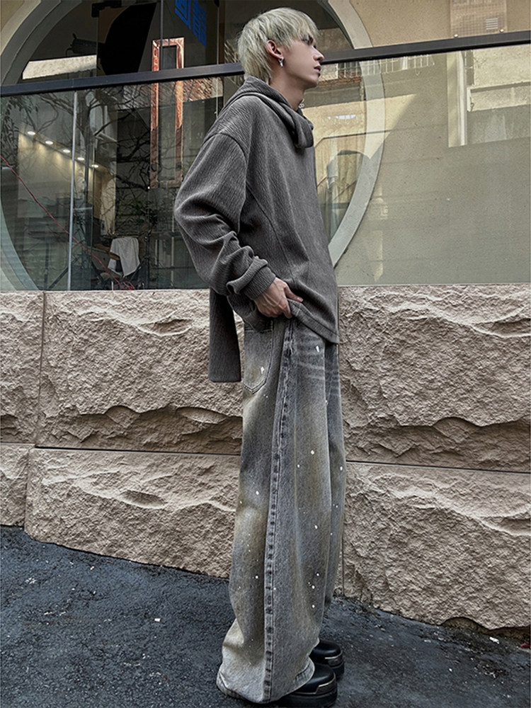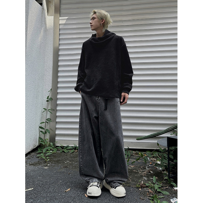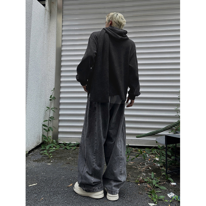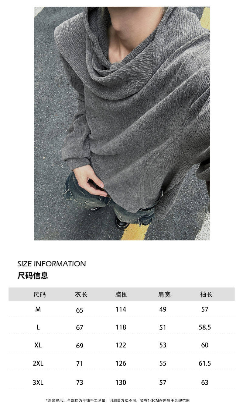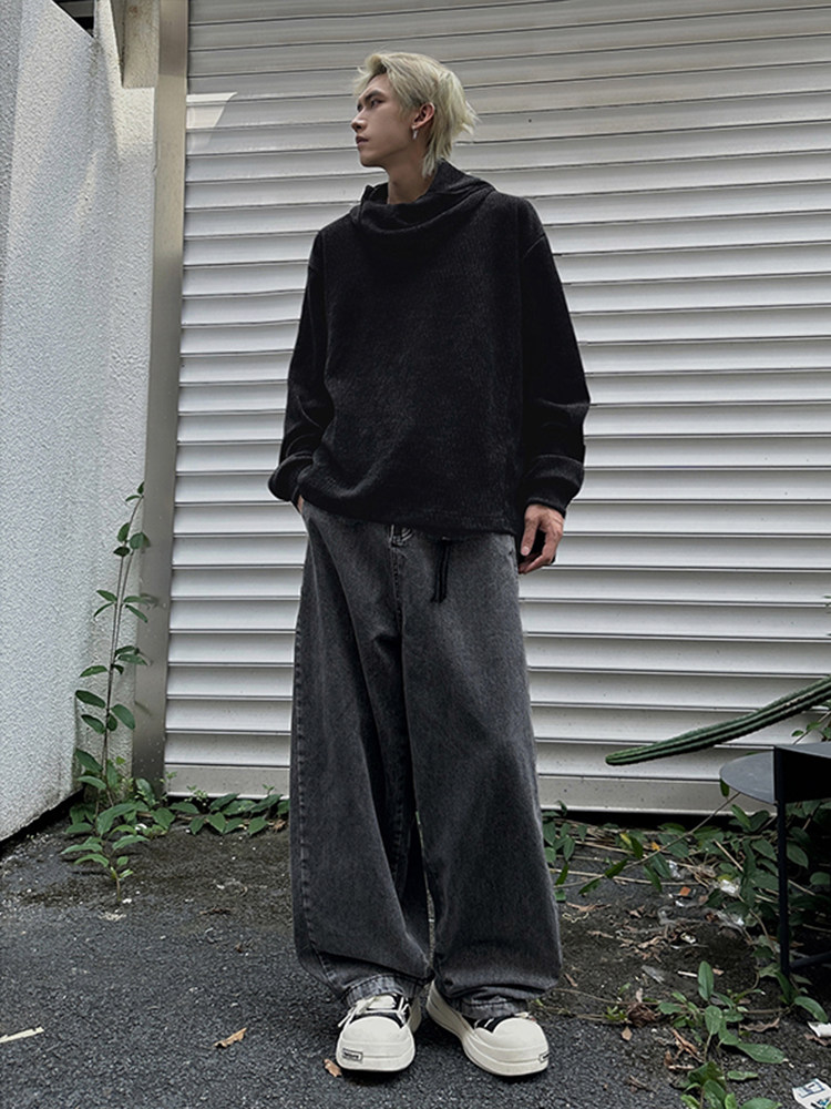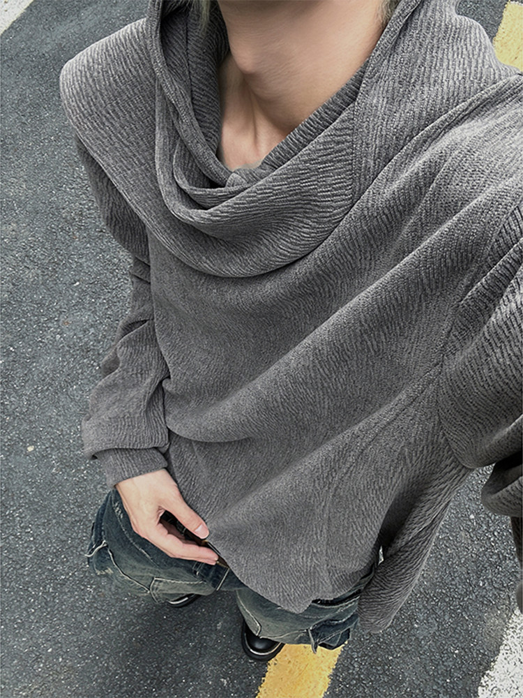 美式復古灰色圍巾領連帽衛衣男秋季百搭打底衫小衆設計感長袖上衣