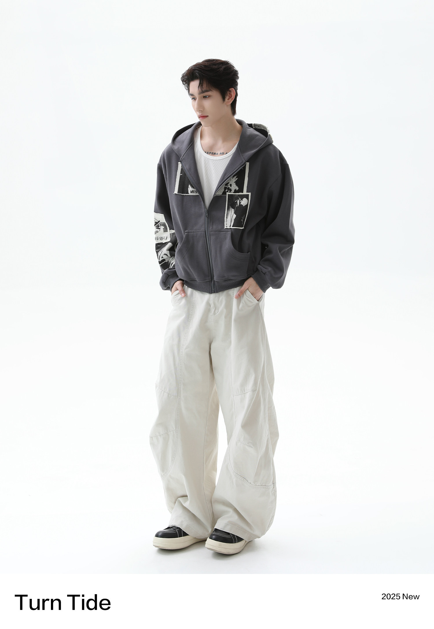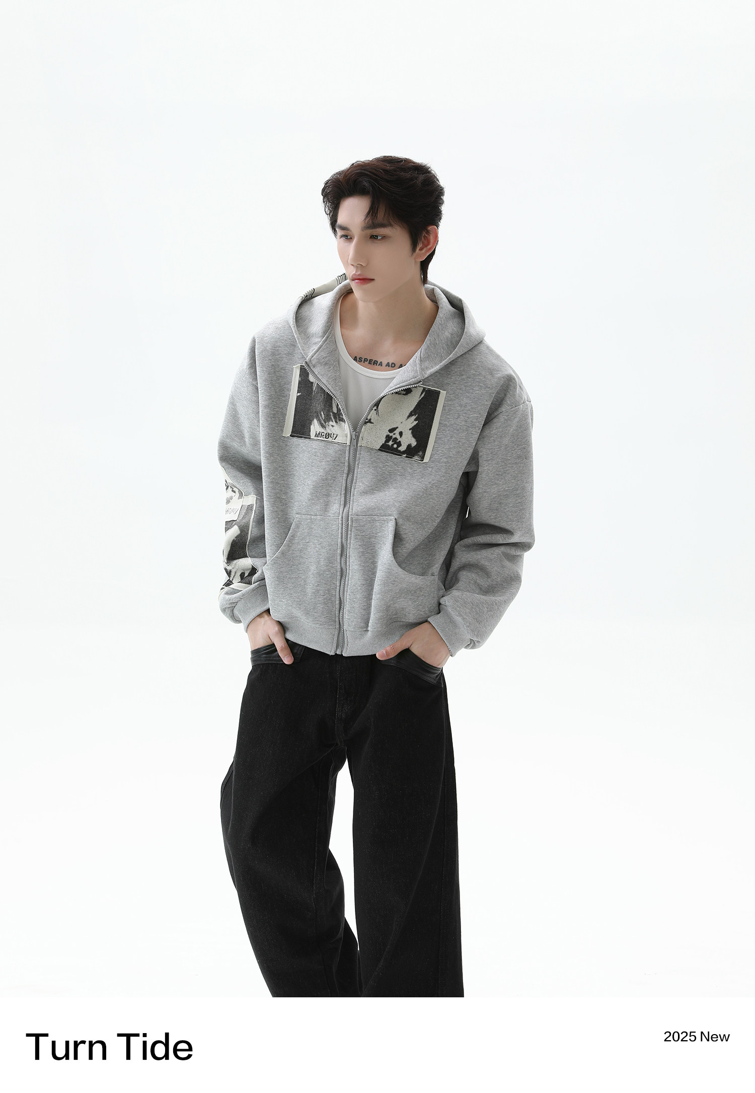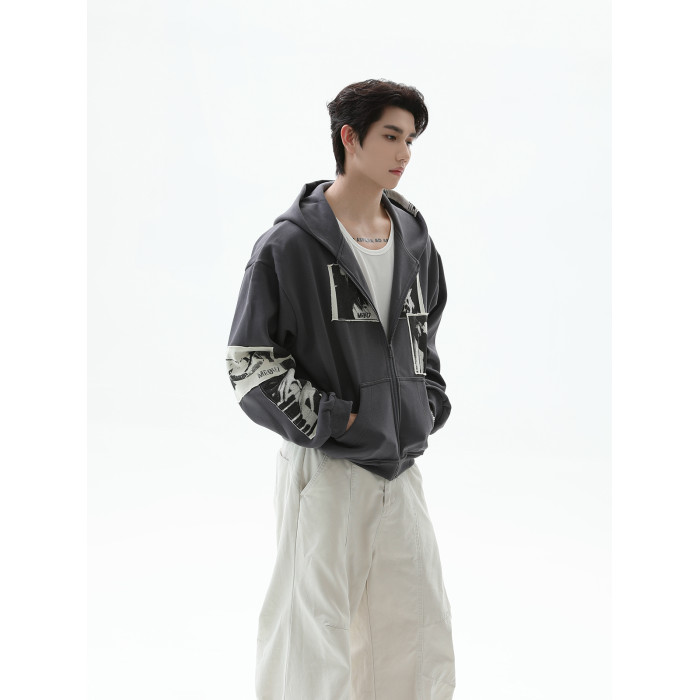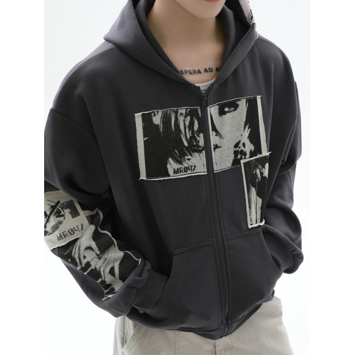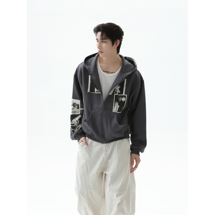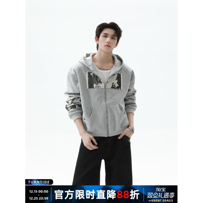 TURNTIDE 復古貼布印花連帽拉鍊衛衣男cleanfit休閒高級通勤外套