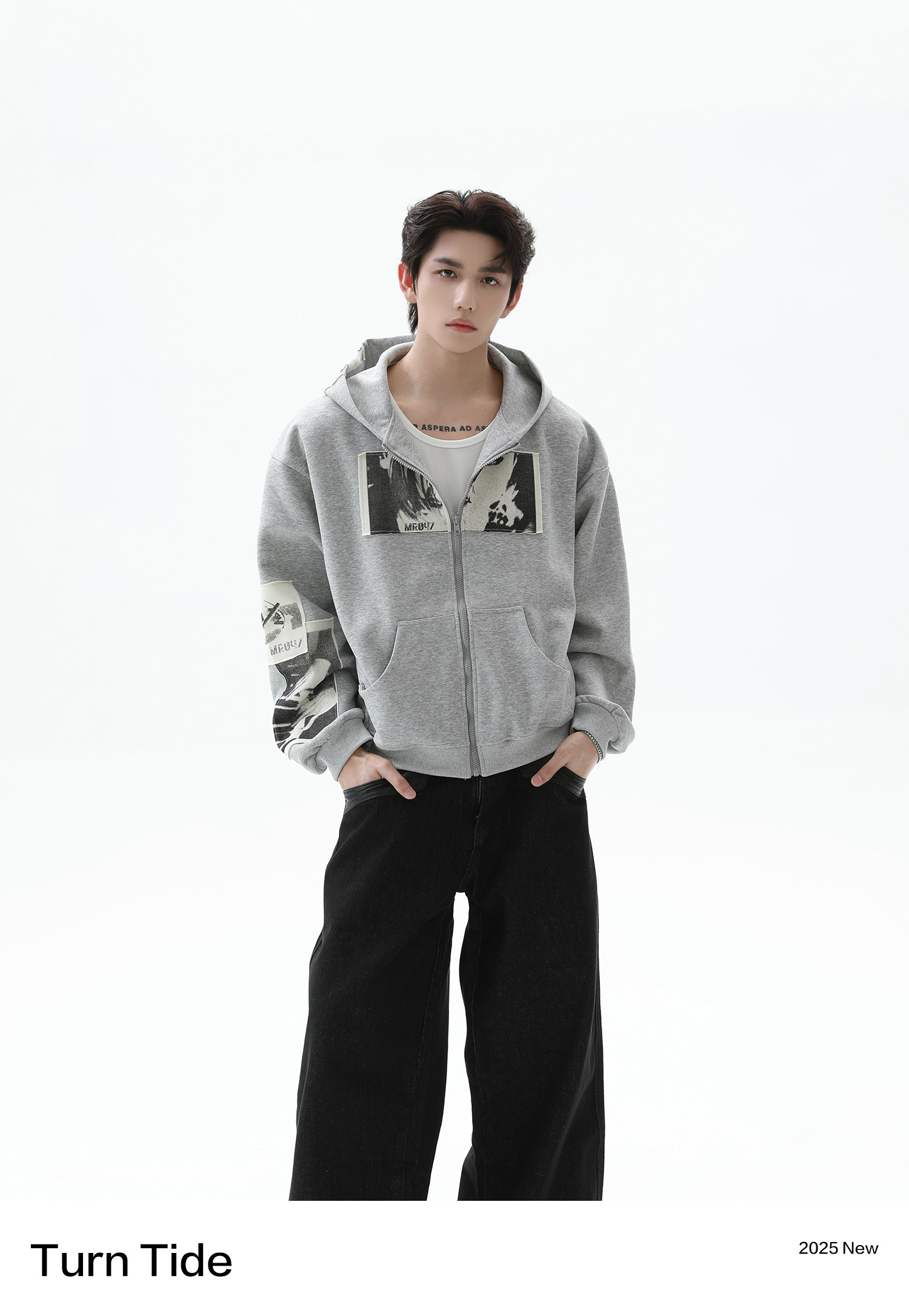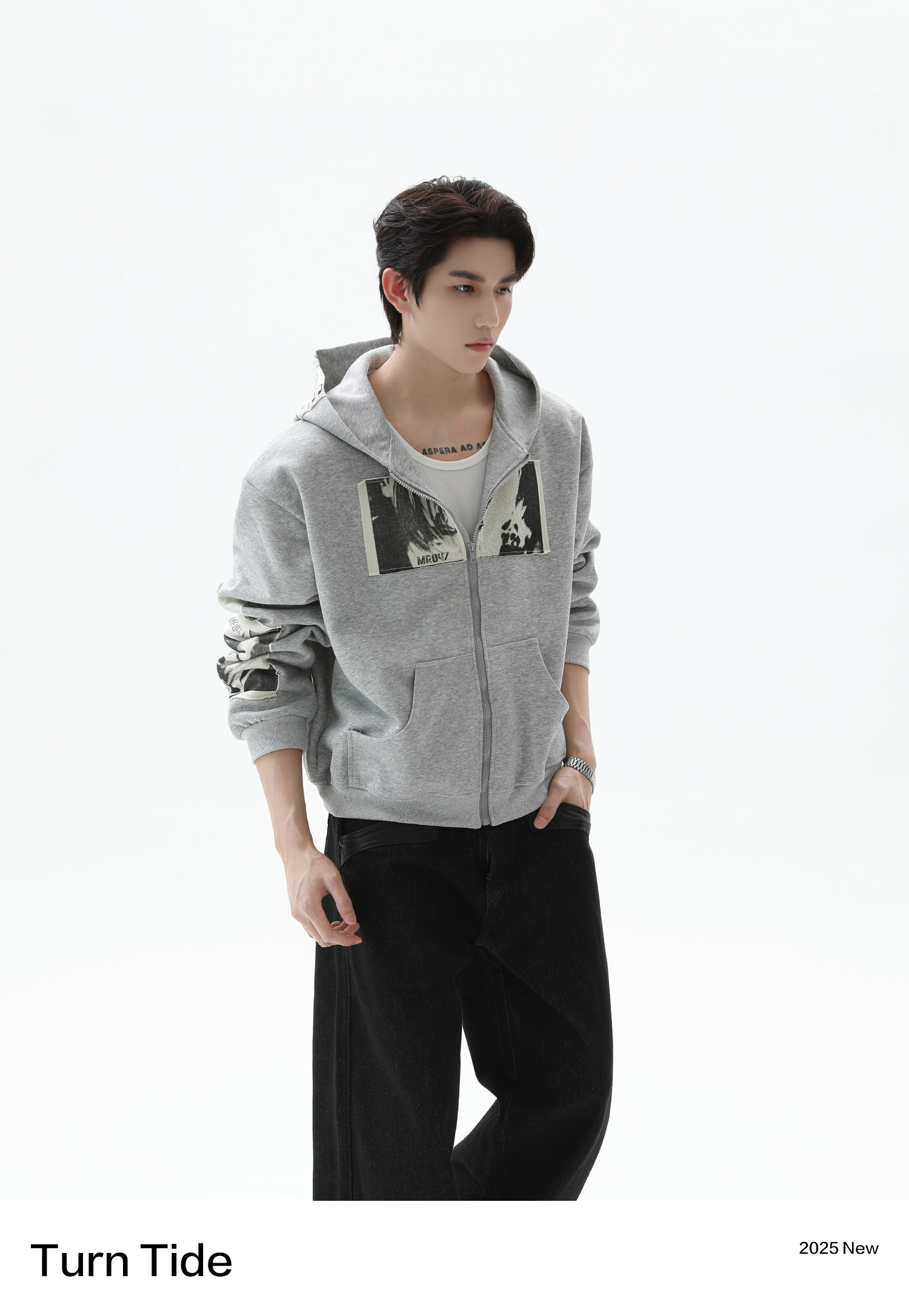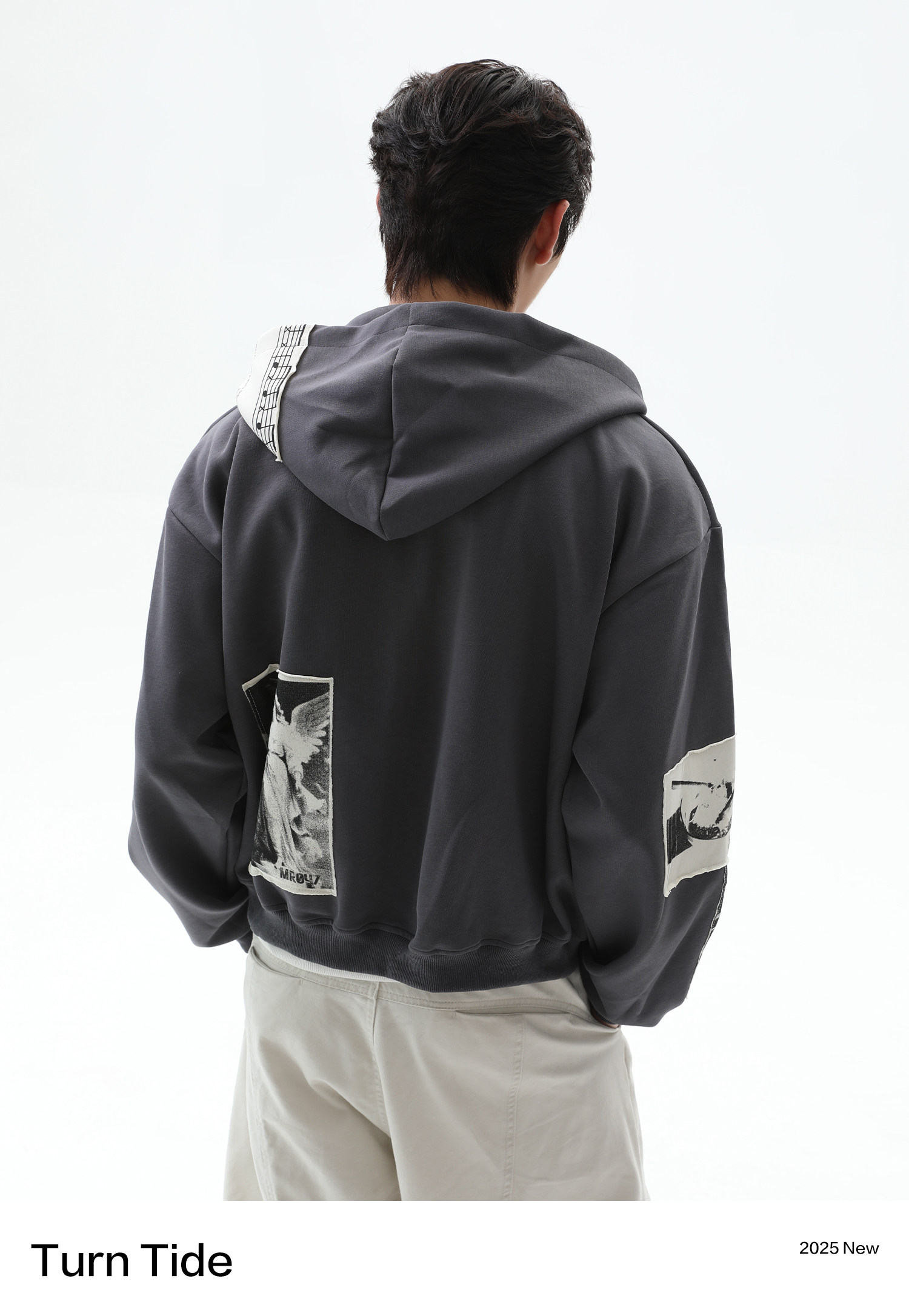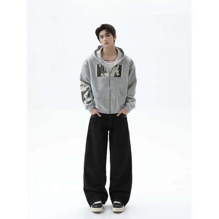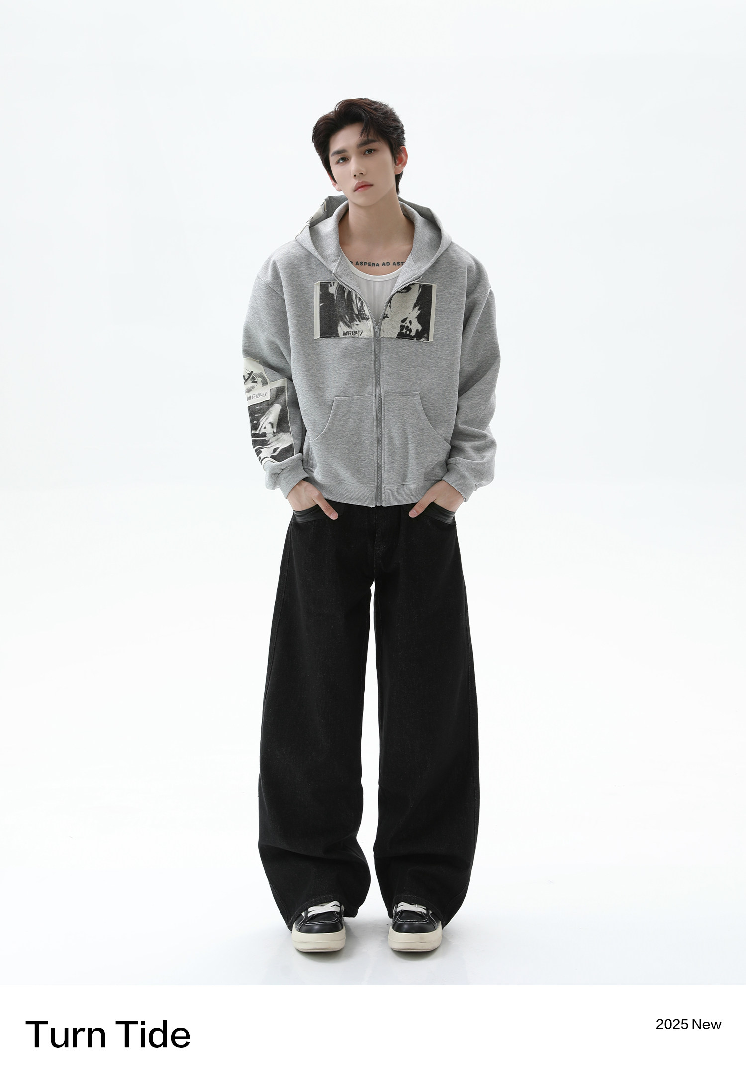 TURNTIDE 復古貼布印花連帽拉鍊衛衣男cleanfit休閒高級通勤外套