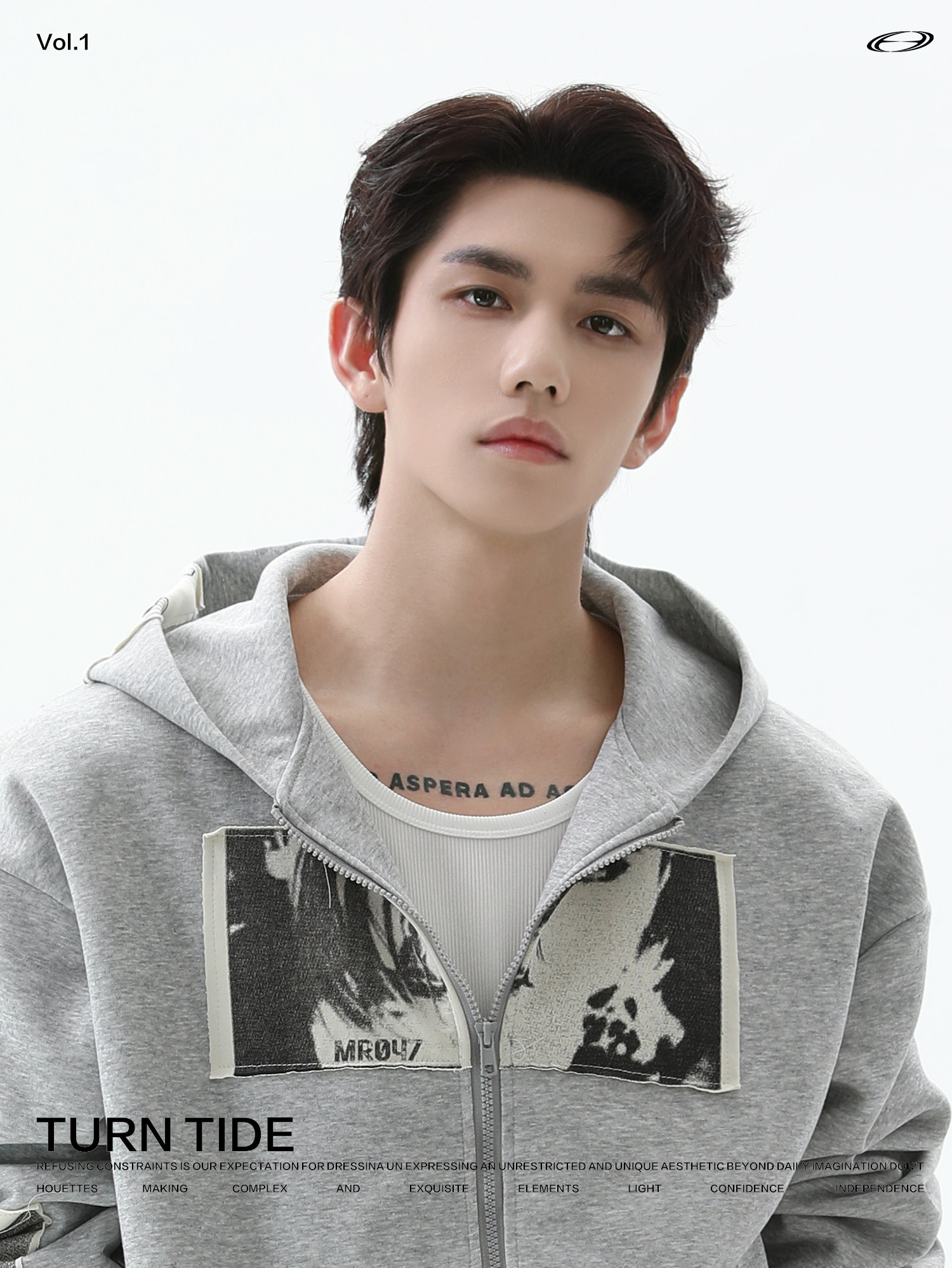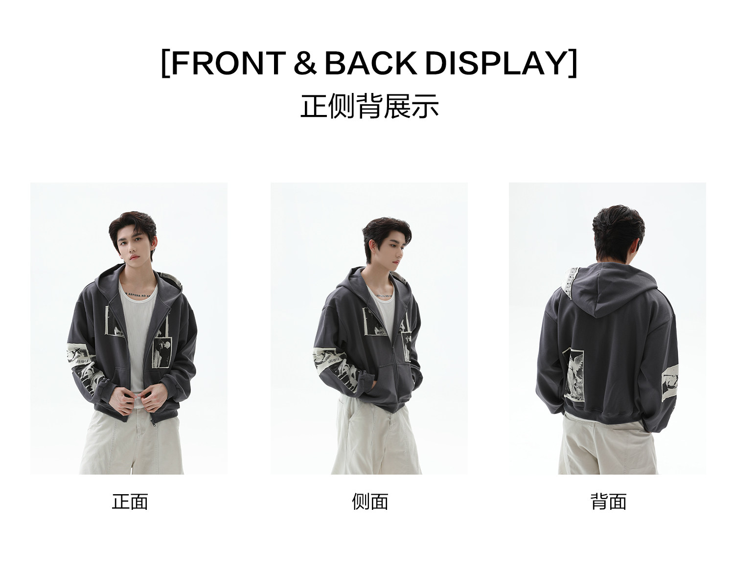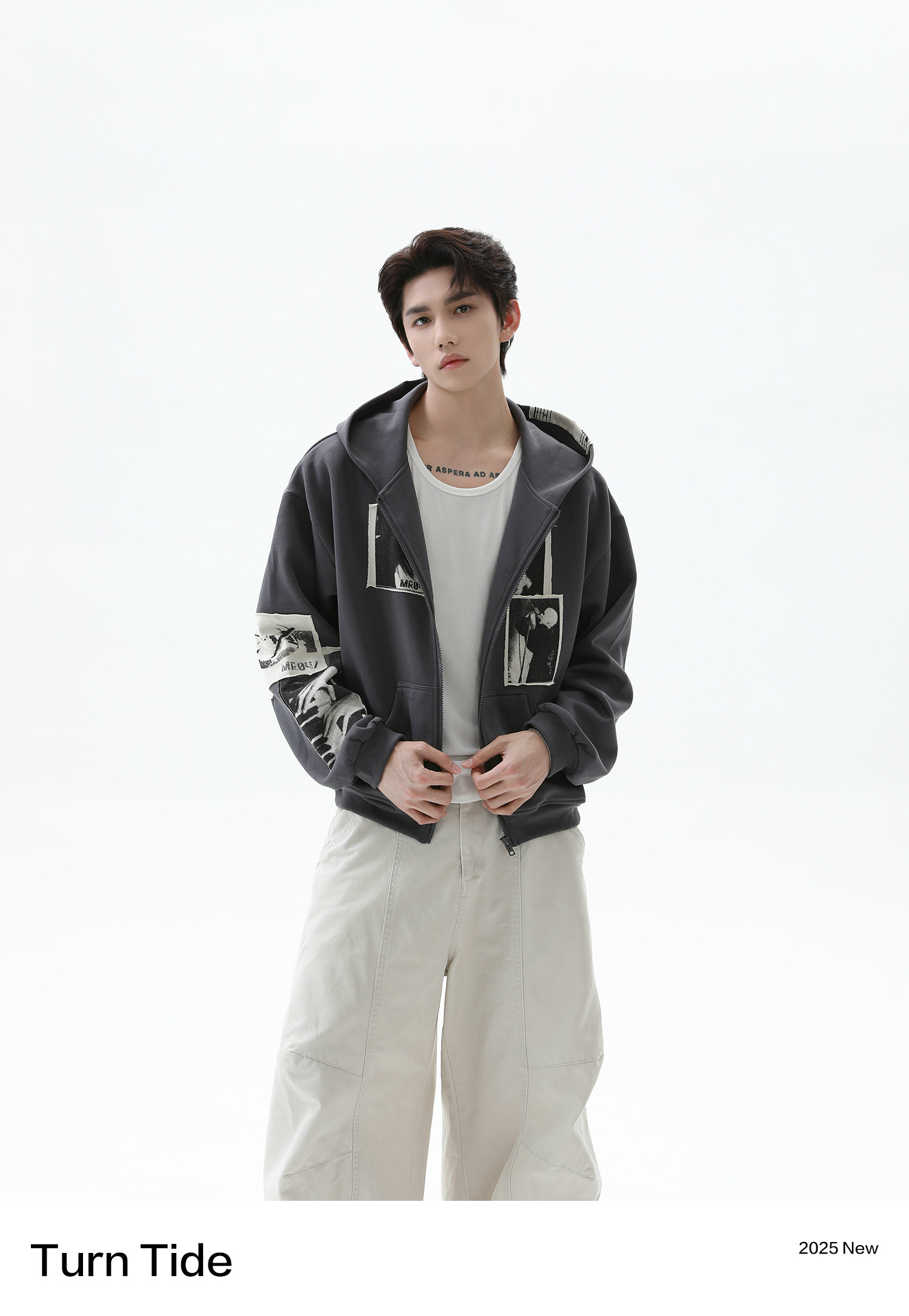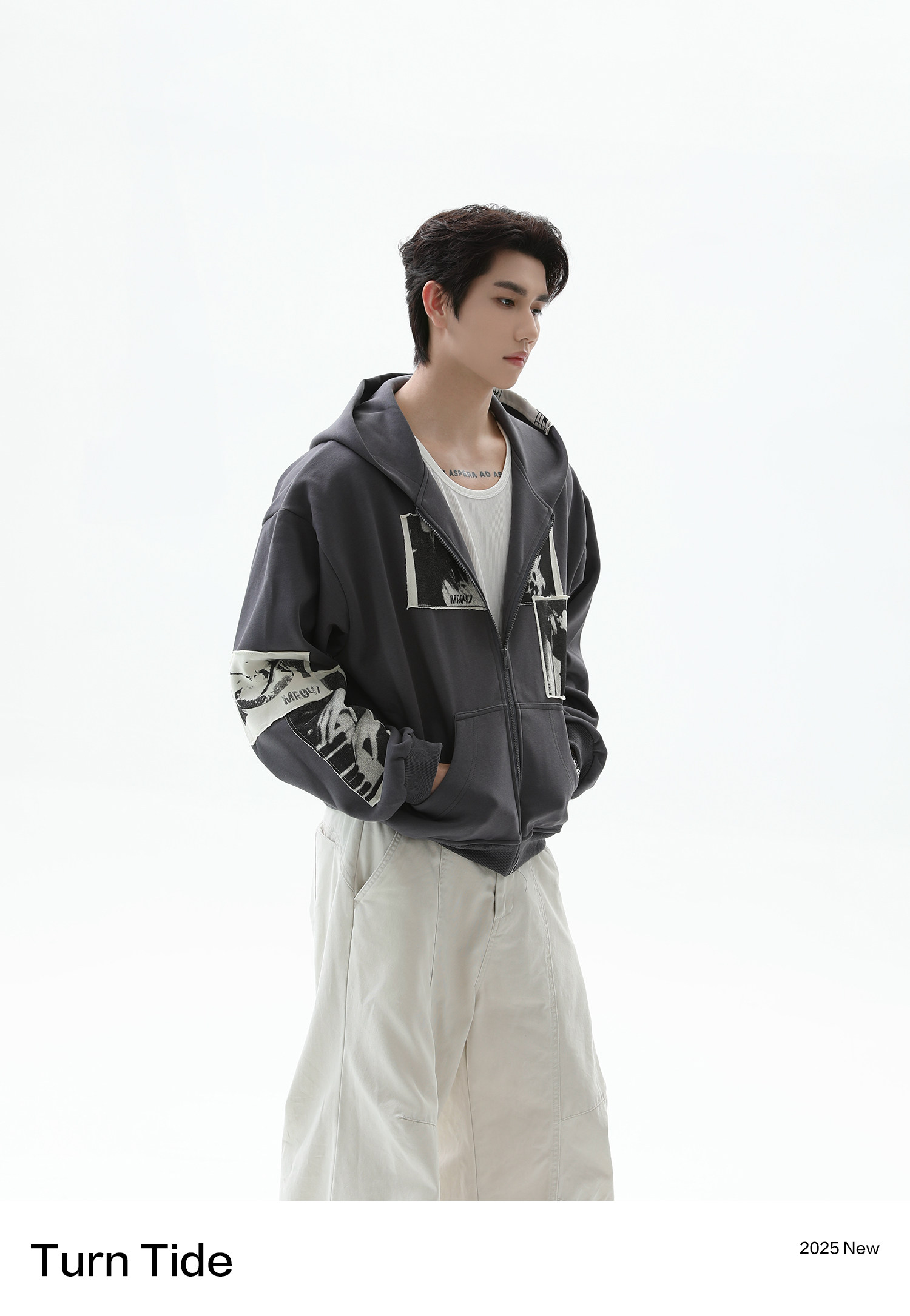 TURNTIDE 復古貼布印花連帽拉鍊衛衣男cleanfit休閒高級通勤外套