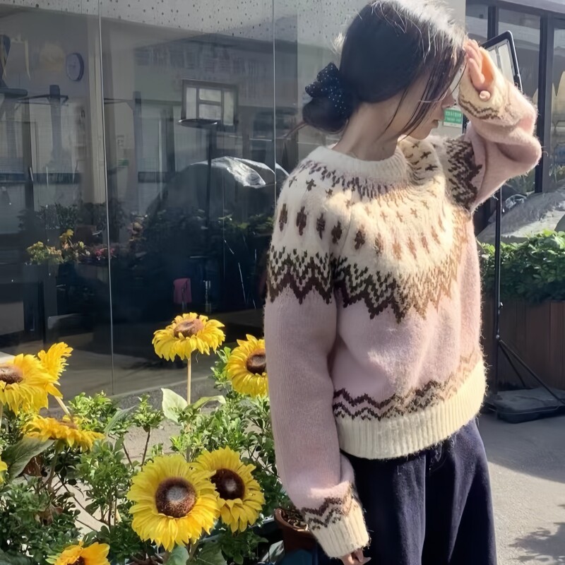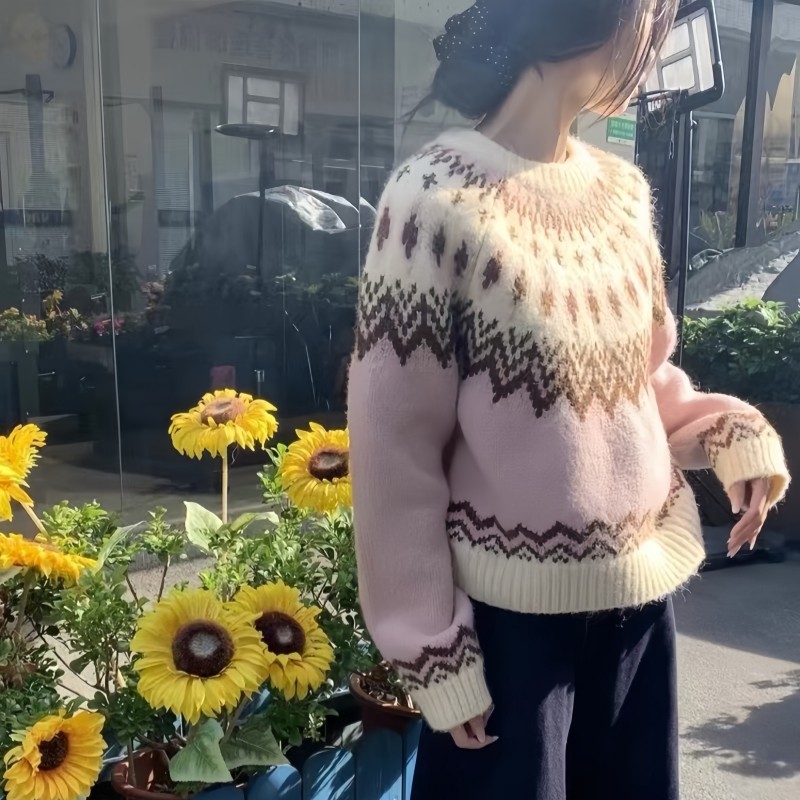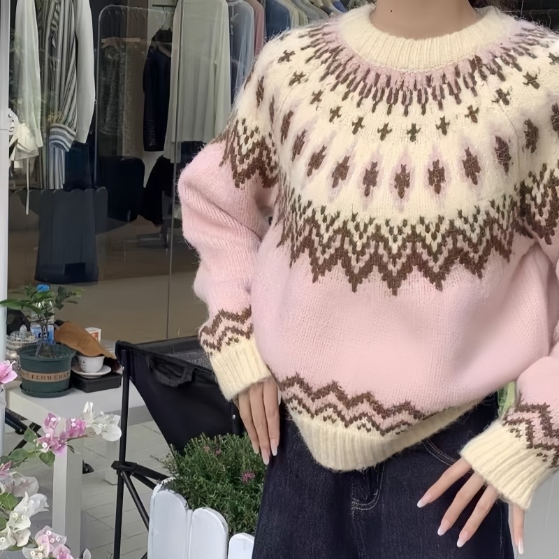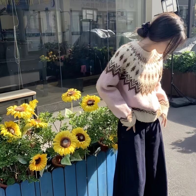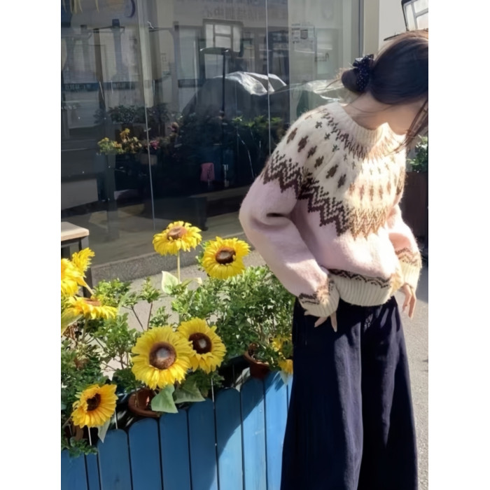 粉色費爾島奶呼呼軟糯毛衣女春秋寬松慵懶風設計感小衆套頭針織衫