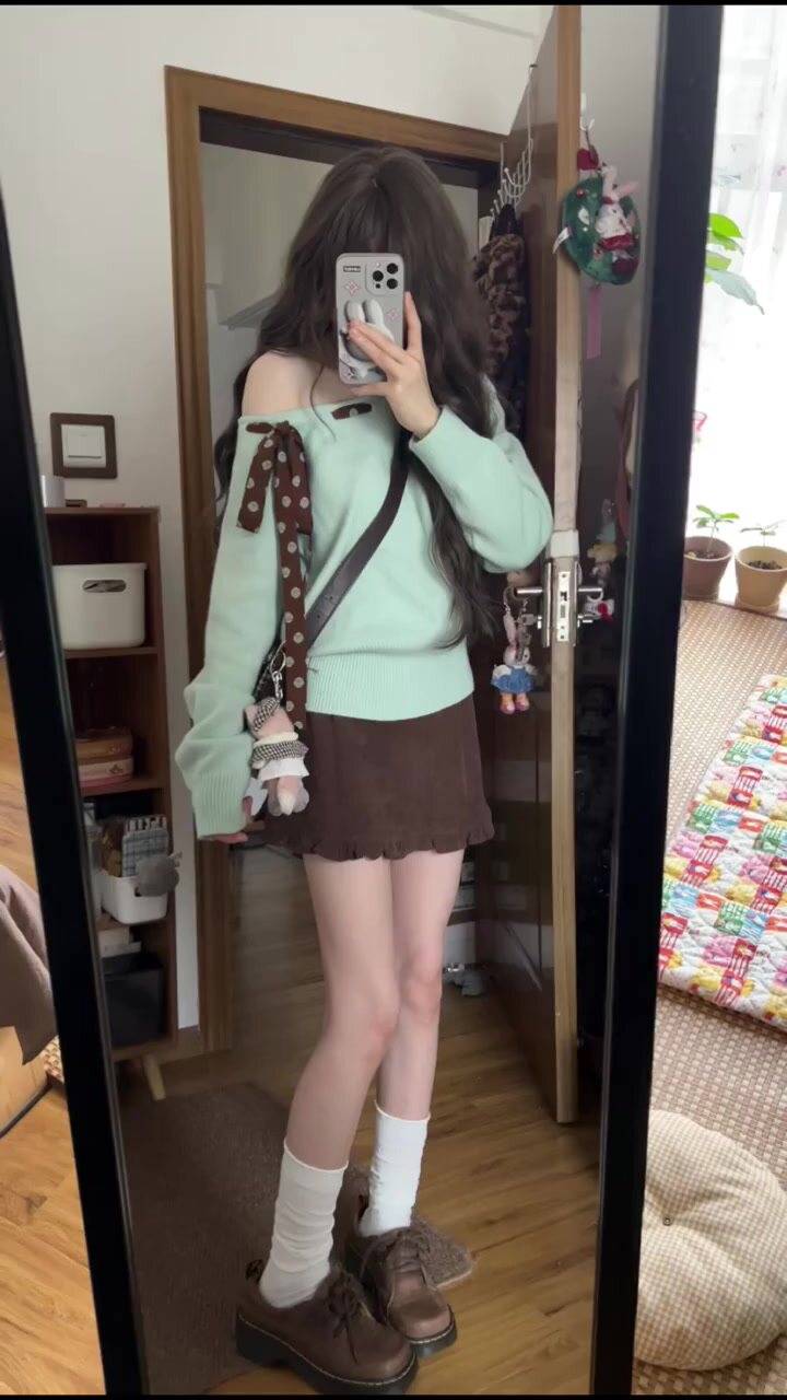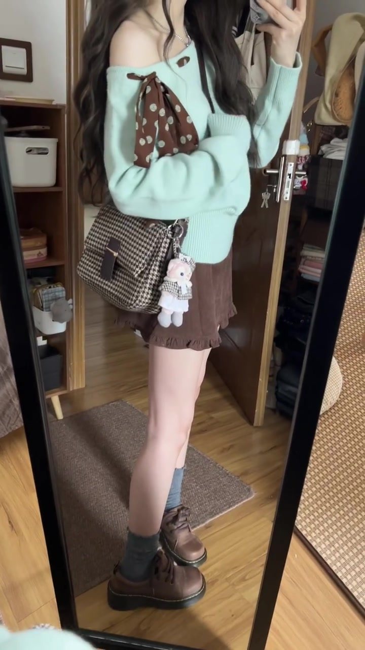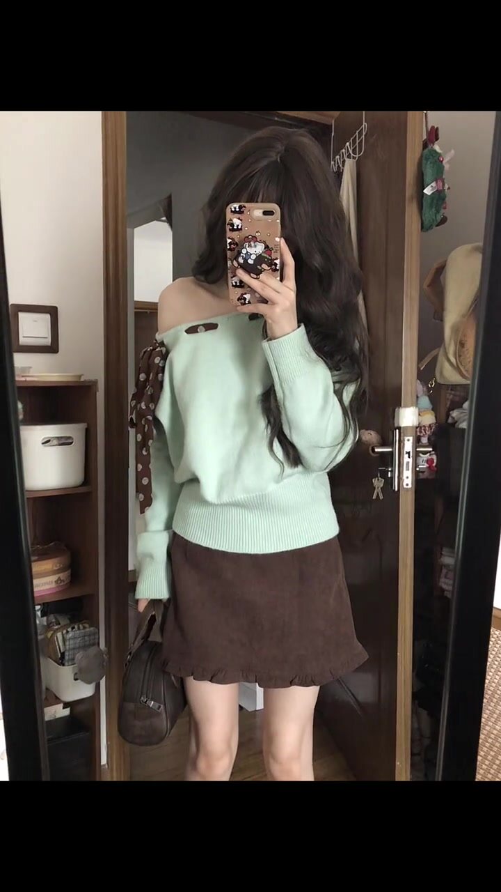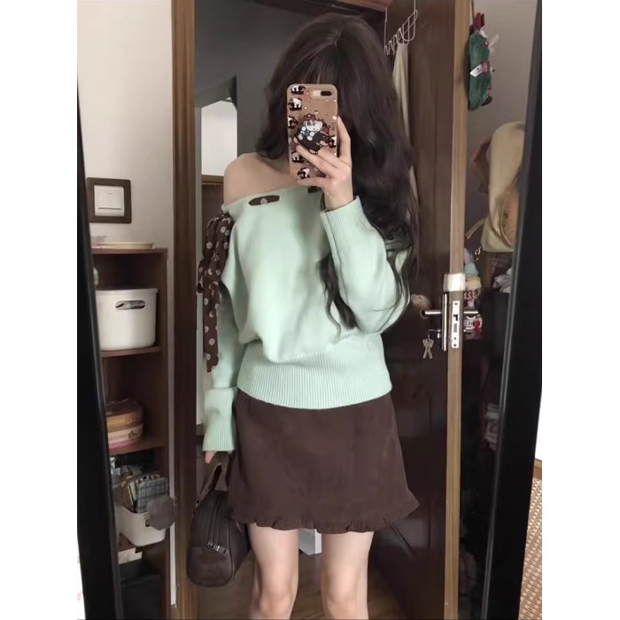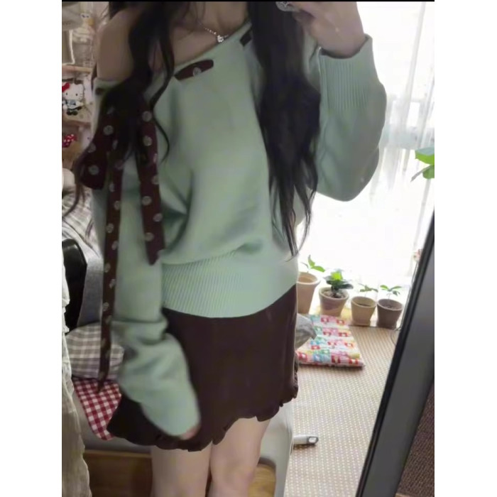奶綠一字肩波點綁帶毛衣女2025新款秋季設計感露肩長袖針織衫上衣