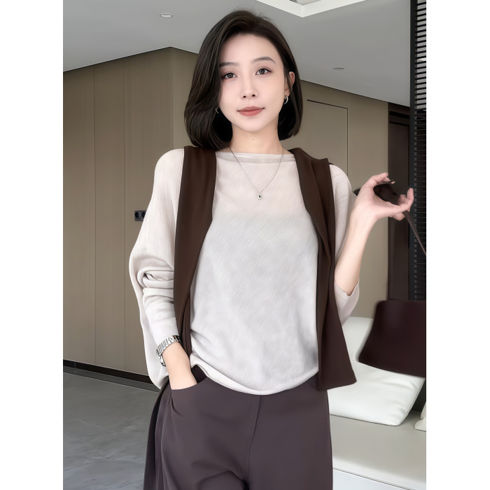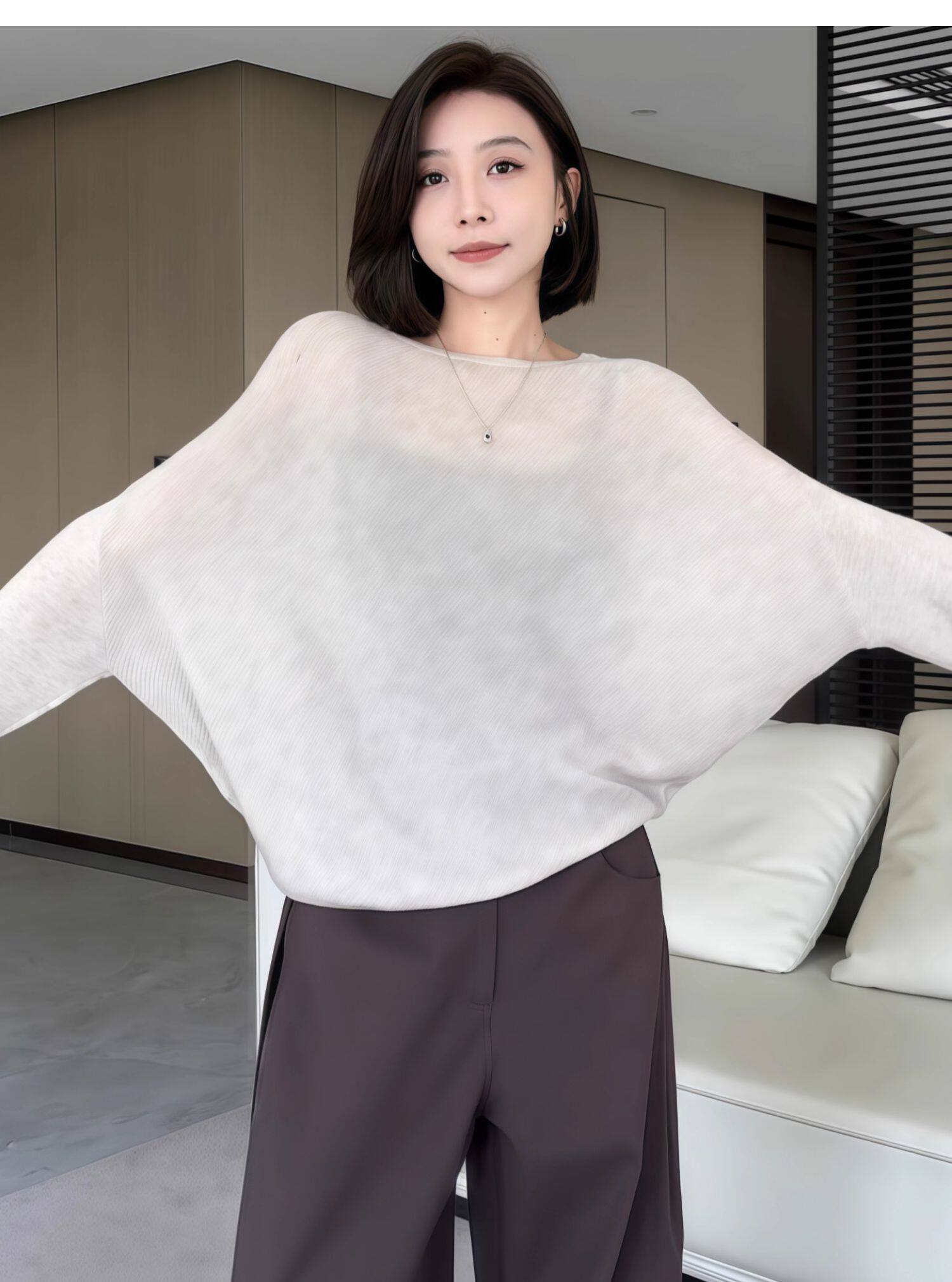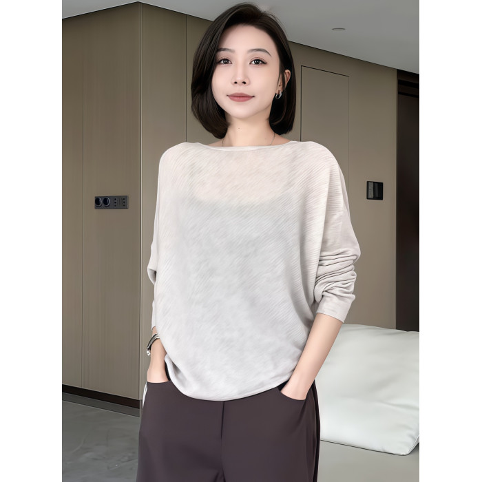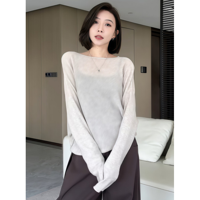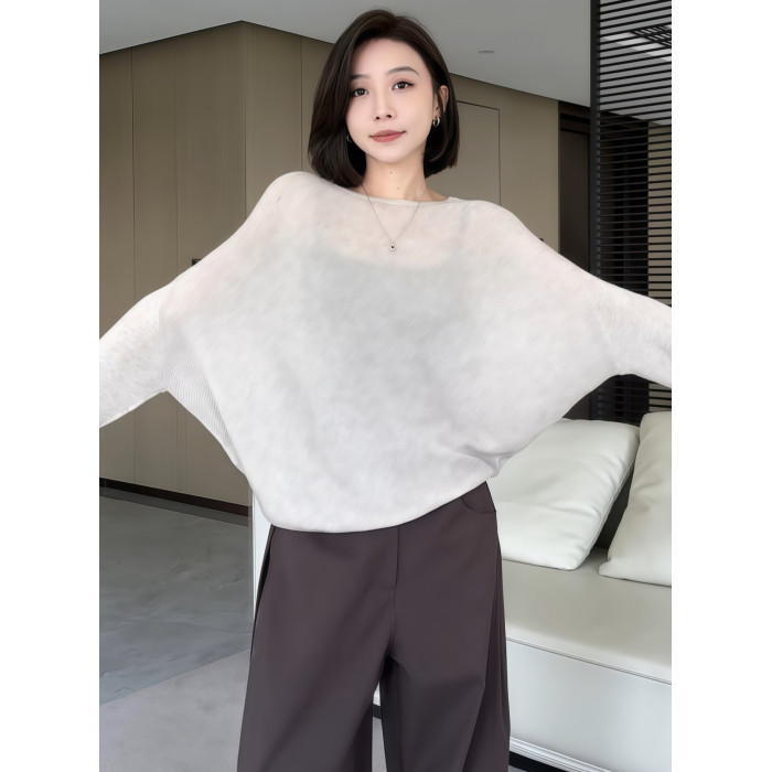 蝙蝠袖一字領針織衫女早秋薄款2025新款慵懶松弛感長袖微透感上衣