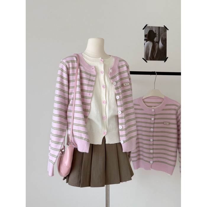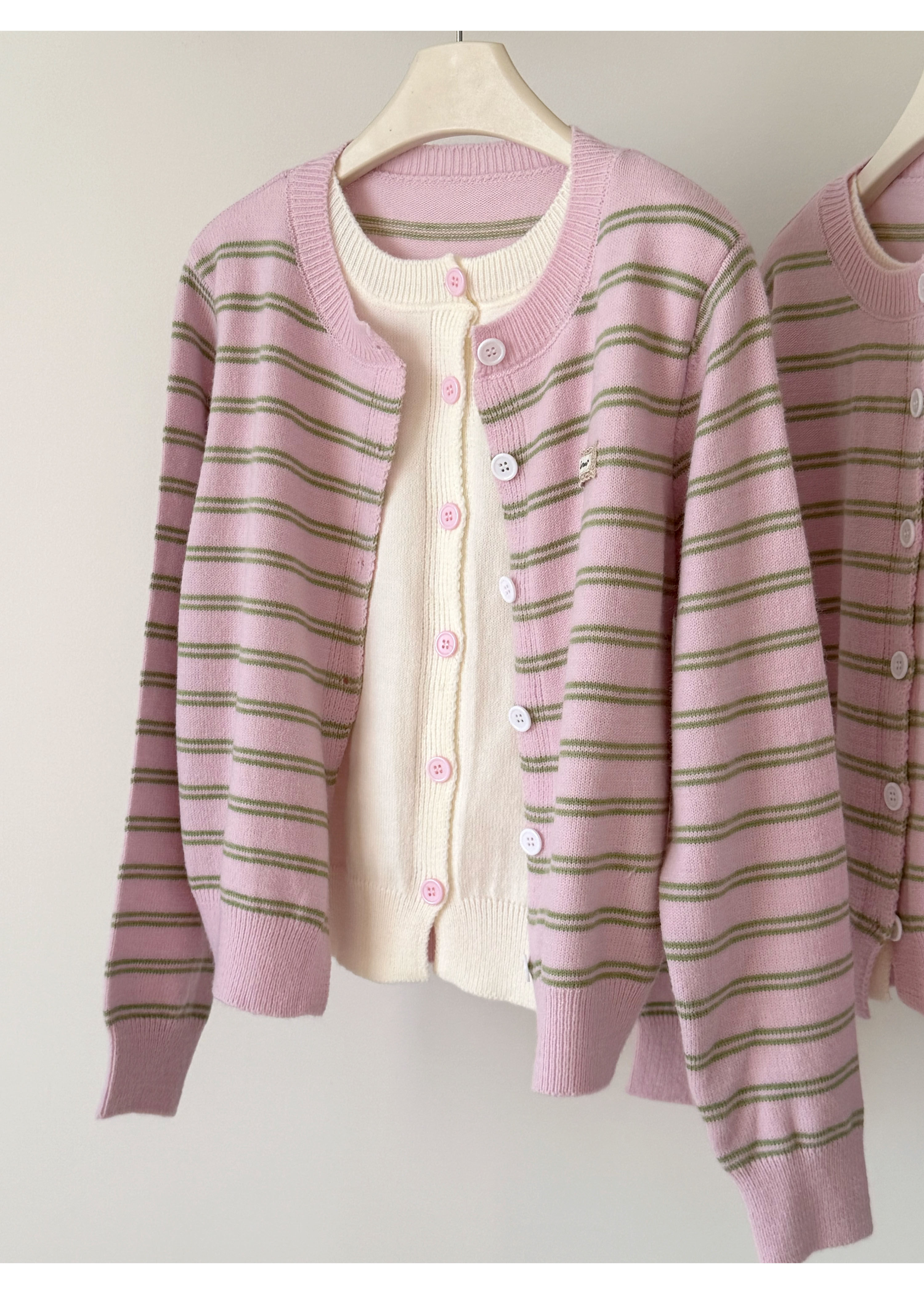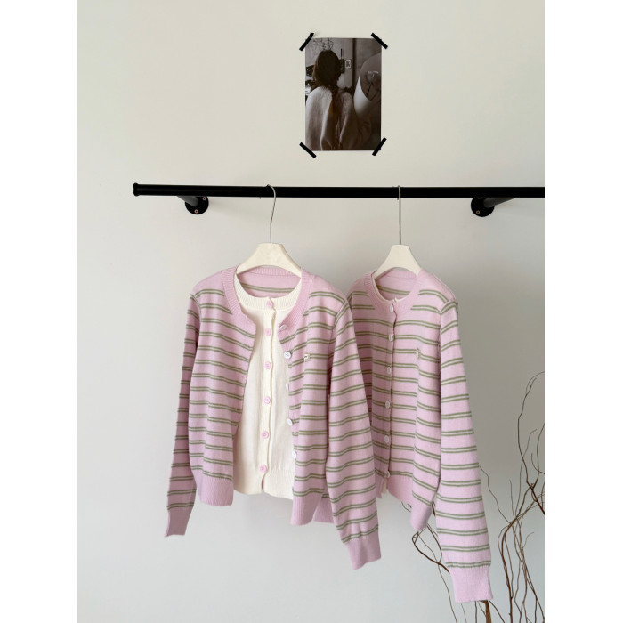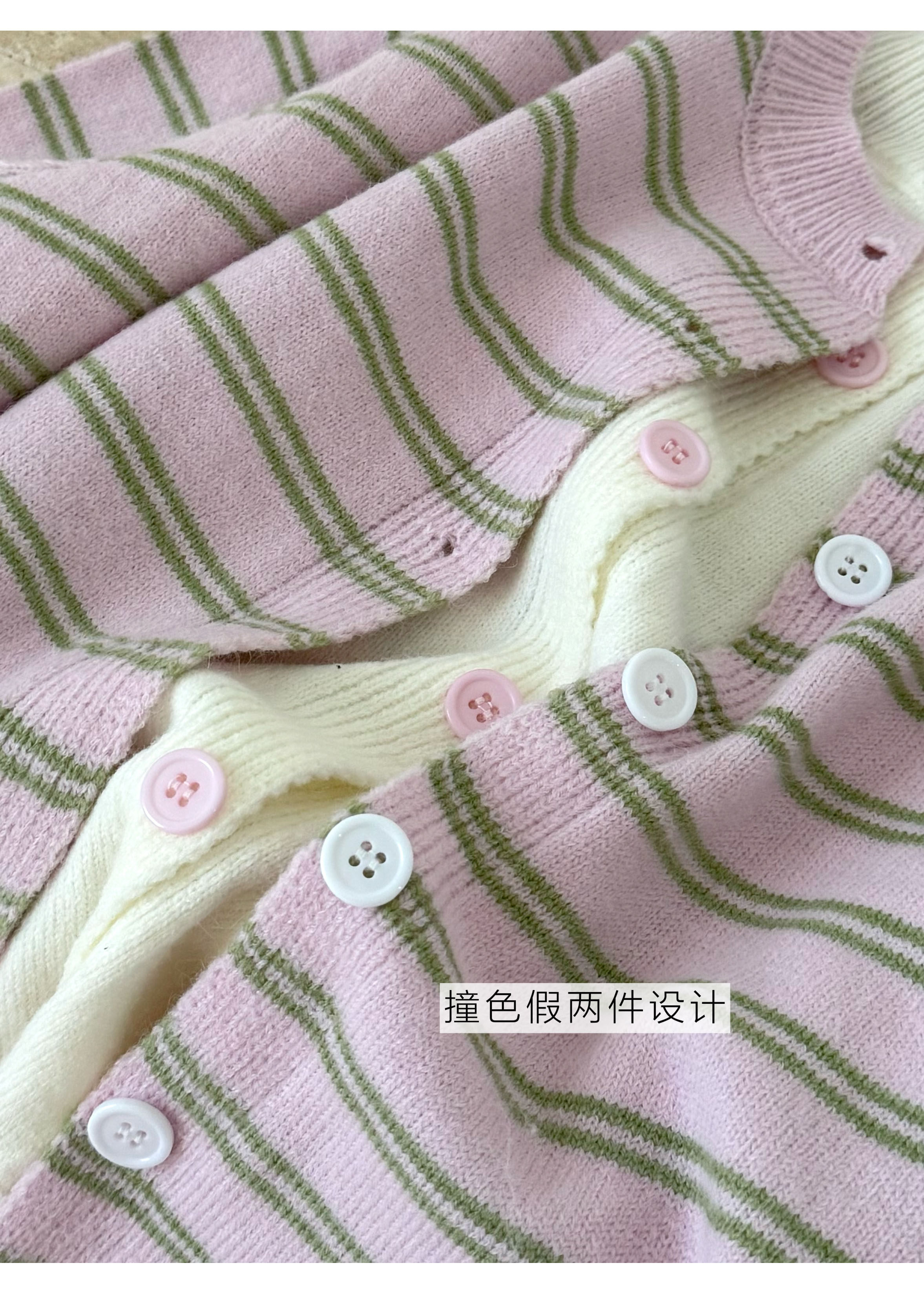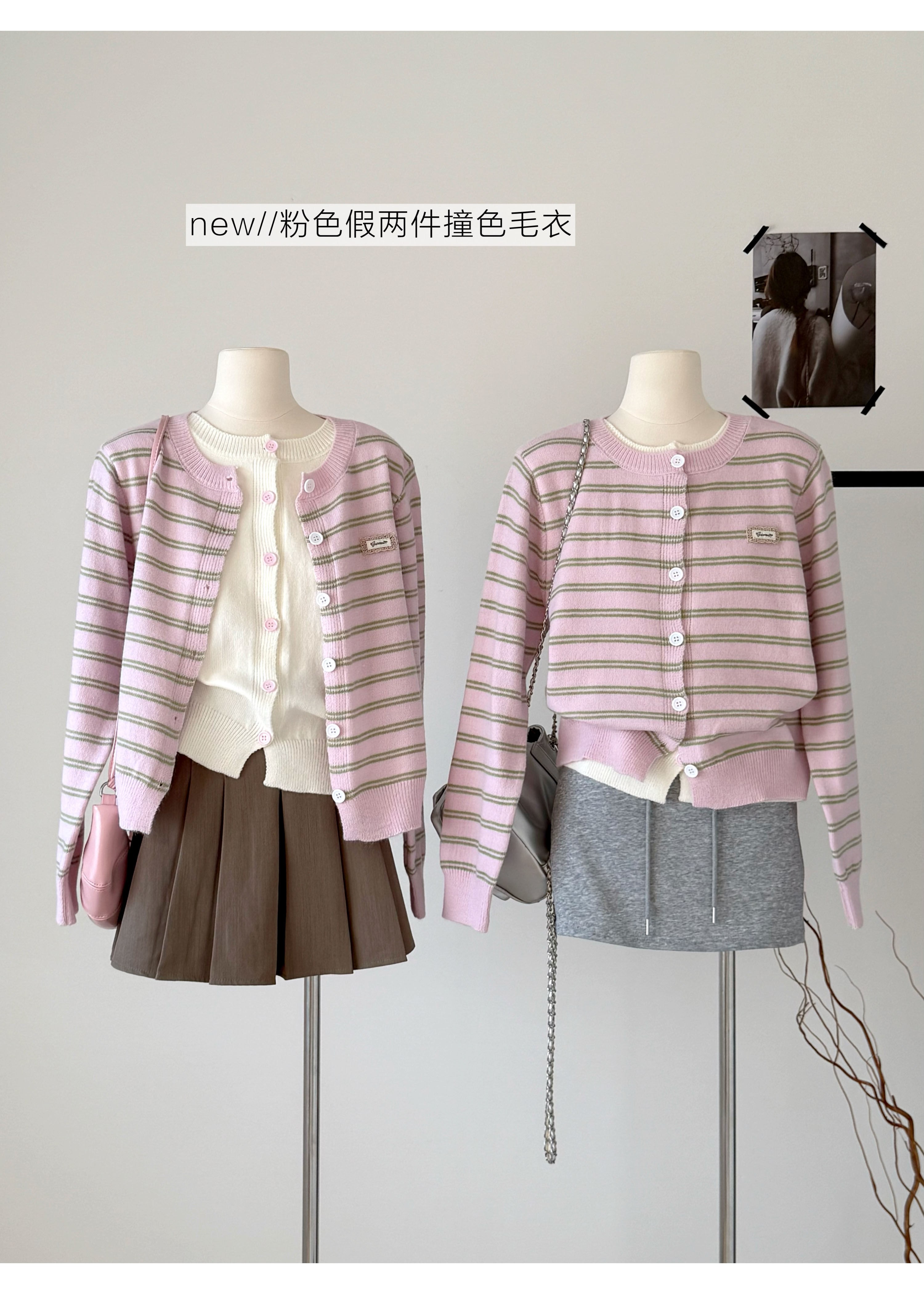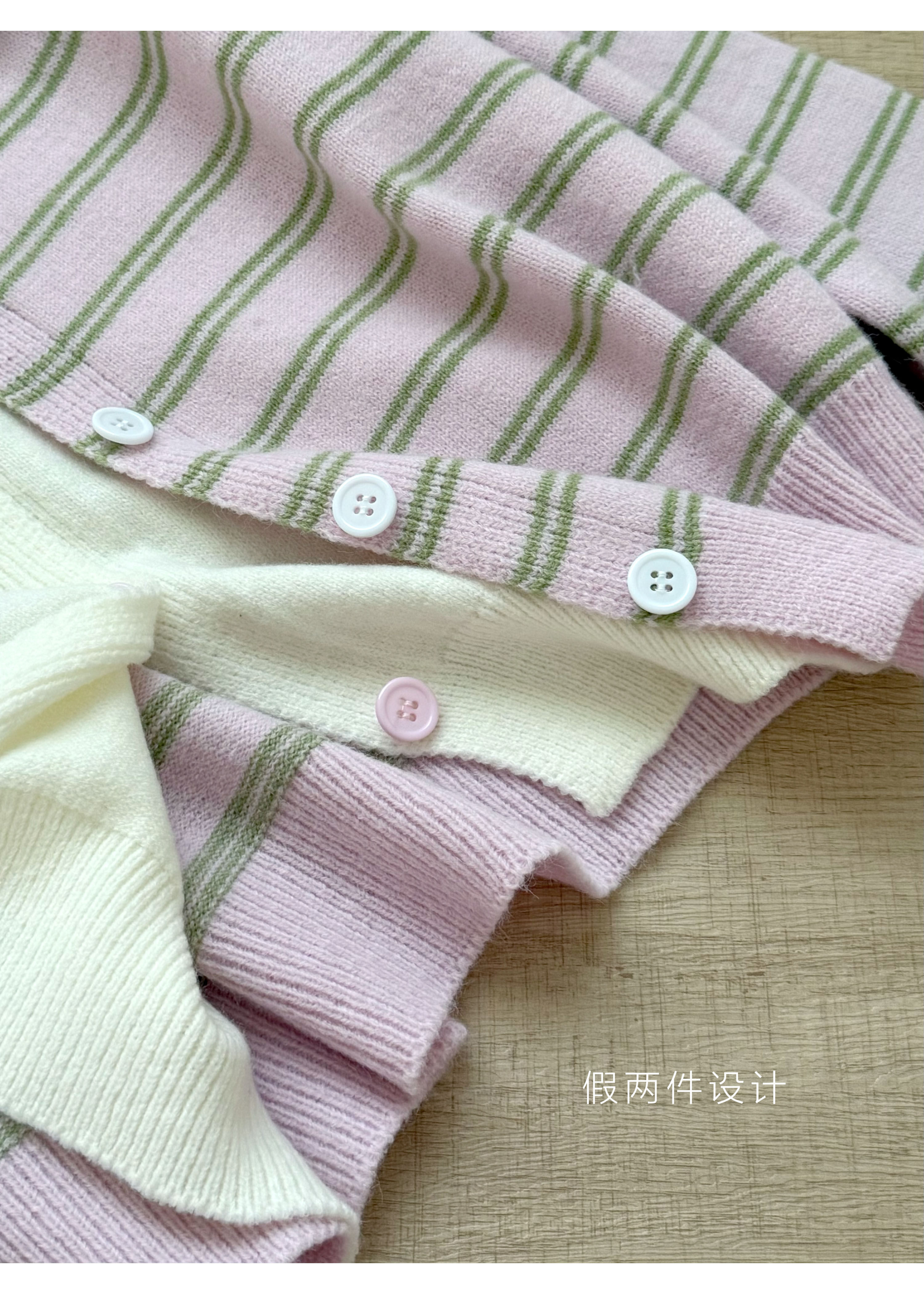 RENA韓系粉色條紋假兩件針織開衫女秋冬毛衣外套早秋穿搭上衣