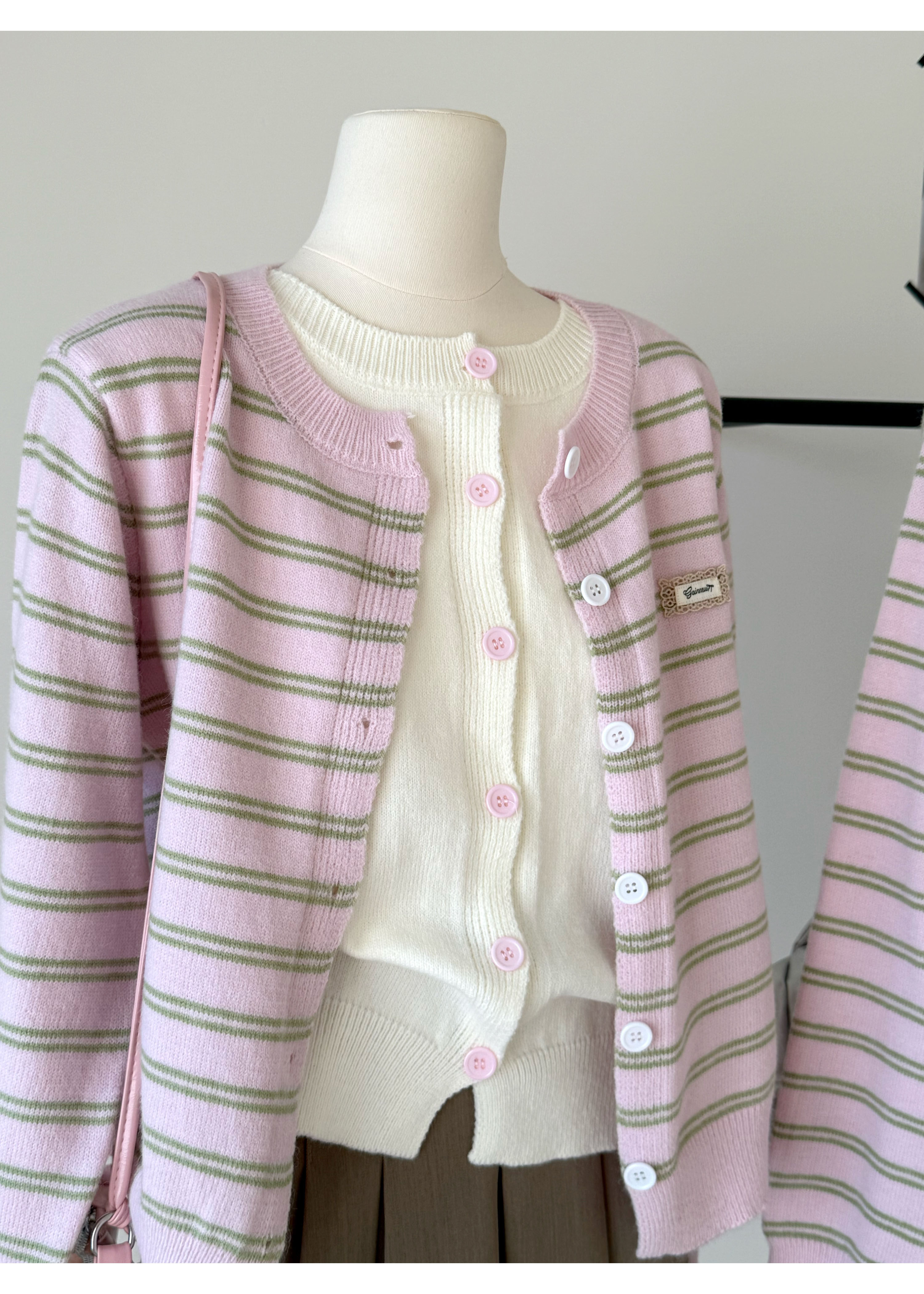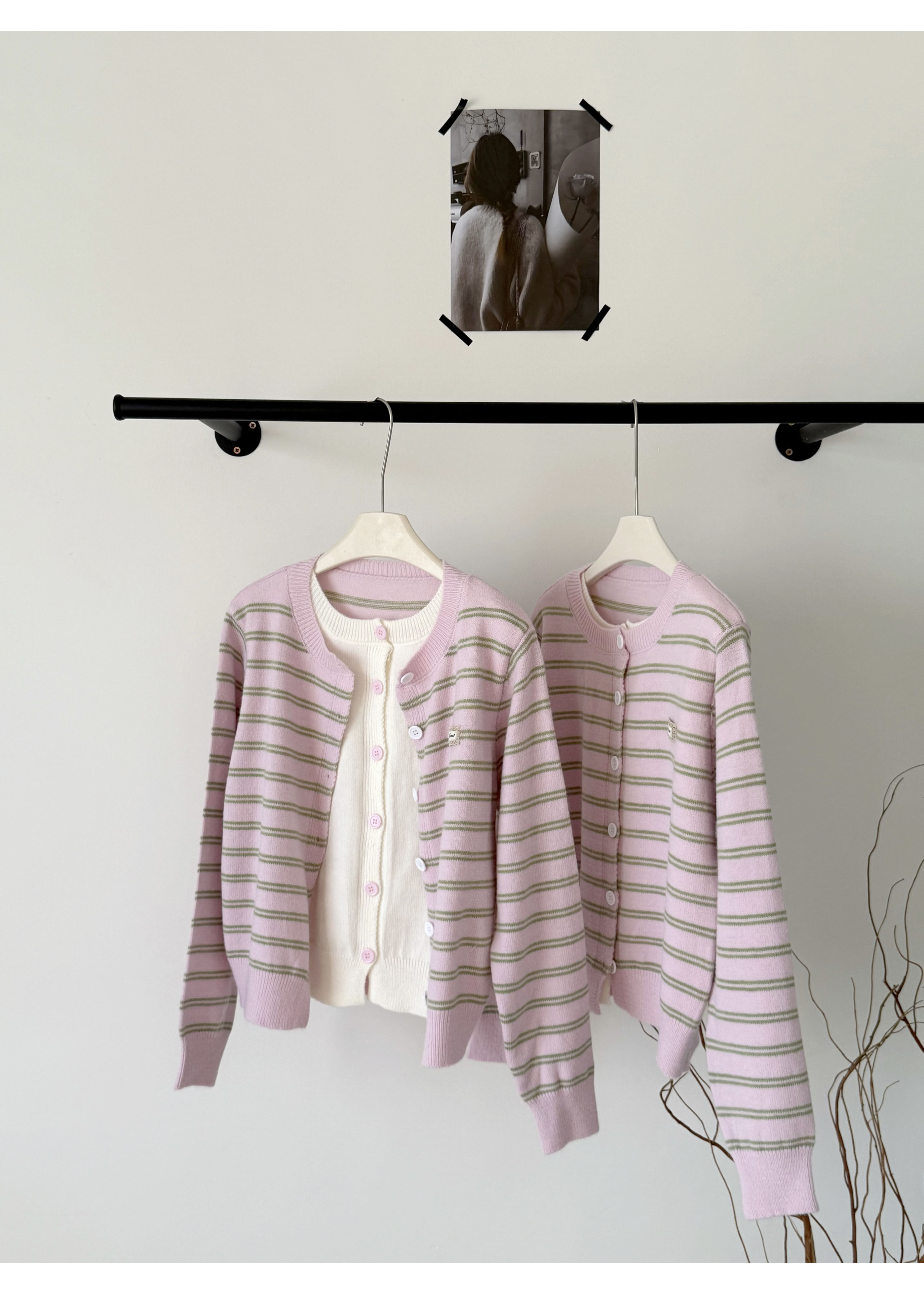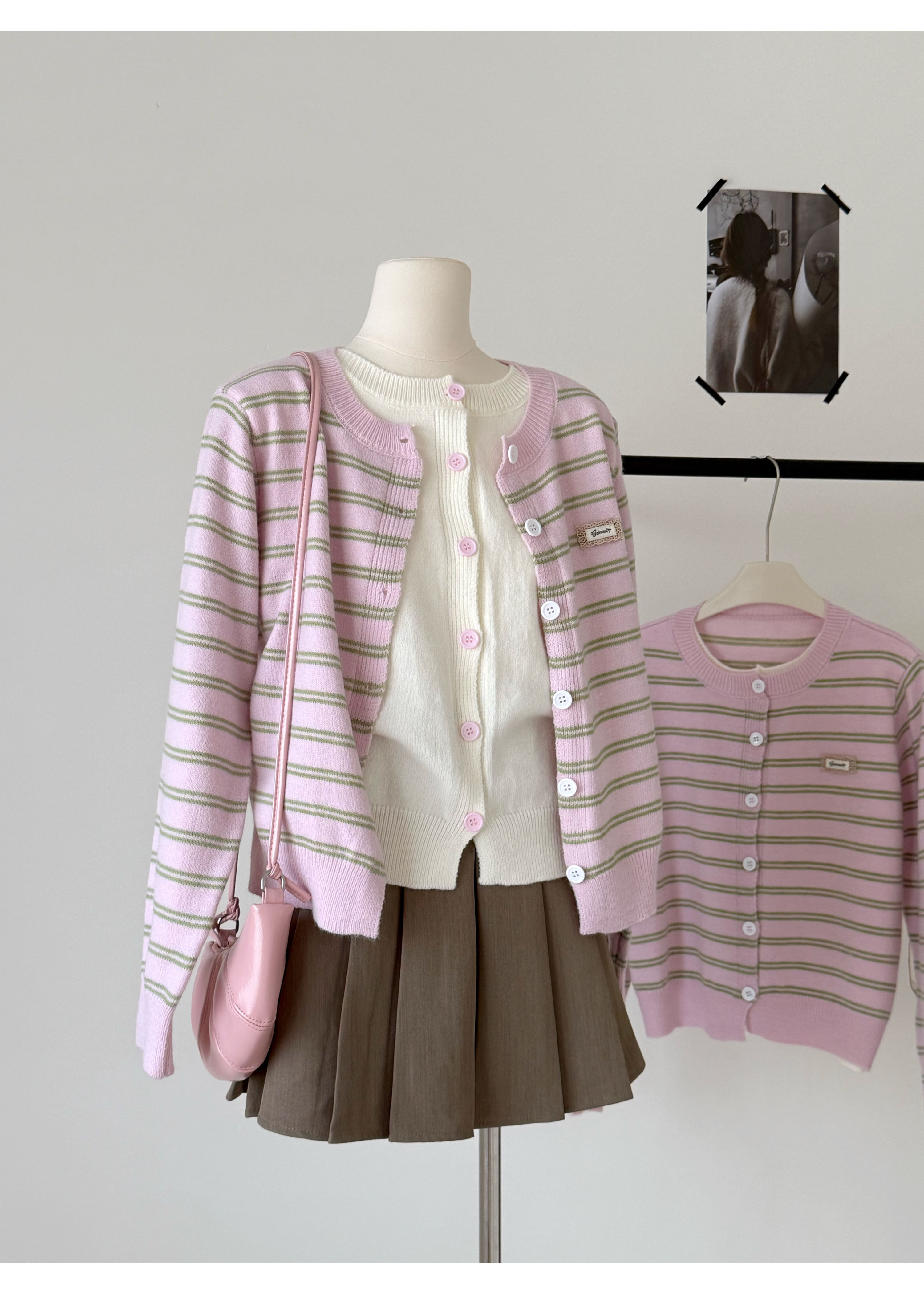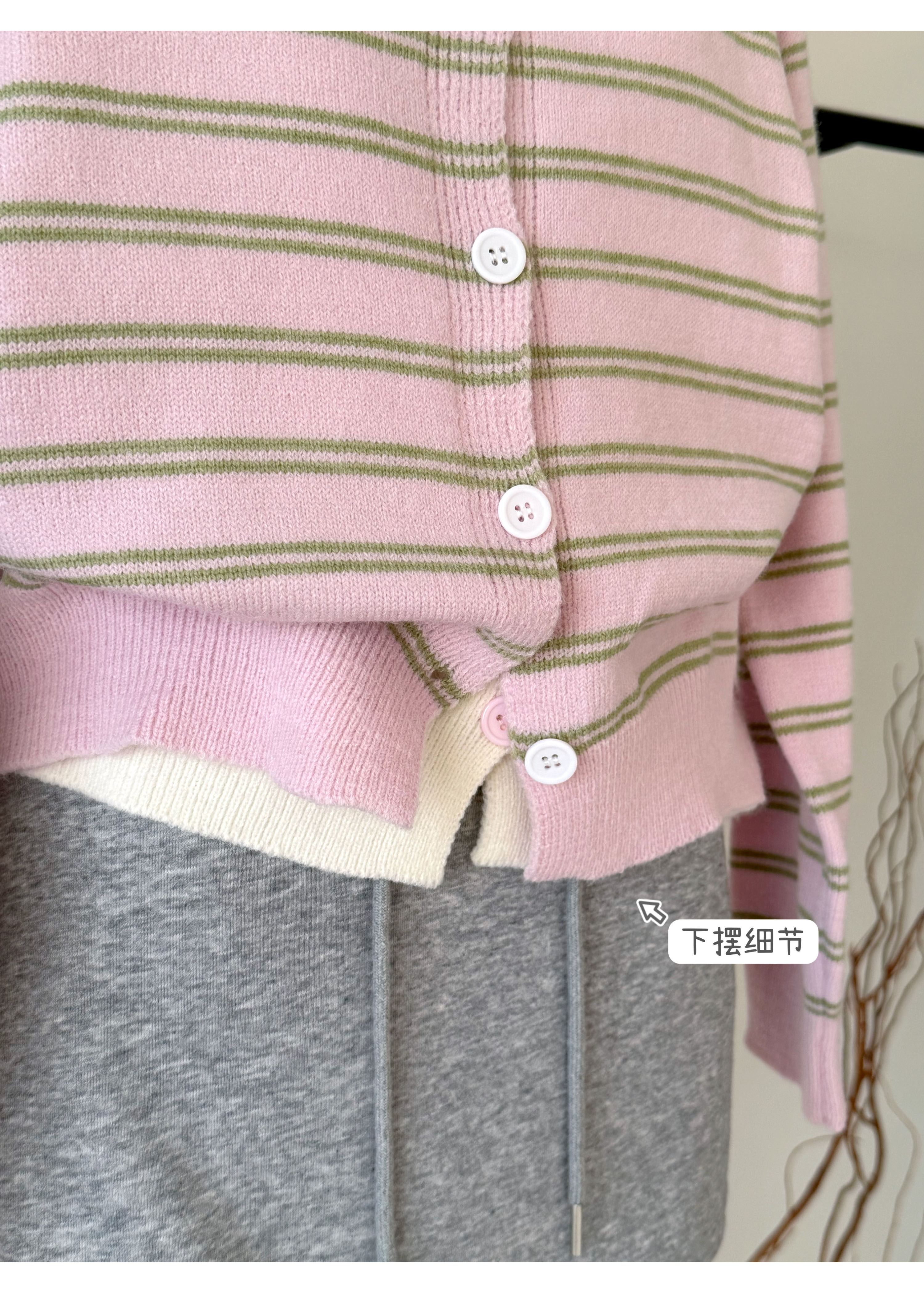 RENA韓系粉色條紋假兩件針織開衫女秋冬毛衣外套早秋穿搭上衣