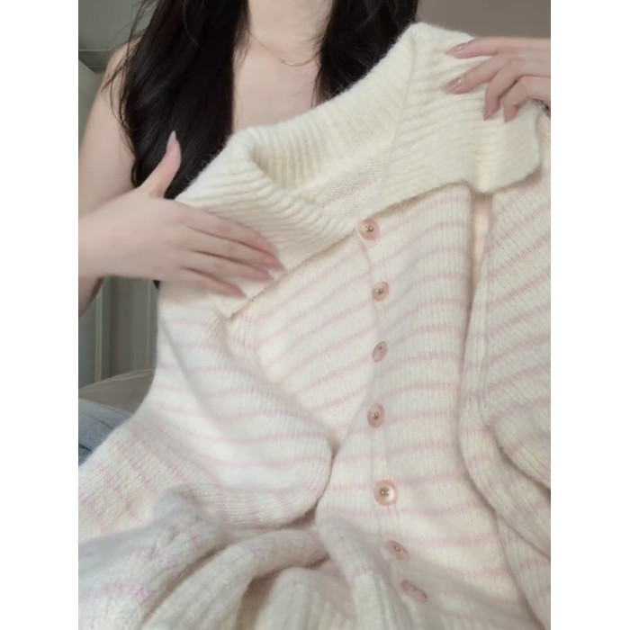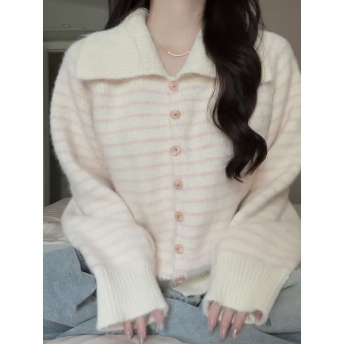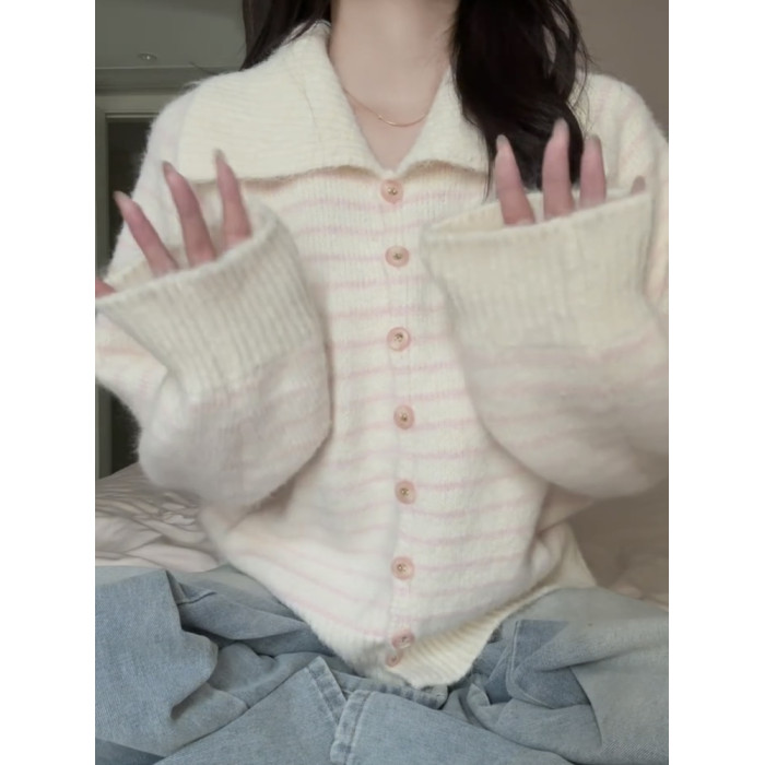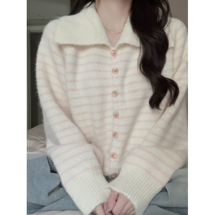 日系甜美粉色條紋2025秋季針織毛衣外套女寬松顯瘦小個子翻領開衫