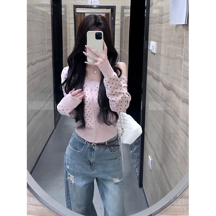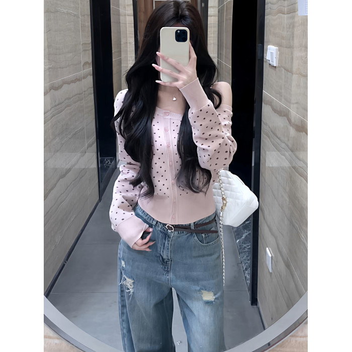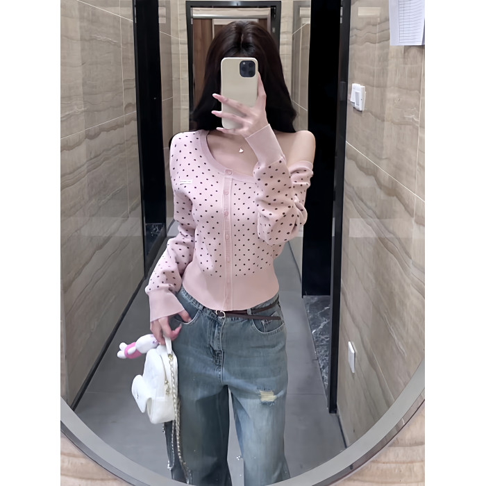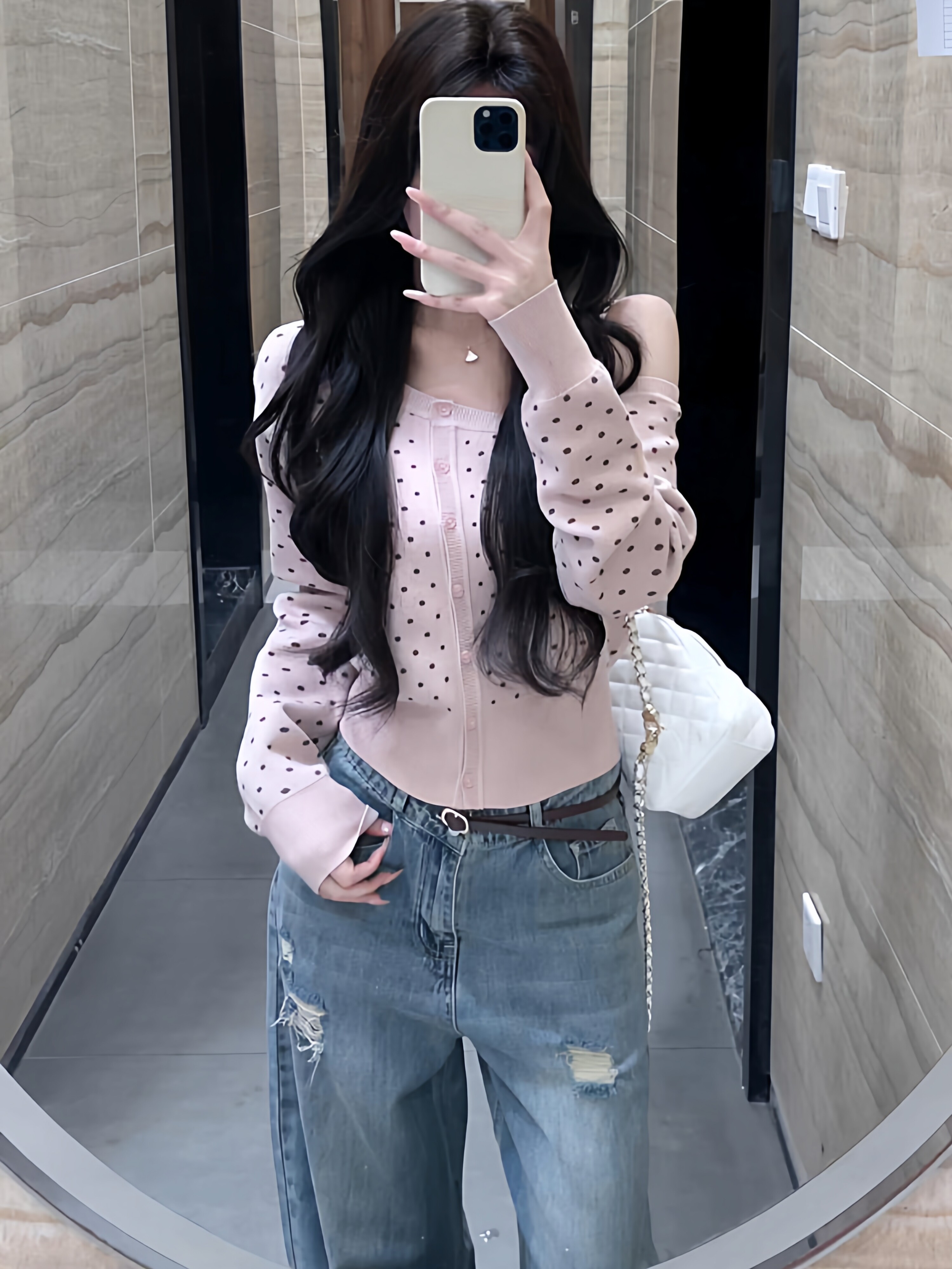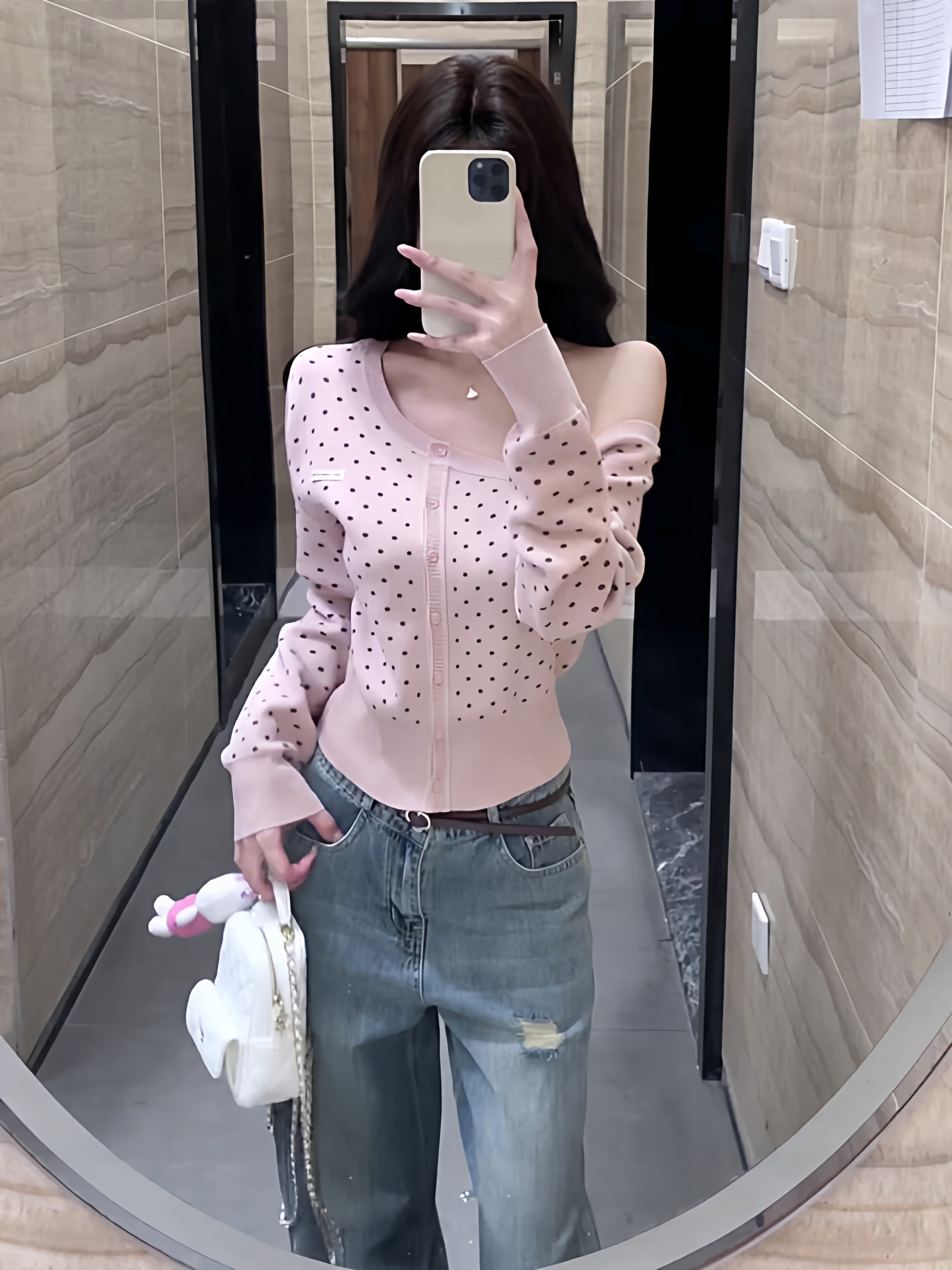 粉色波點斜肩針織開衫女早秋季新款毛衣韓系甜辣修身顯瘦外套上衣