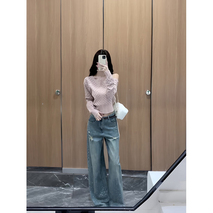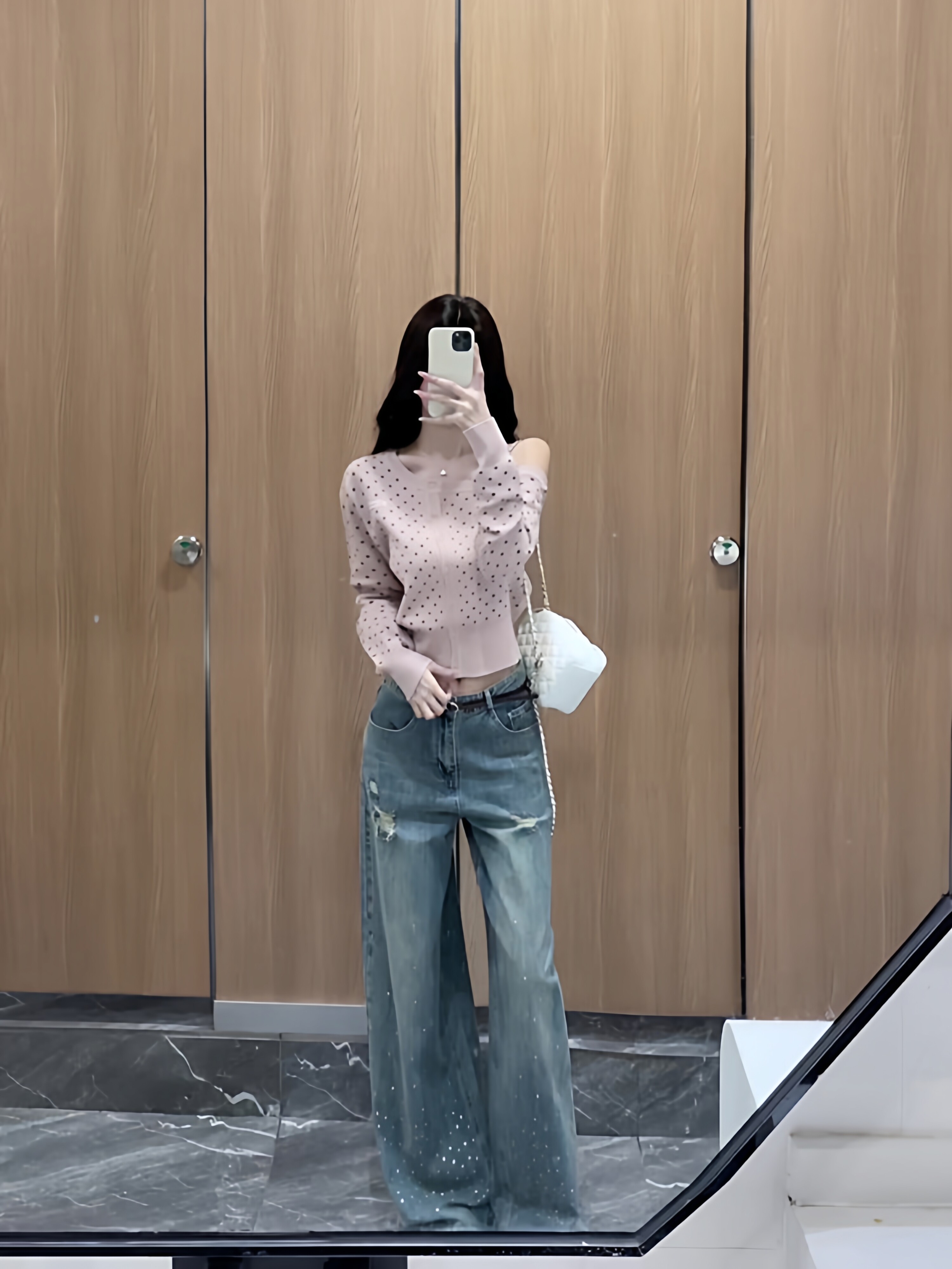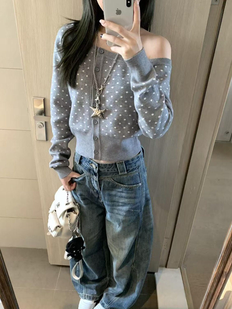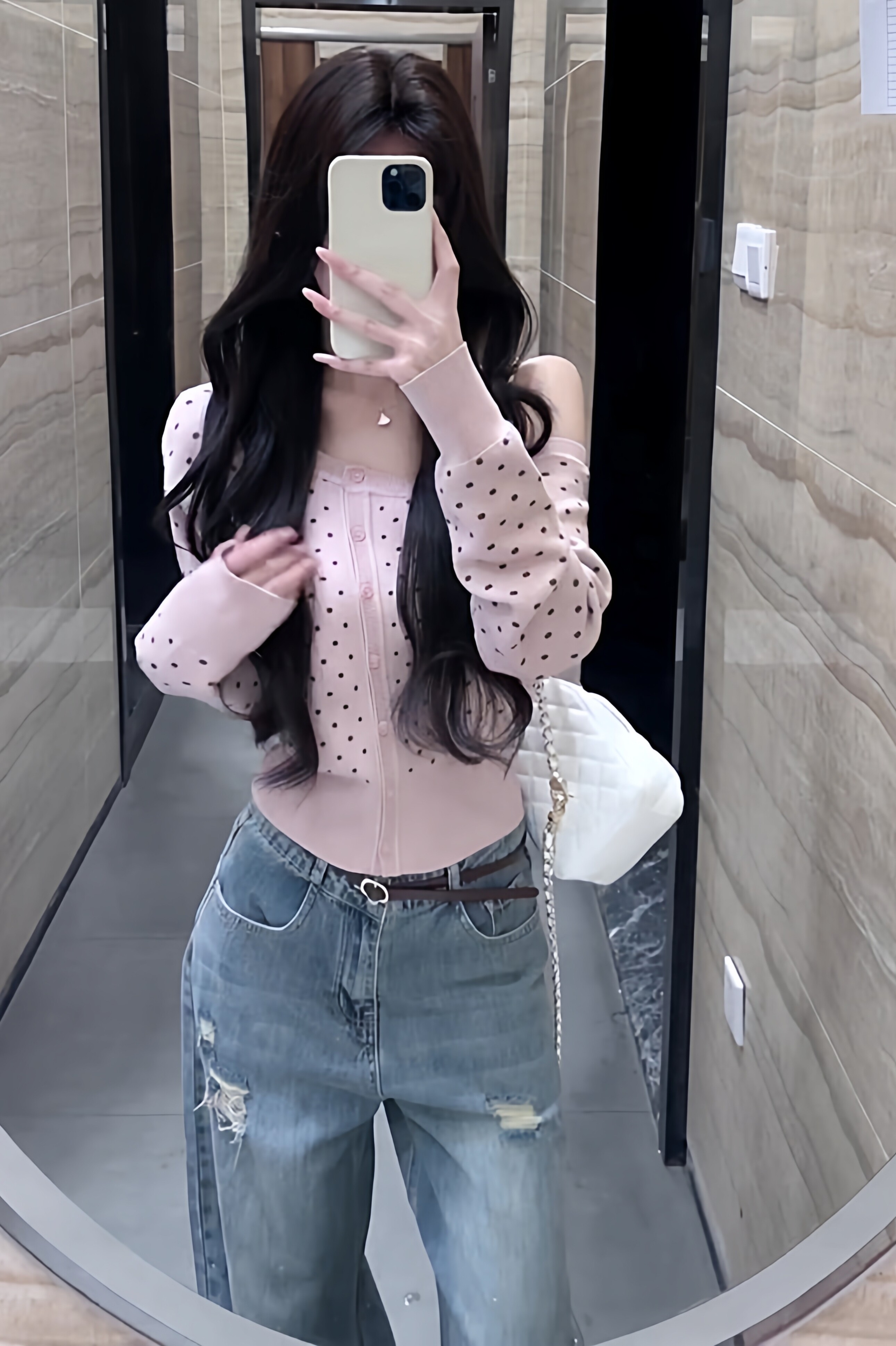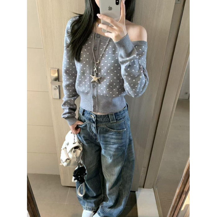 粉色波點斜肩針織開衫女早秋季新款毛衣韓系甜辣修身顯瘦外套上衣