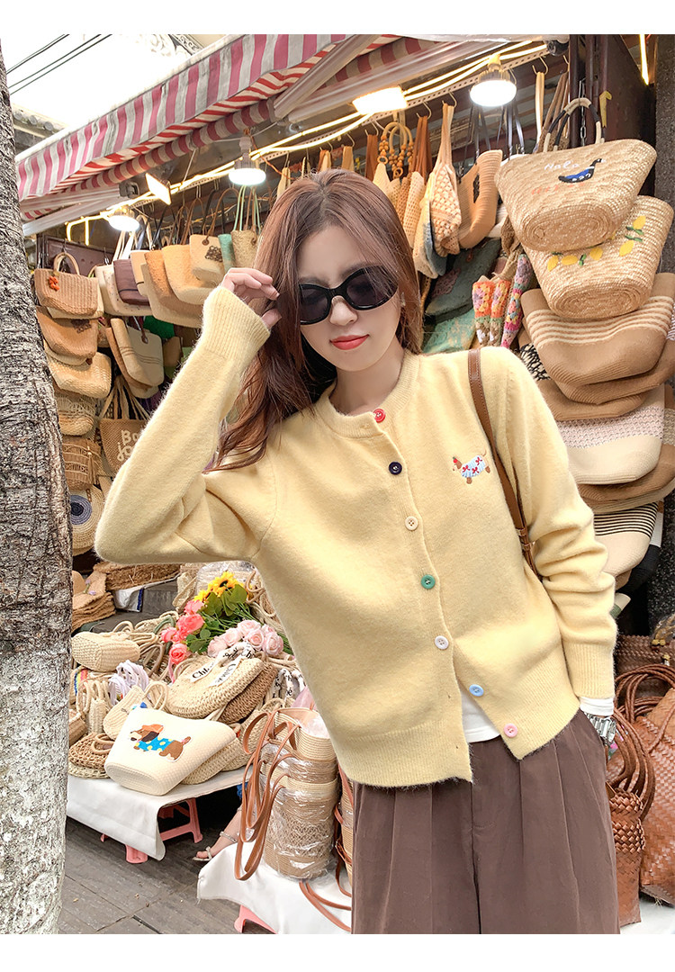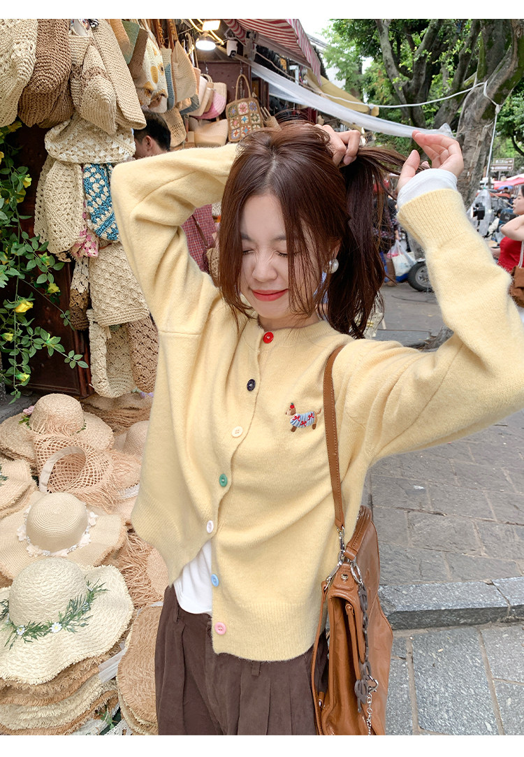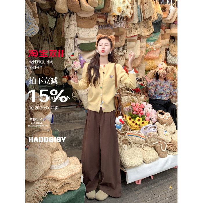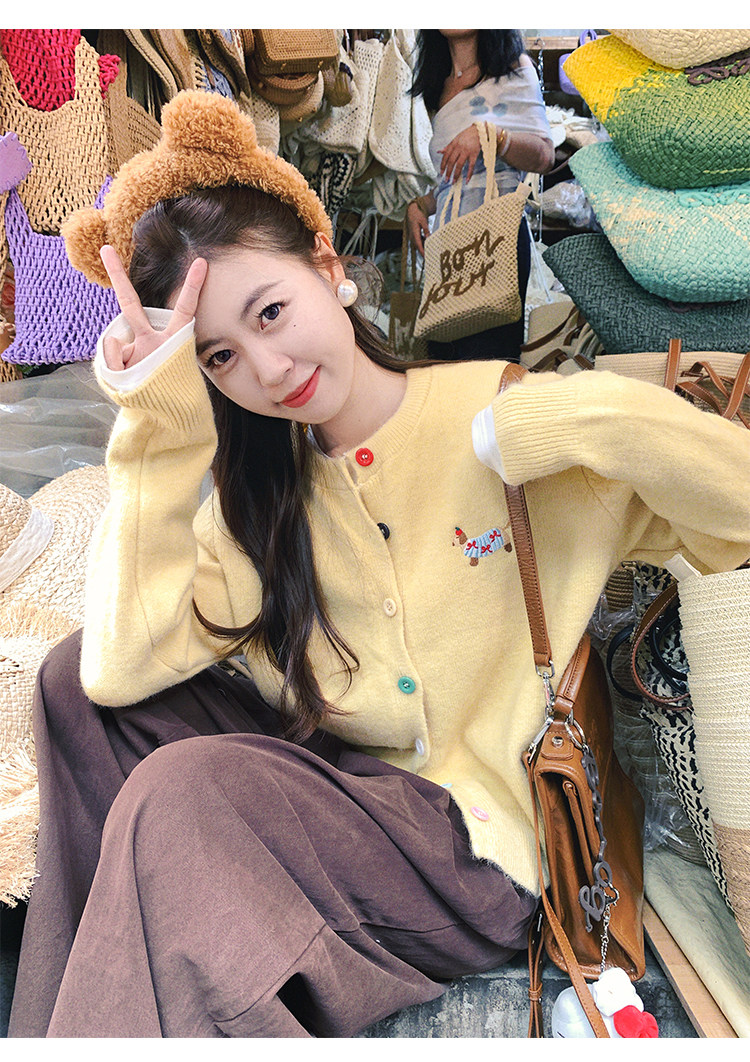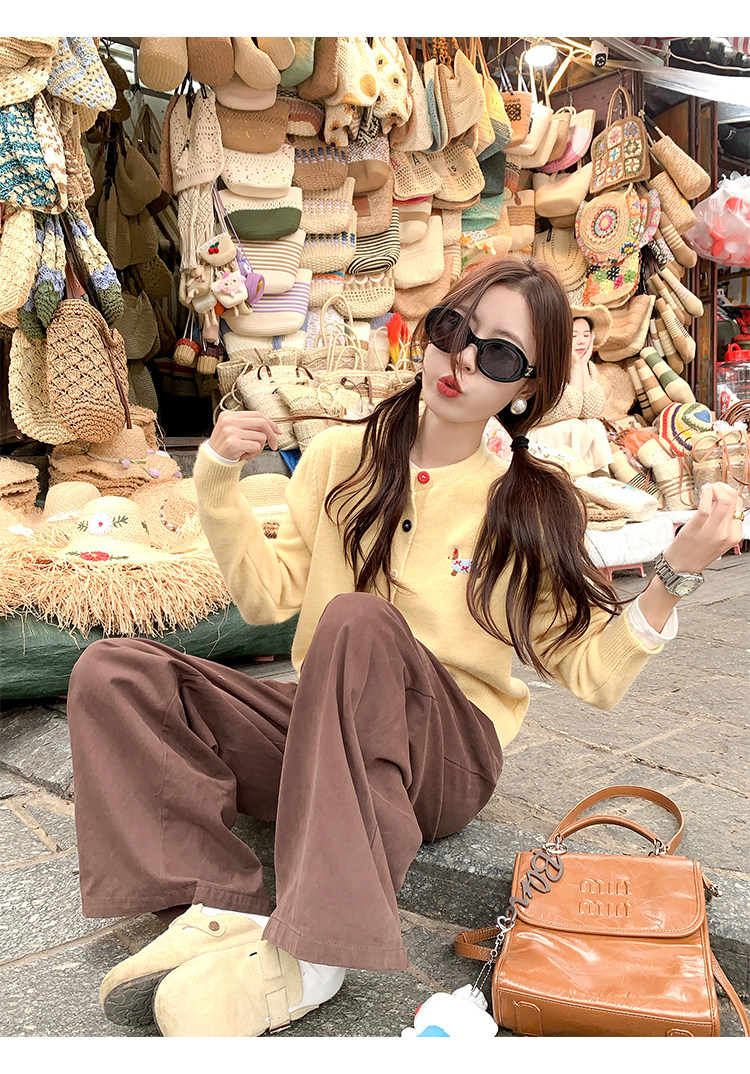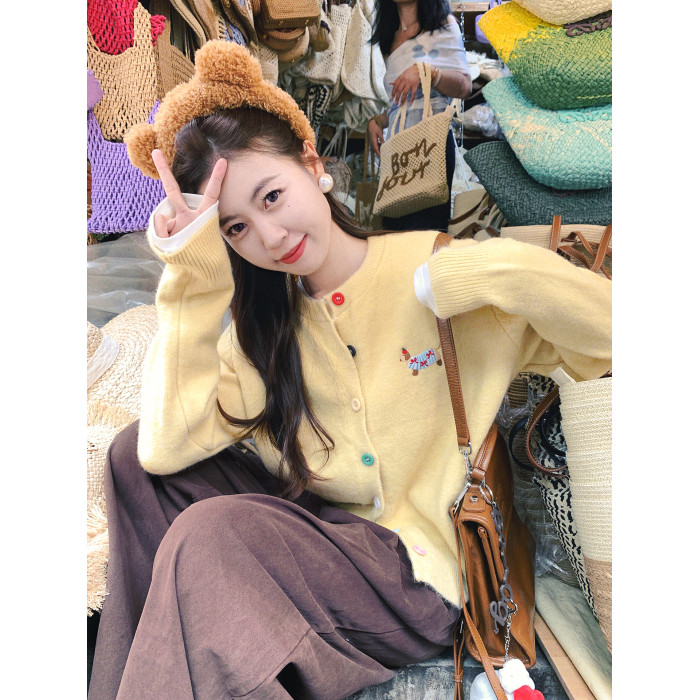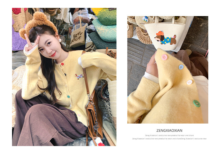 曾小鹹韓系黃色刺綉毛衣外套女秋冬寬鬆毛織針織開衫上衣秋季秋裝