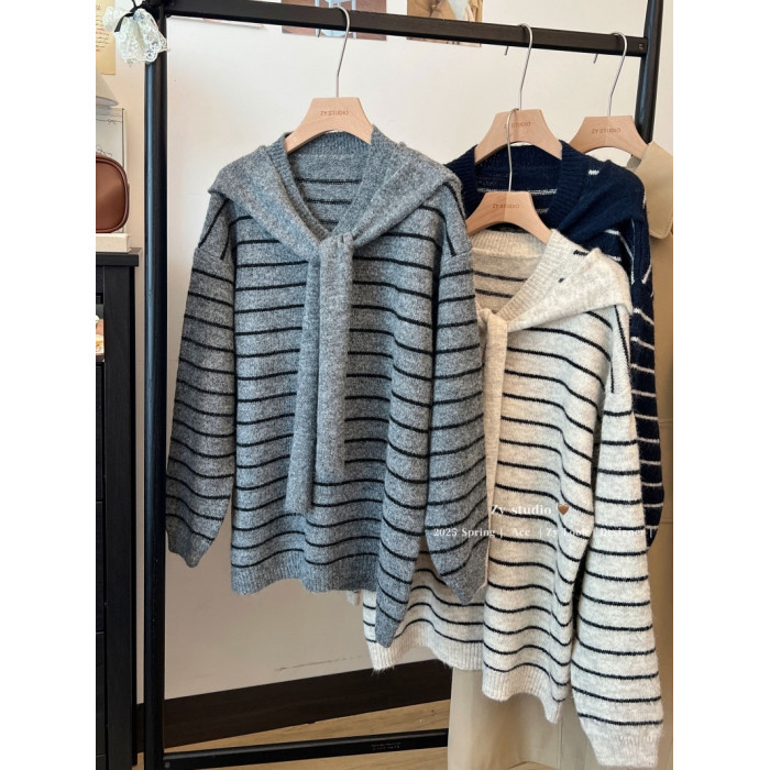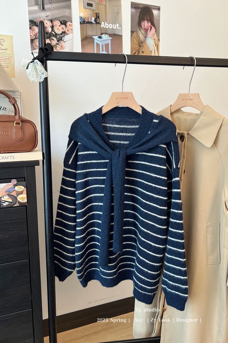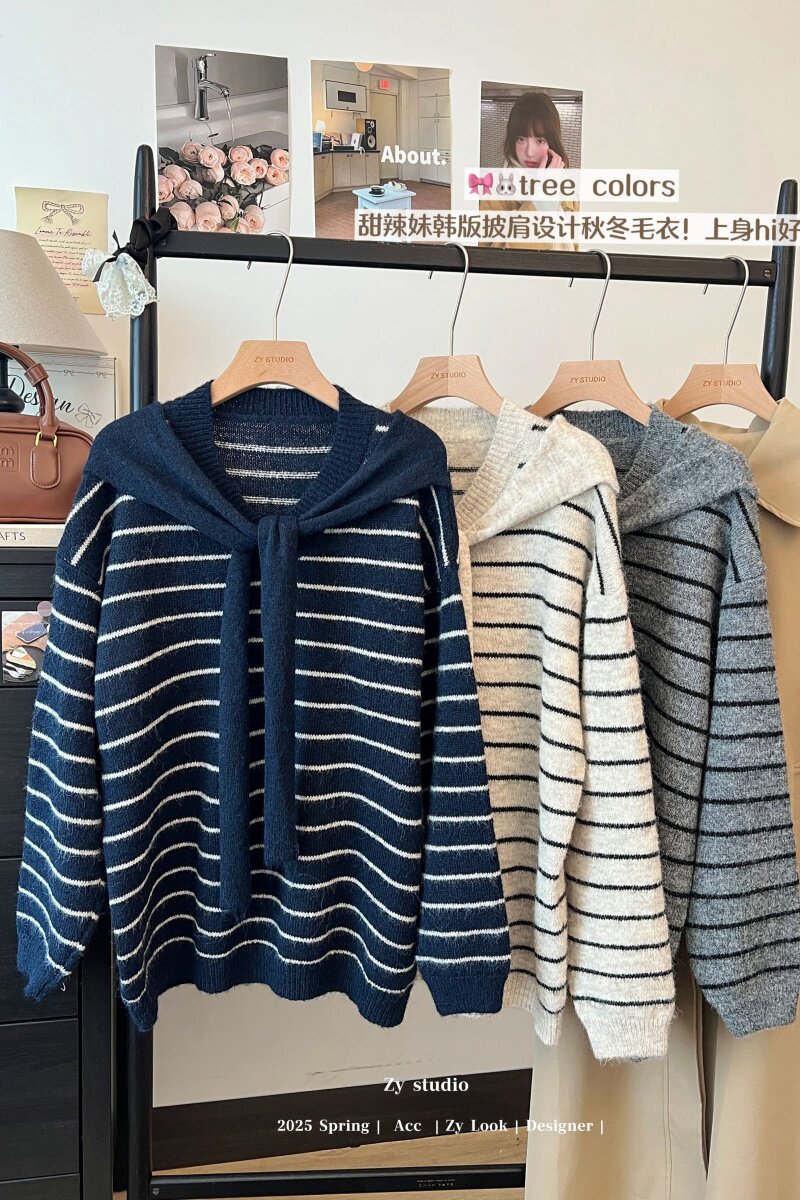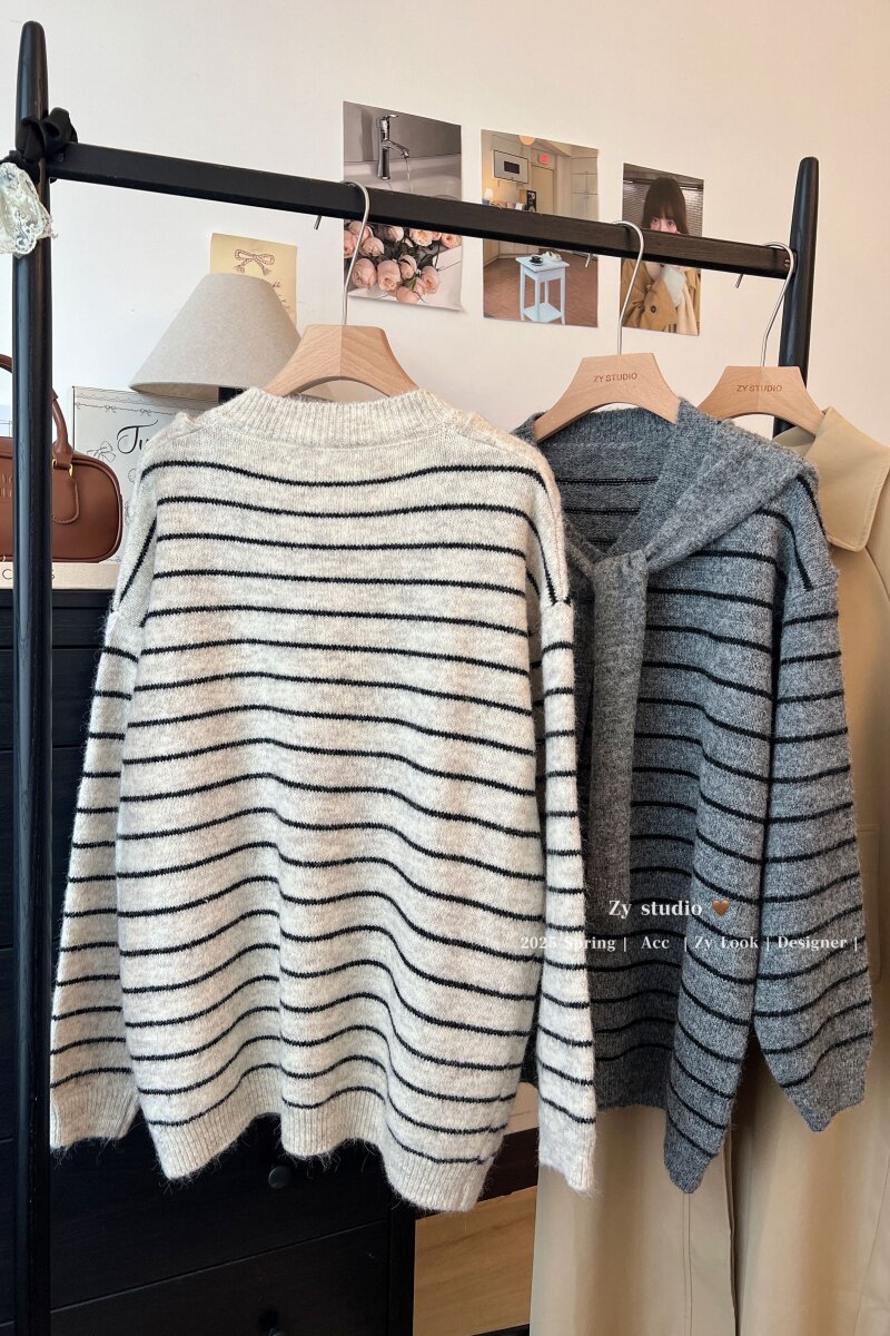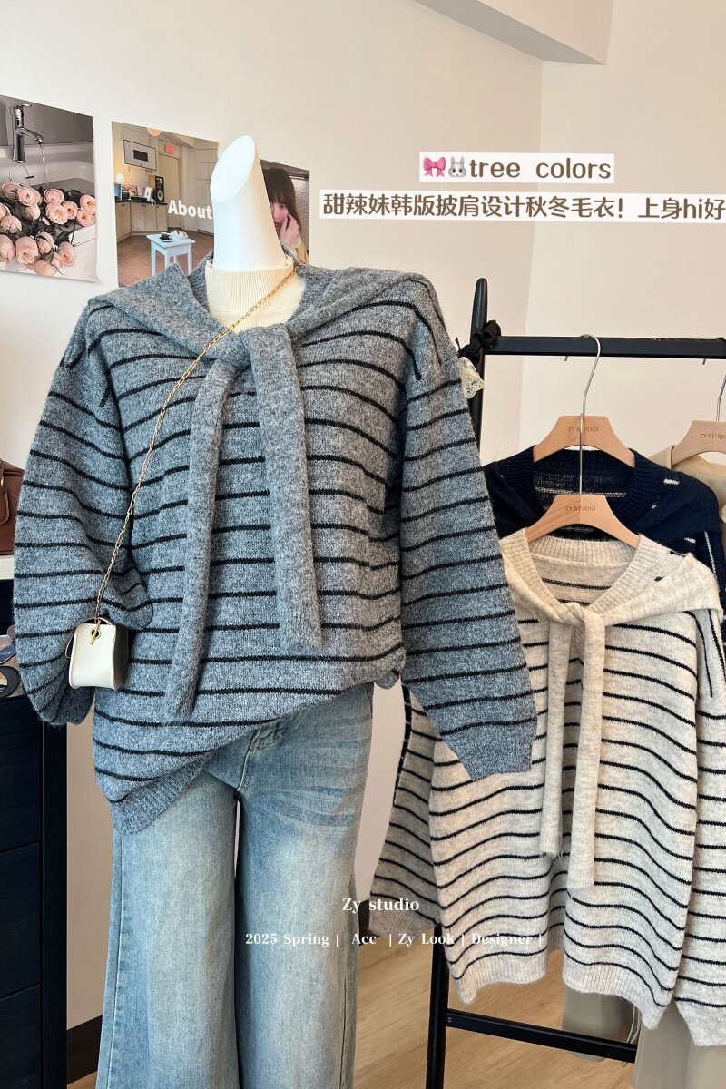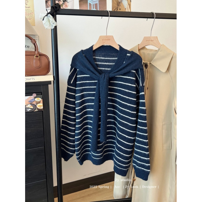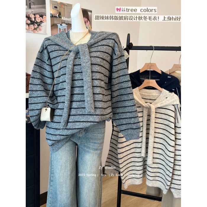 kumikumi慵嬾風披肩圓領條紋套頭毛衣女秋季寬鬆顯瘦百搭休閒上衣