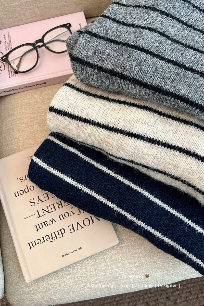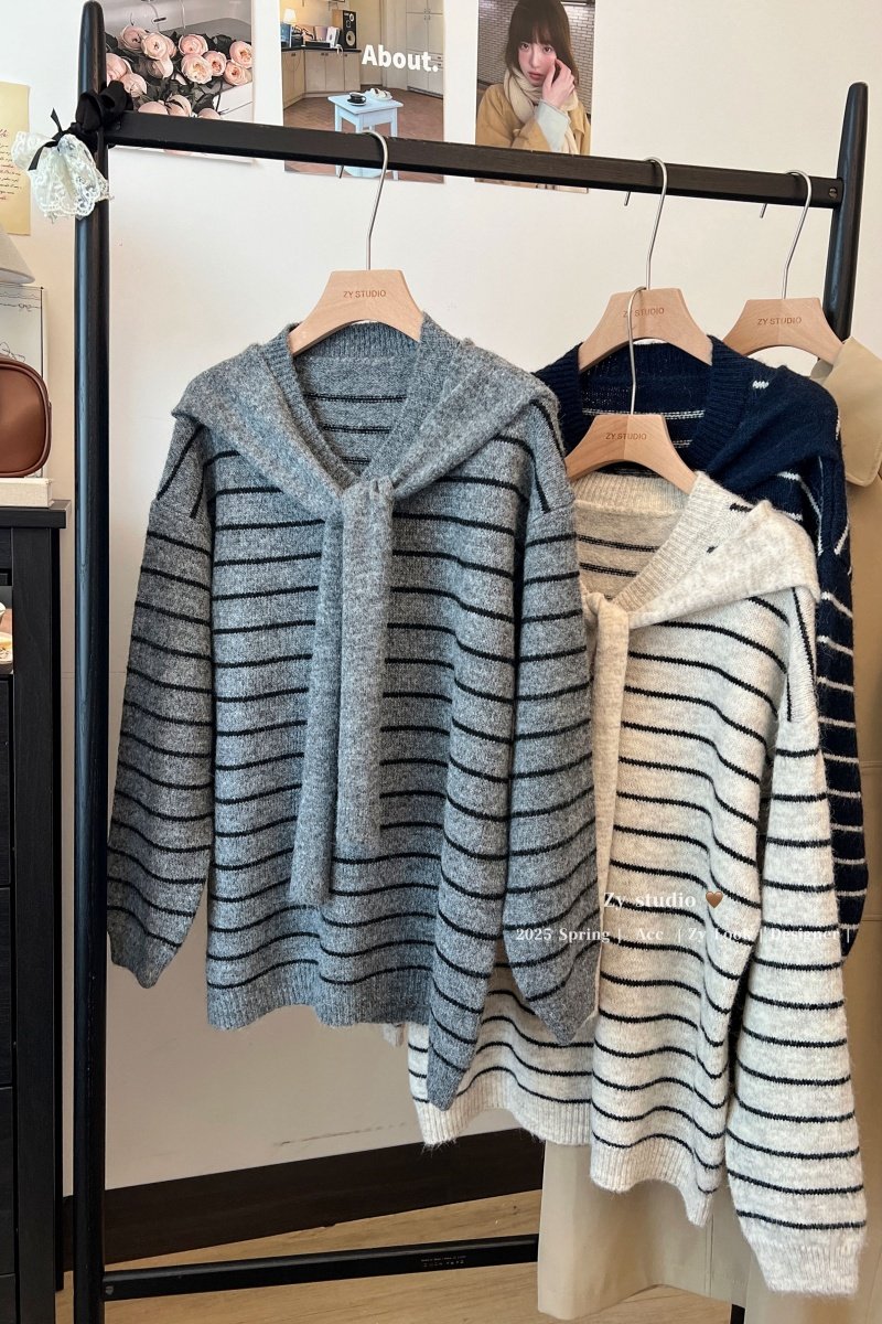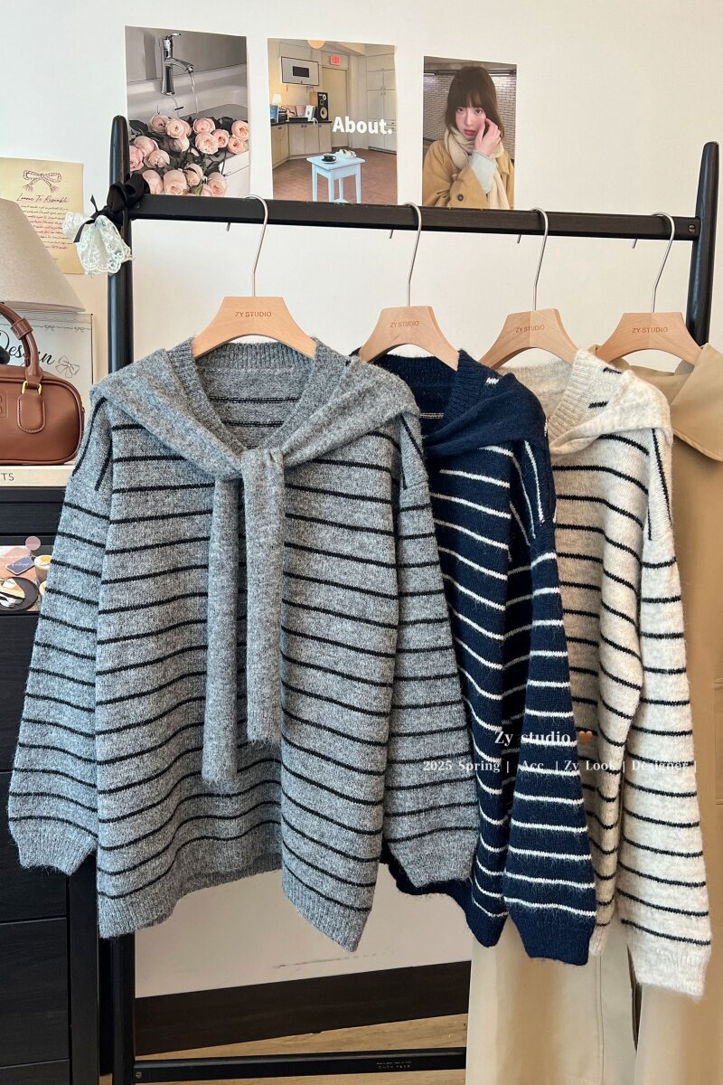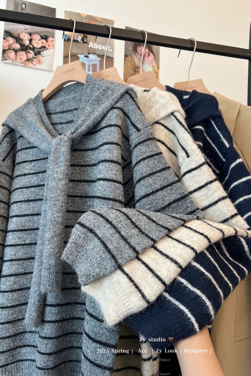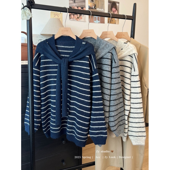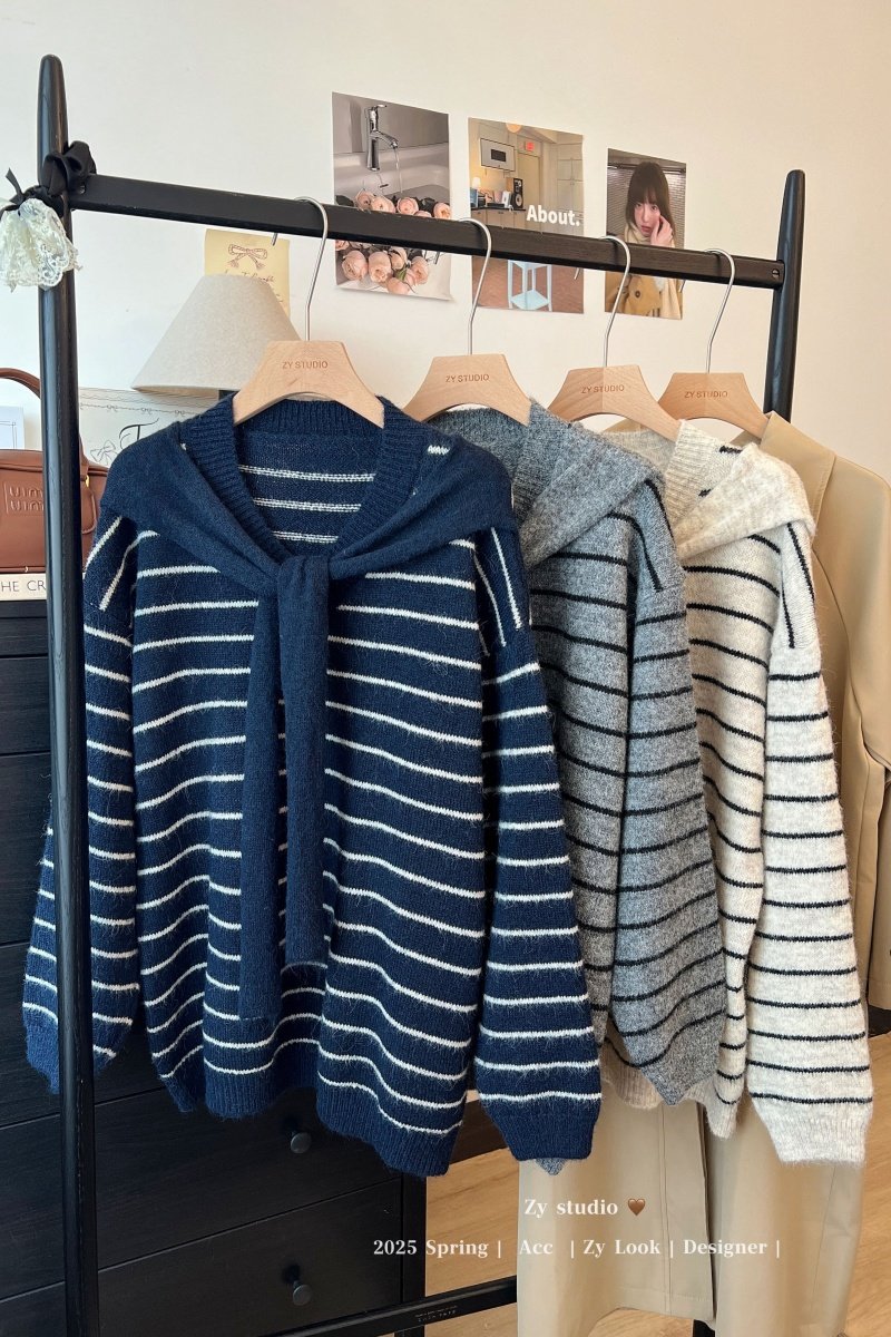 kumikumi慵嬾風披肩圓領條紋套頭毛衣女秋季寬鬆顯瘦百搭休閒上衣