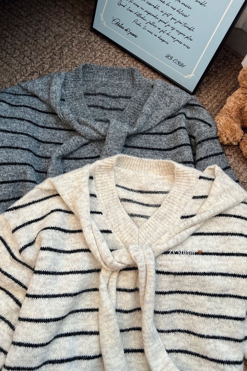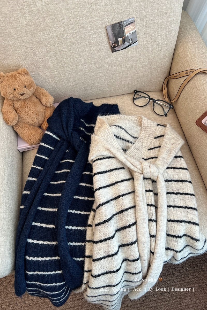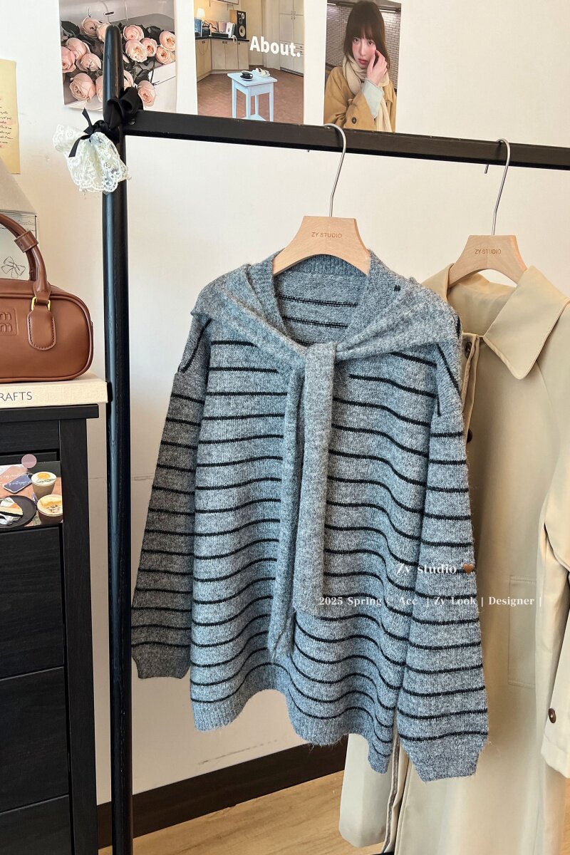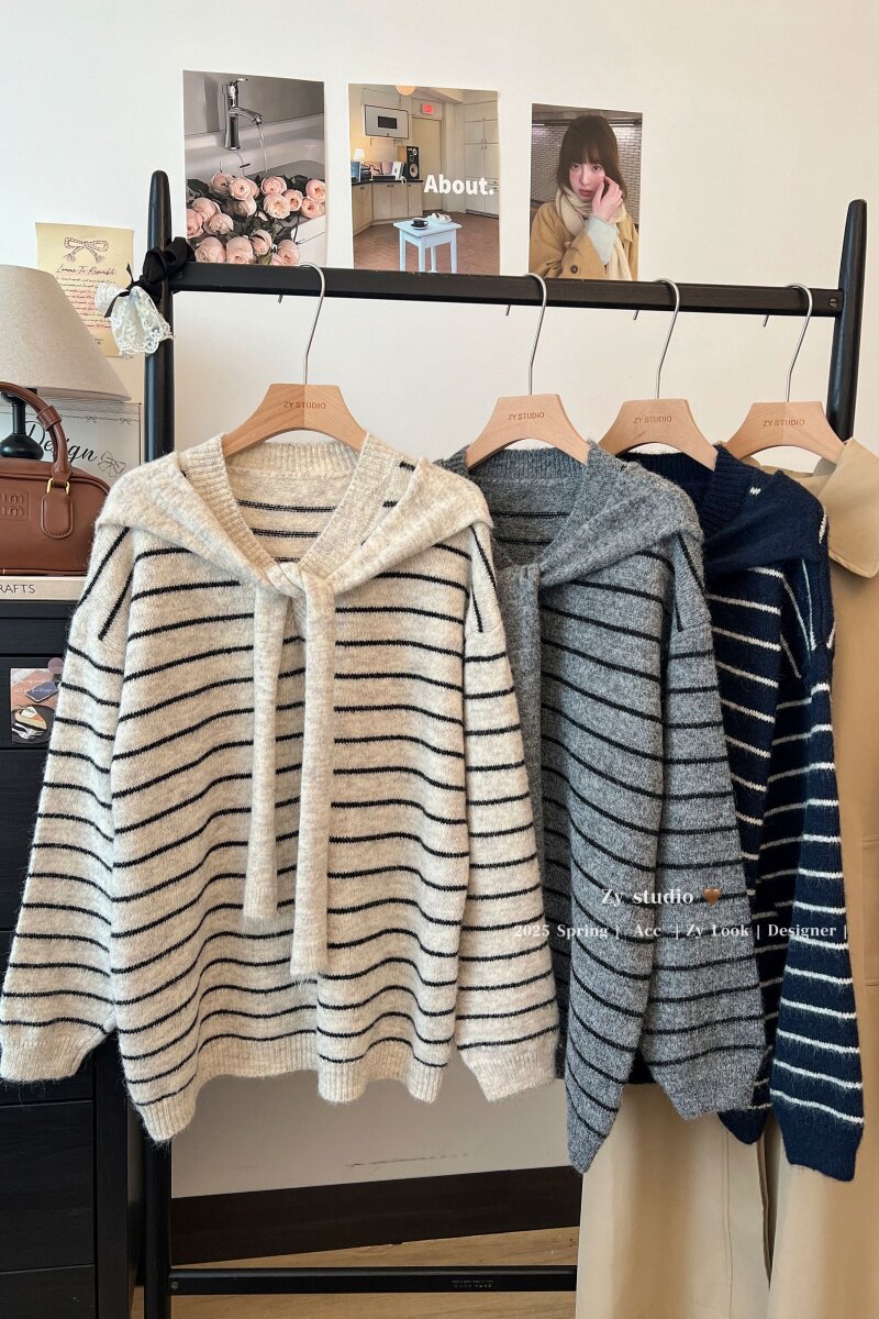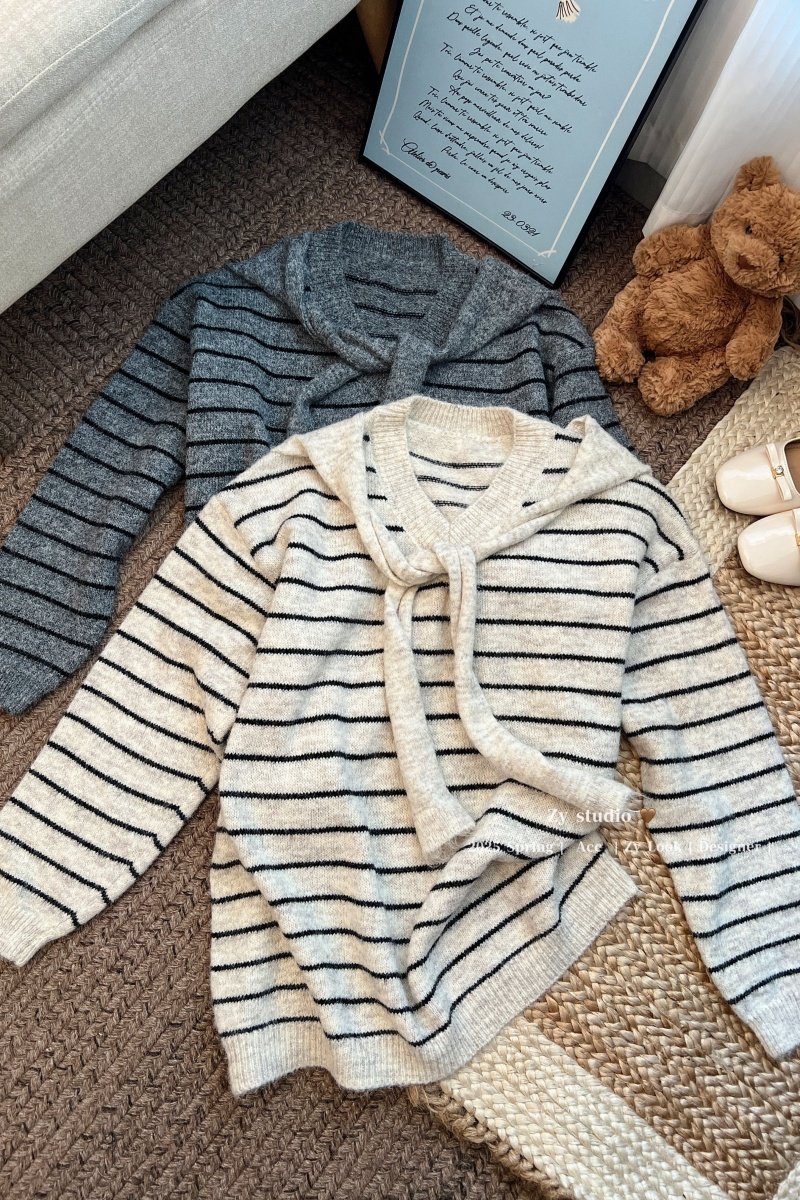kumikumi慵嬾風披肩圓領條紋套頭毛衣女秋季寬鬆顯瘦百搭休閒上衣