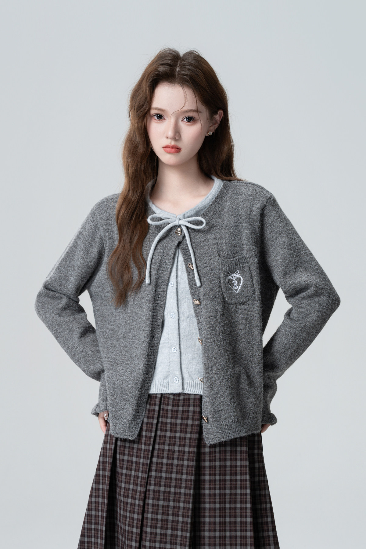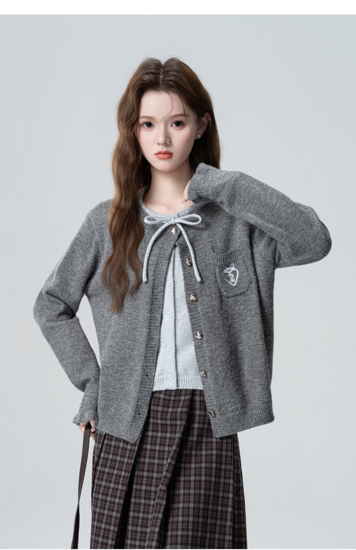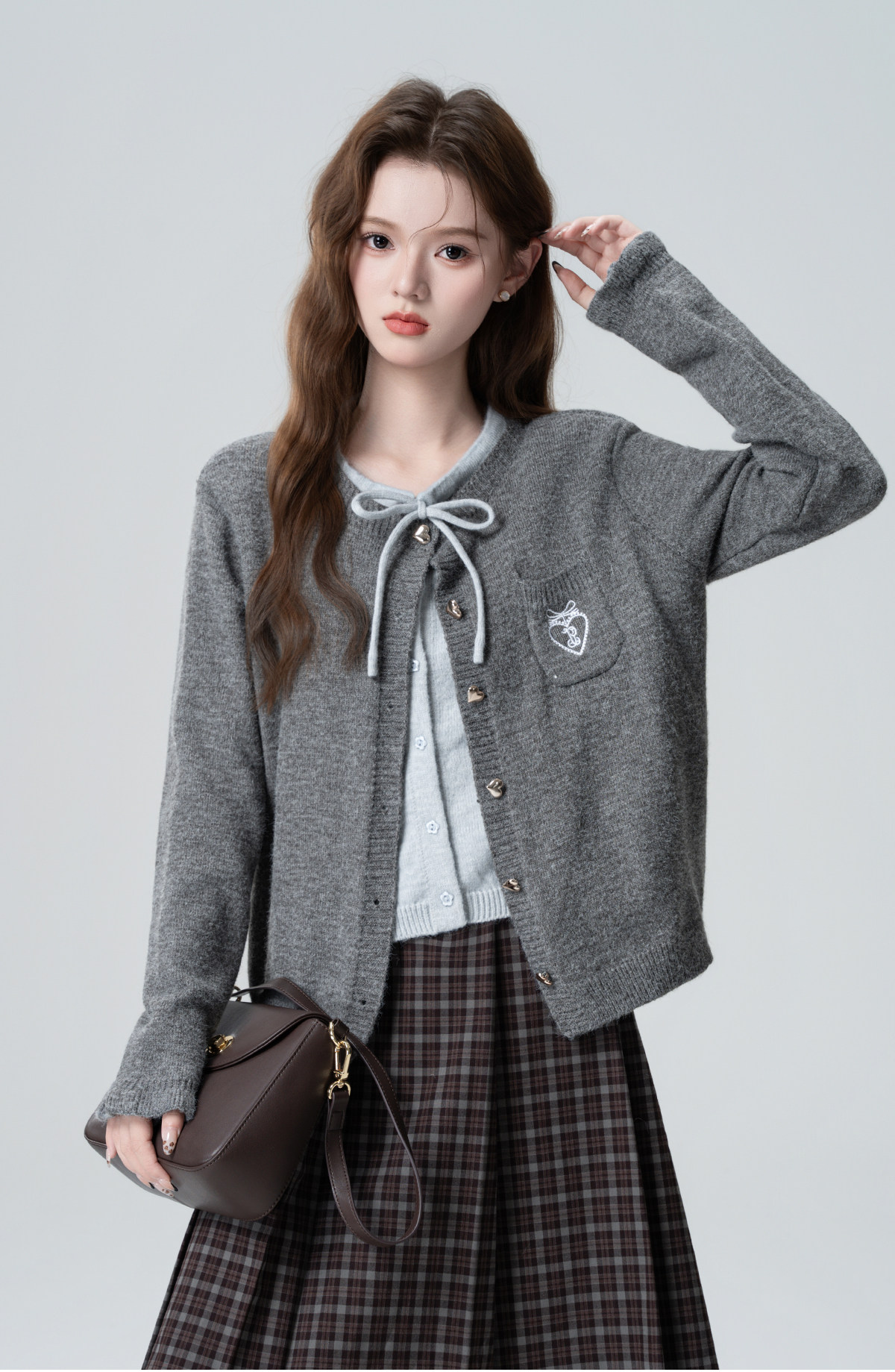 深灰色蝴蝶結針織開衫女春秋2026秋季新款假兩件毛衣外套短款上衣