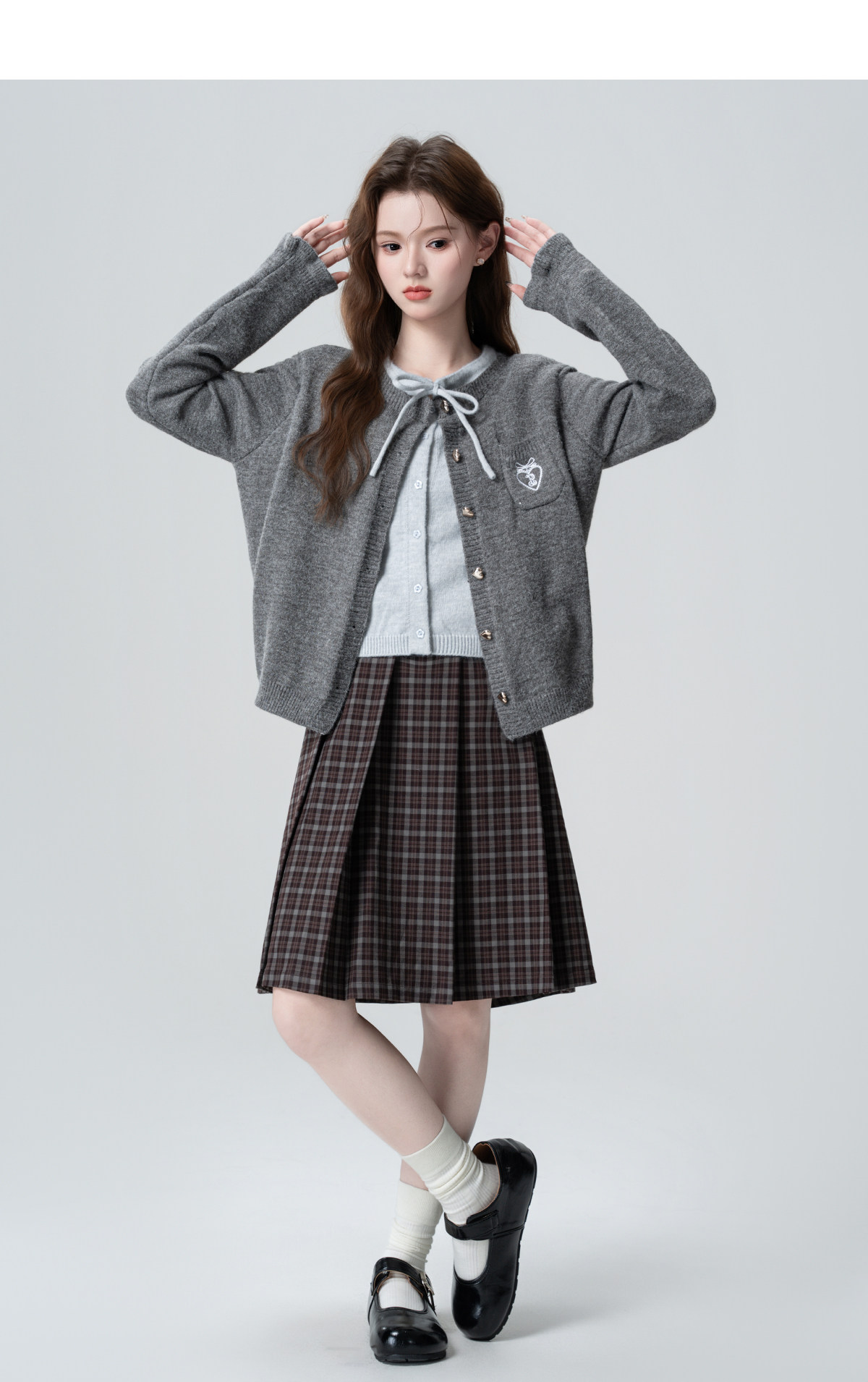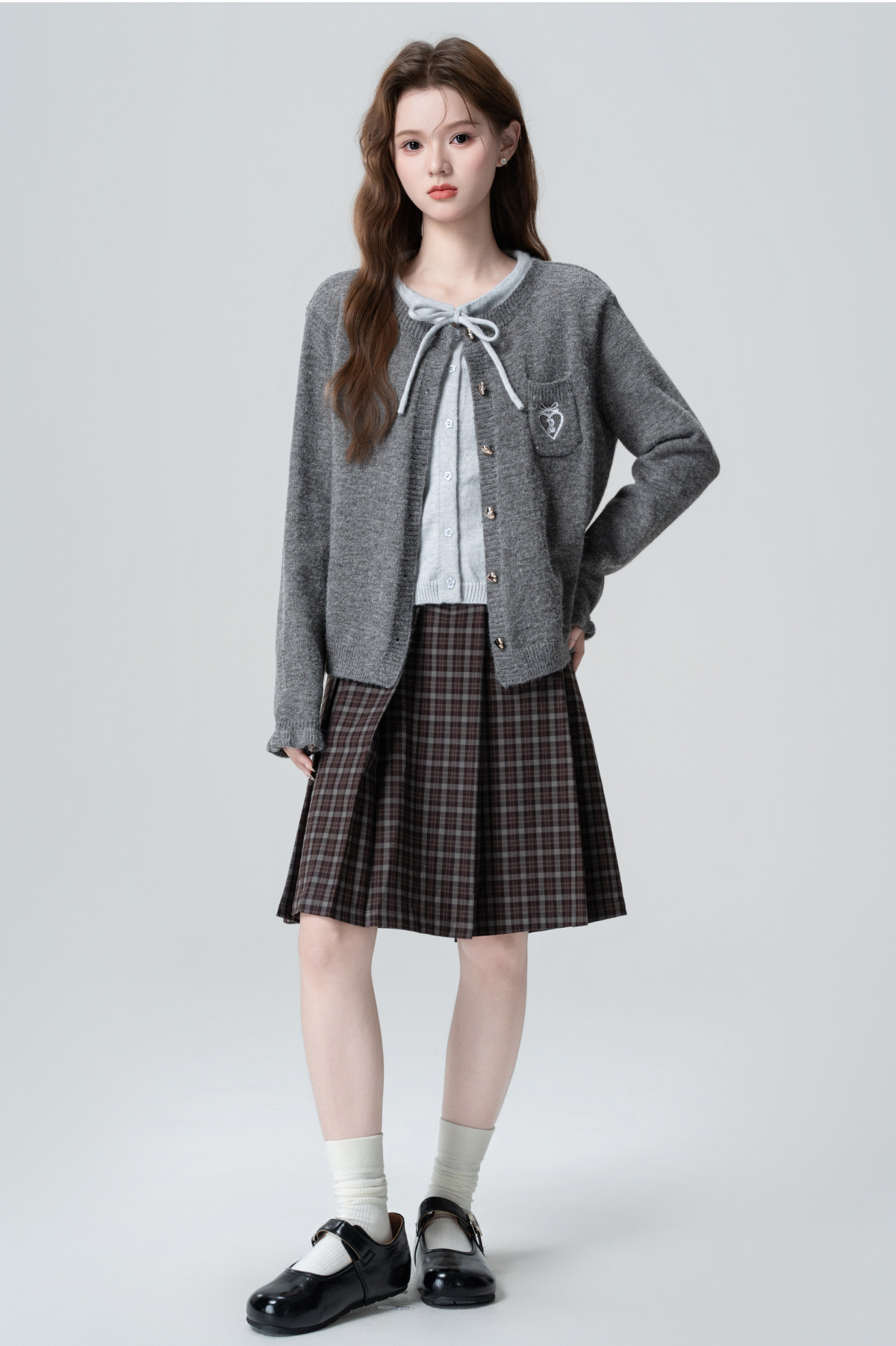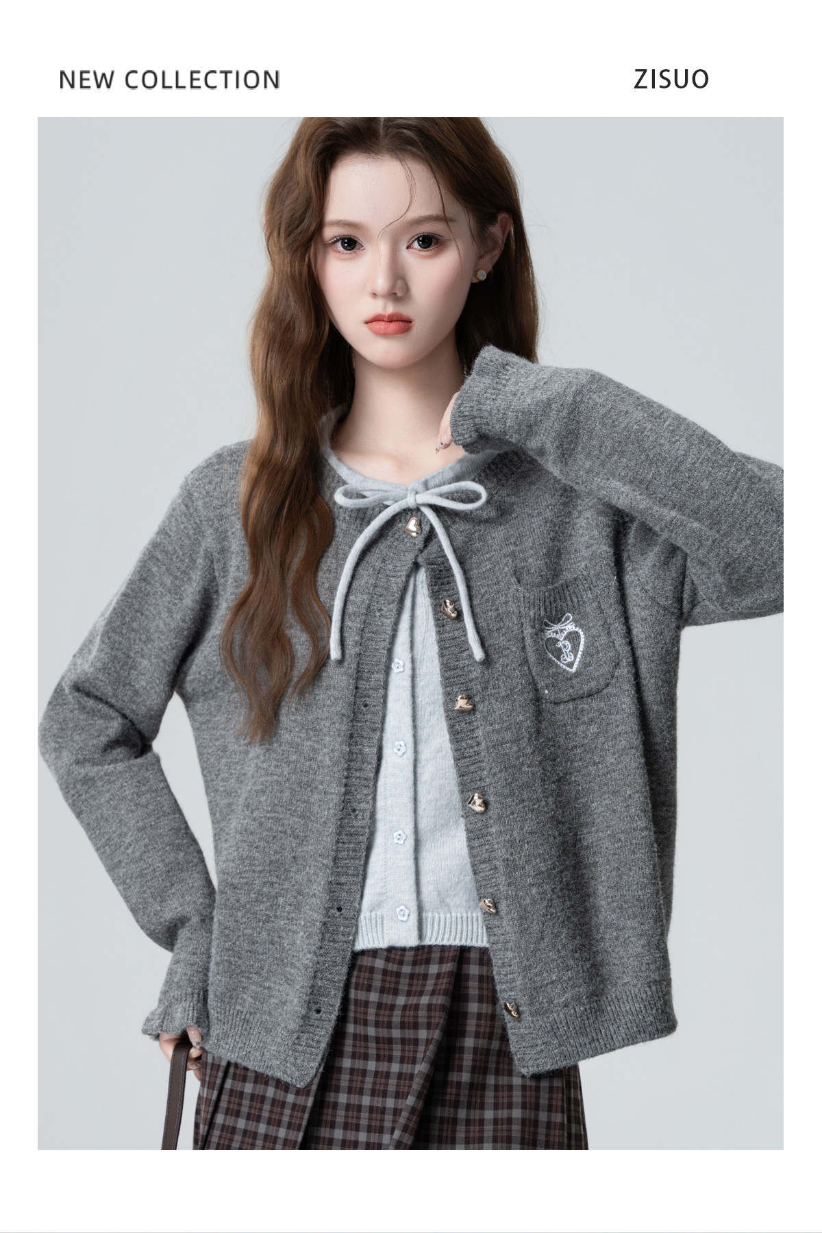 深灰色蝴蝶結針織開衫女春秋2026秋季新款假兩件毛衣外套短款上衣