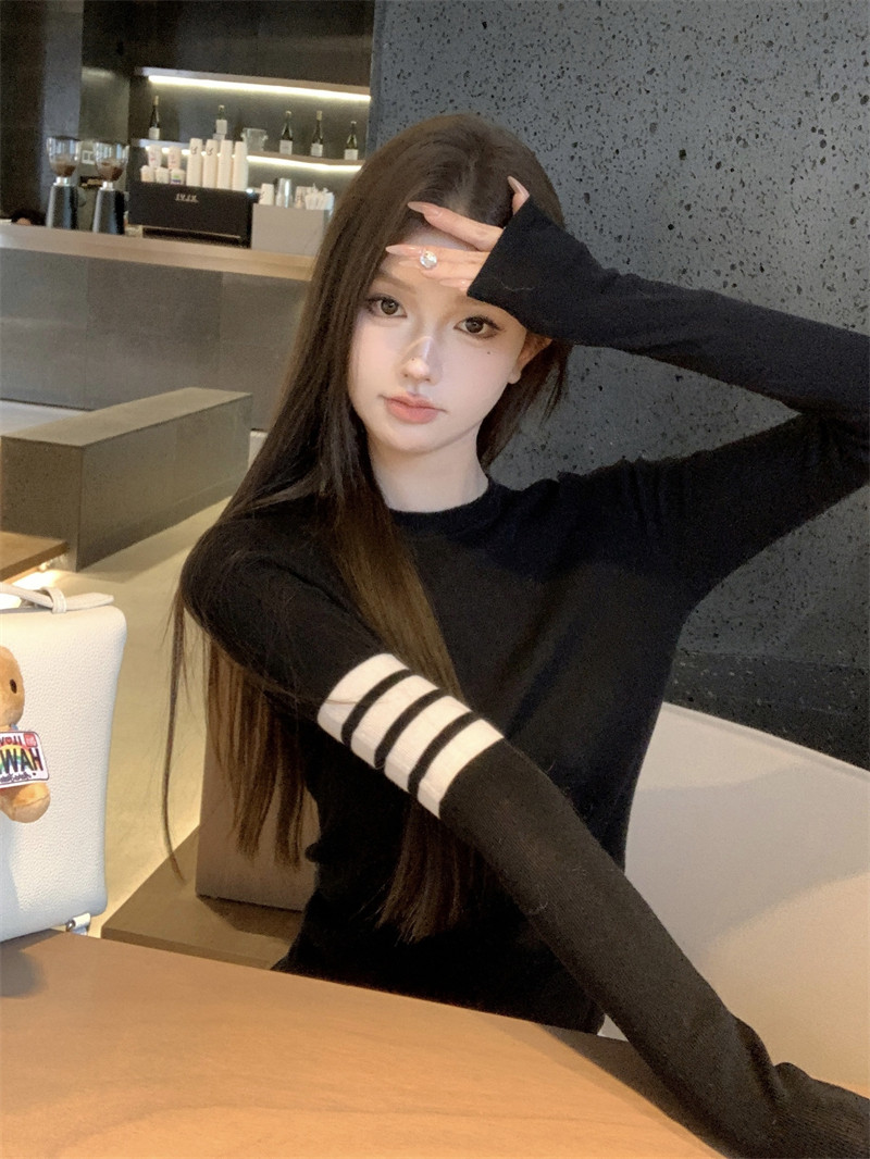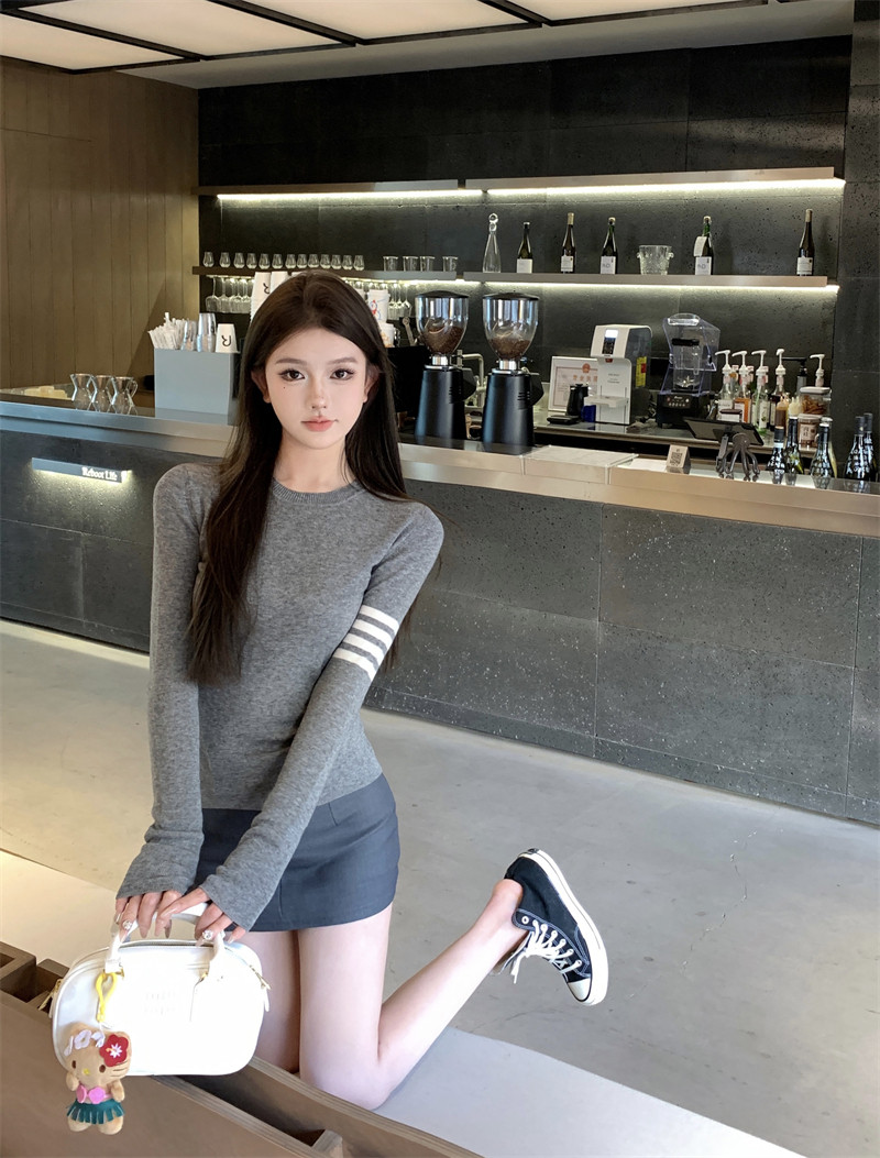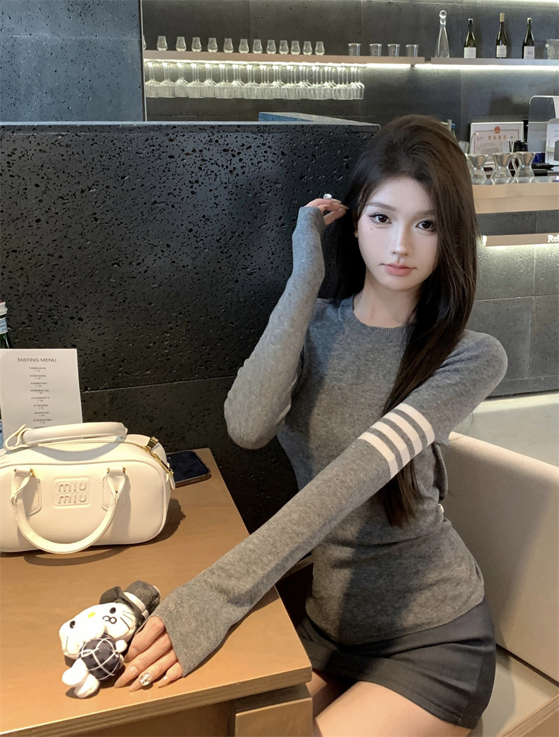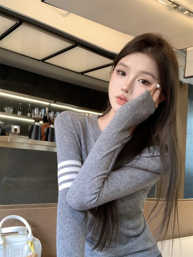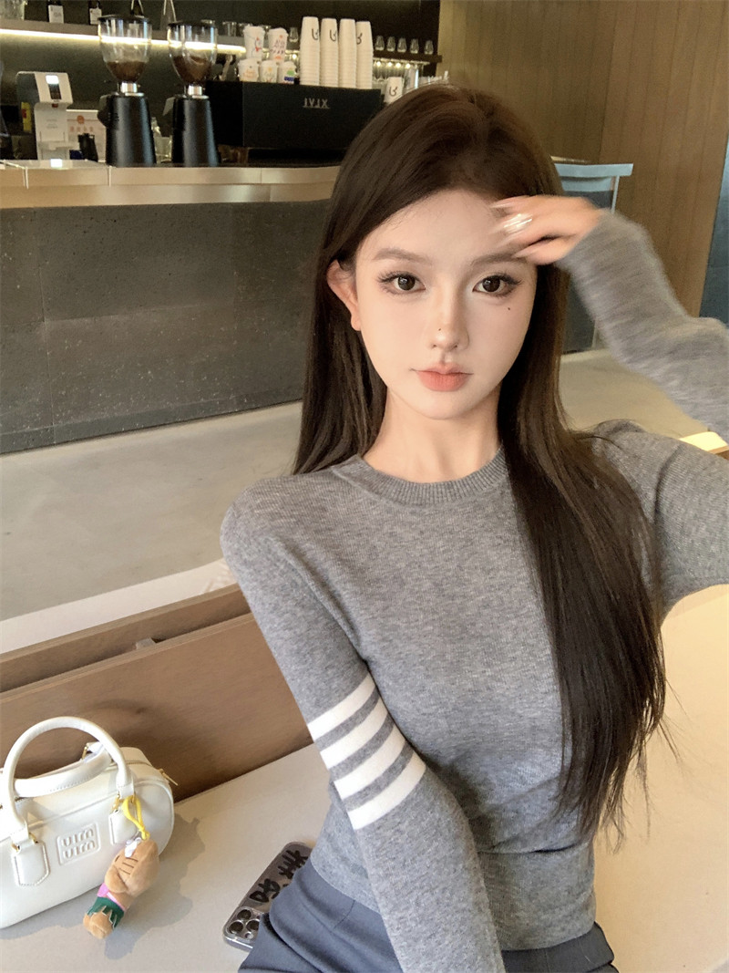條紋灰色針織衫女秋季2025新款高級感內搭打底衫修身顯瘦長袖上衣