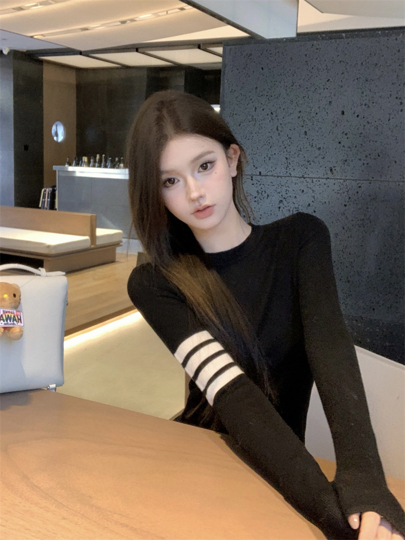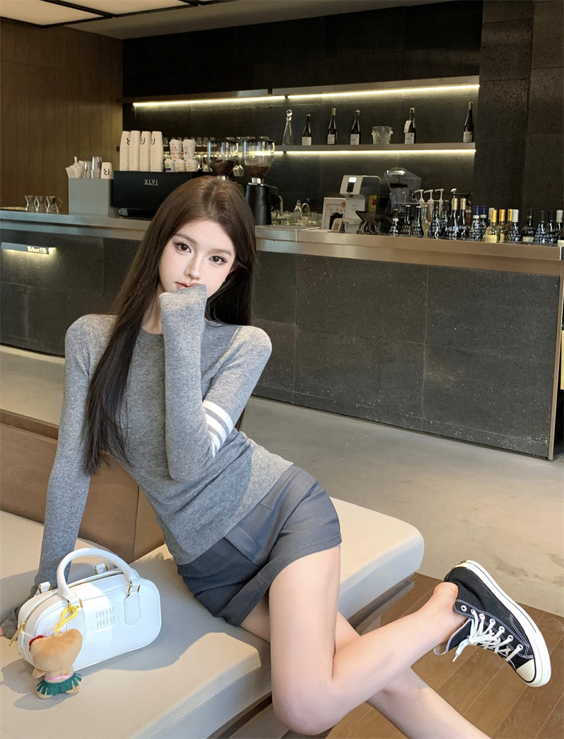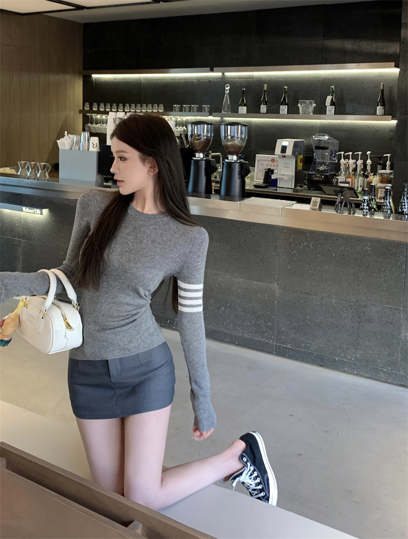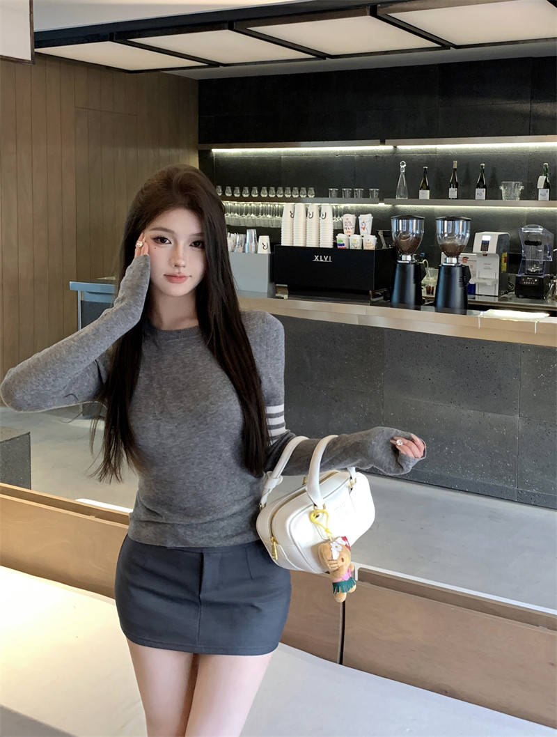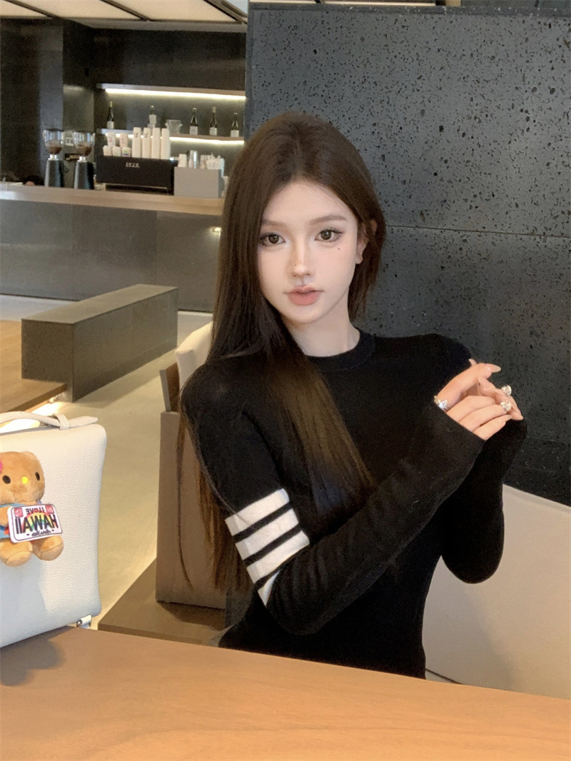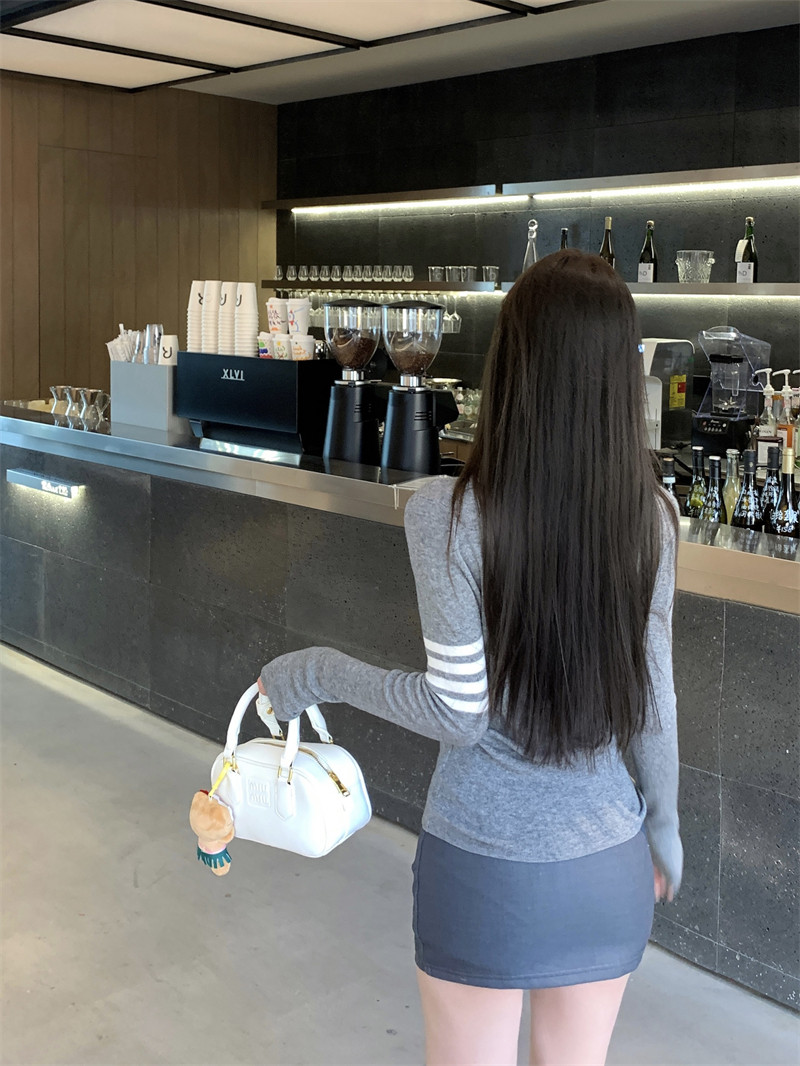 條紋灰色針織衫女秋季2025新款高級感內搭打底衫修身顯瘦長袖上衣