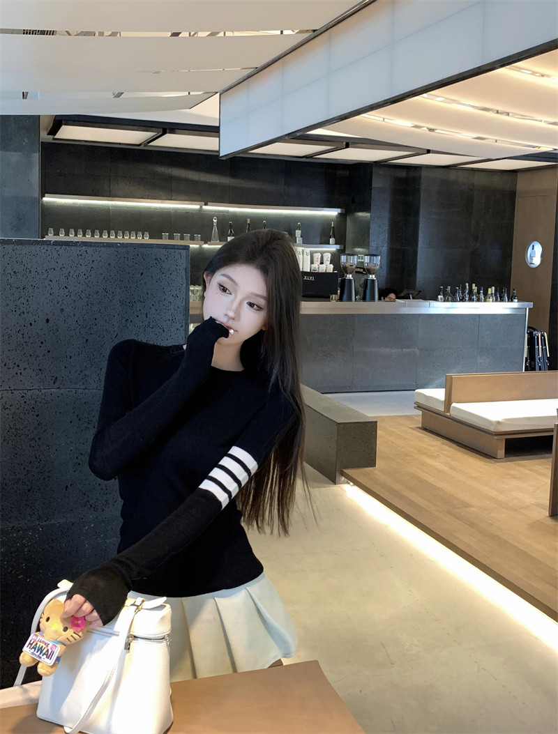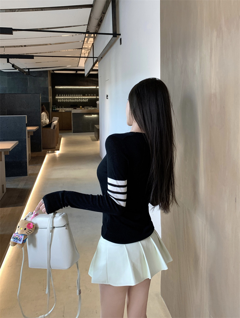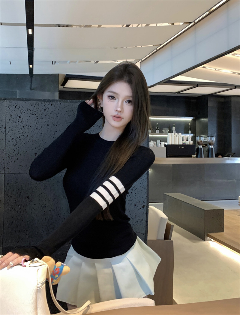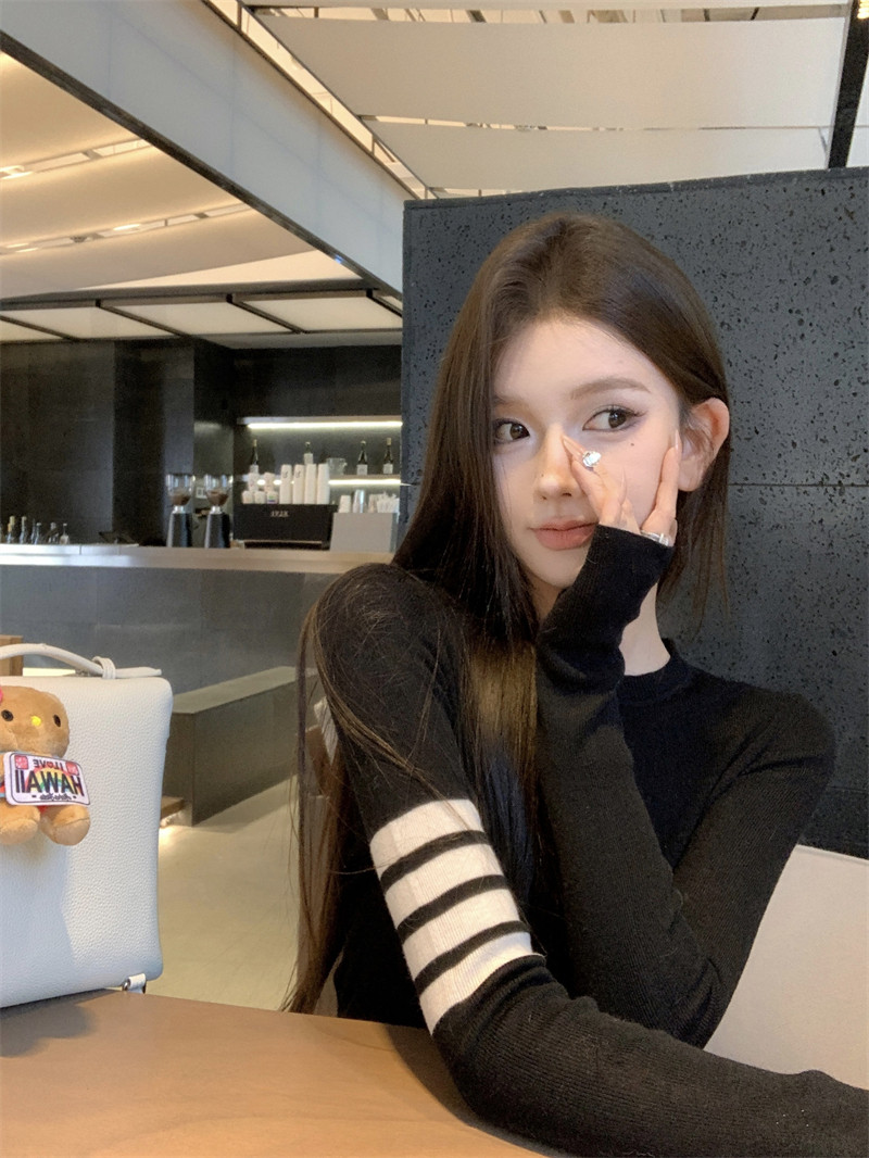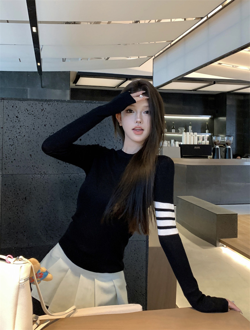條紋灰色針織衫女秋季2025新款高級感內搭打底衫修身顯瘦長袖上衣