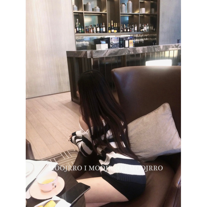 韓系條紋斜肩長袖毛衣女秋純欲氣質針織衫修身顯瘦設計感露肩上衣