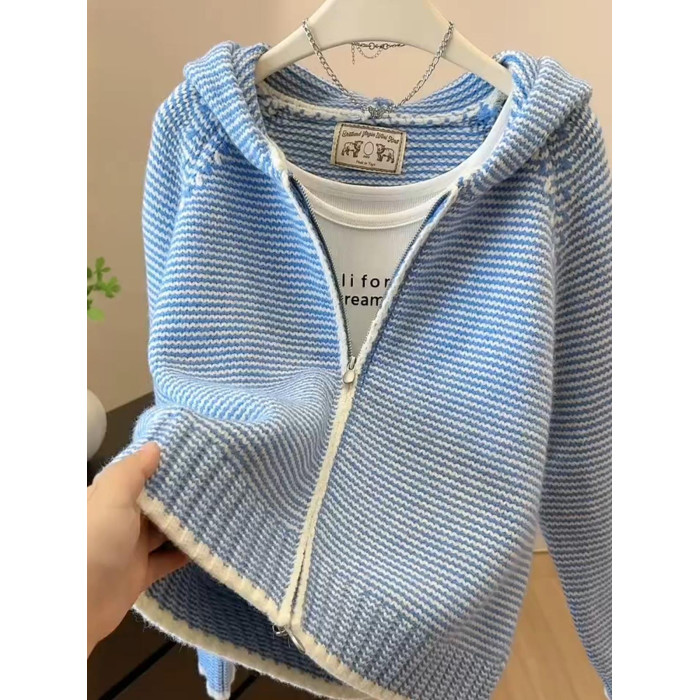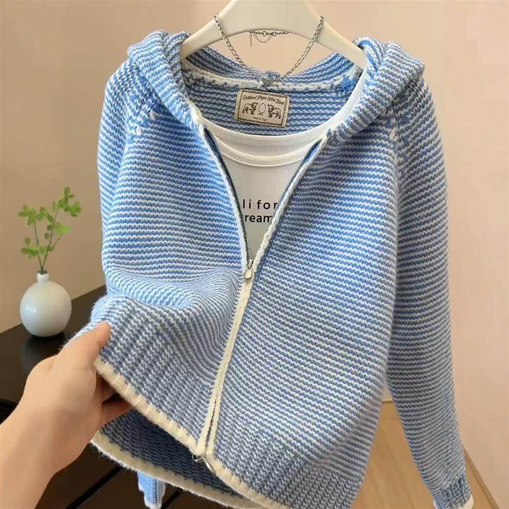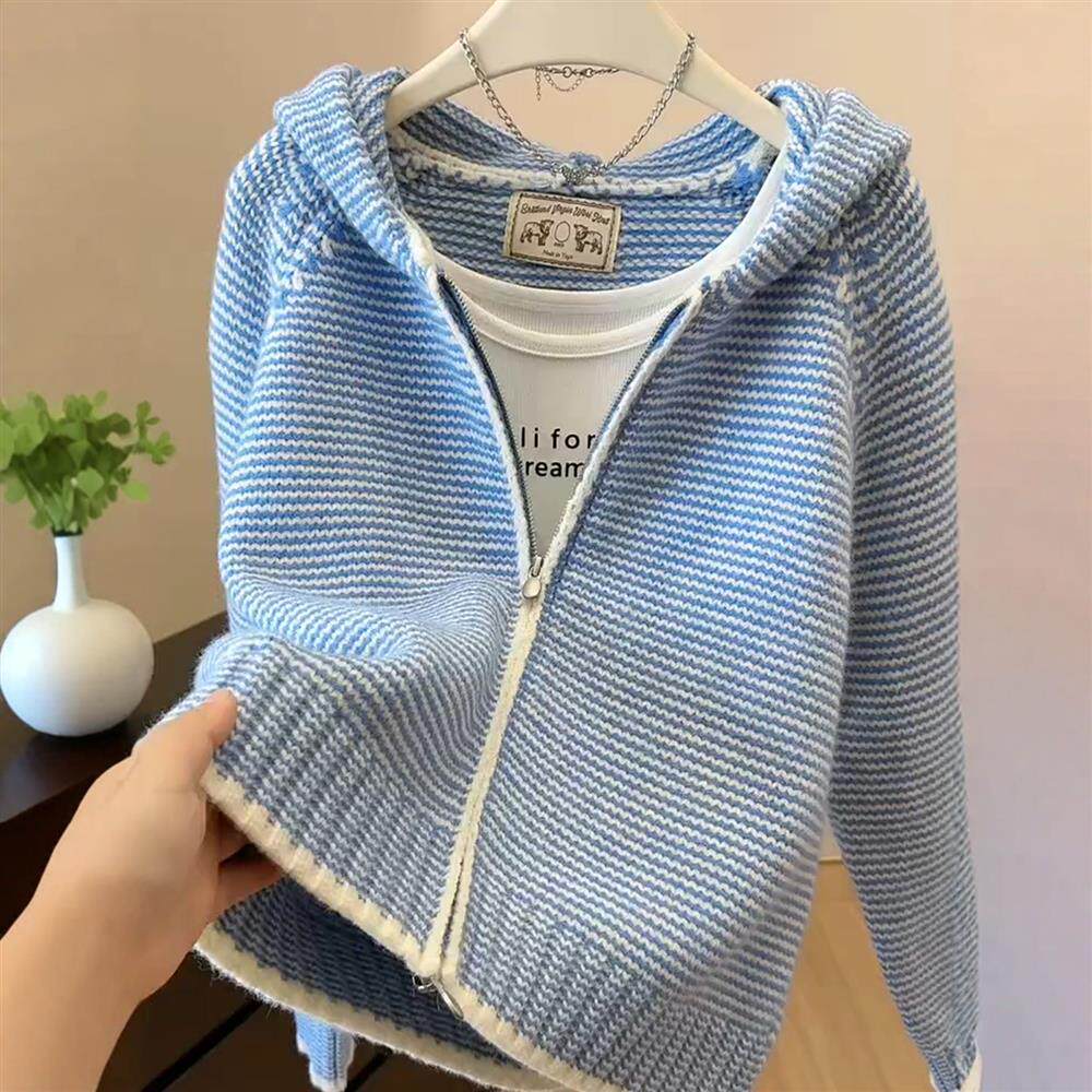 2025秋冬慵懶風時尚條紋連帽針織開衫女秋季百搭洋氣顯瘦毛衣上衣