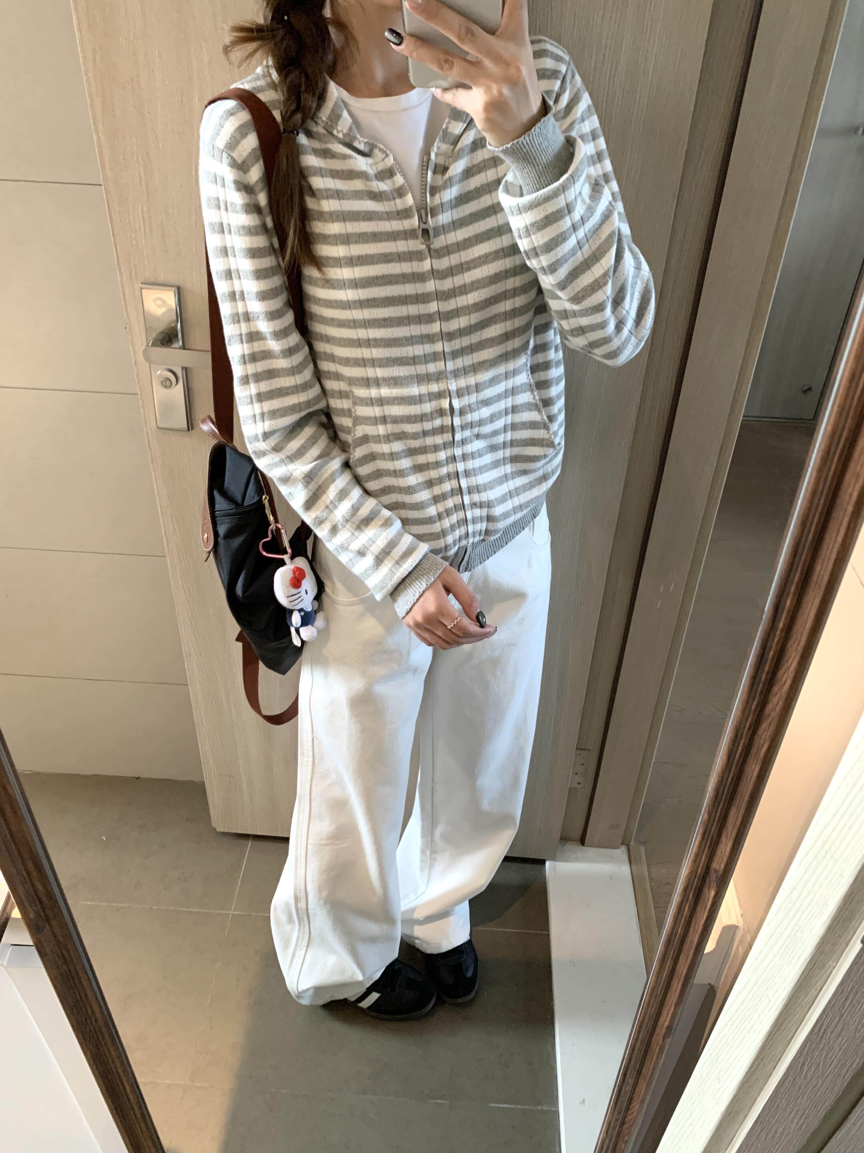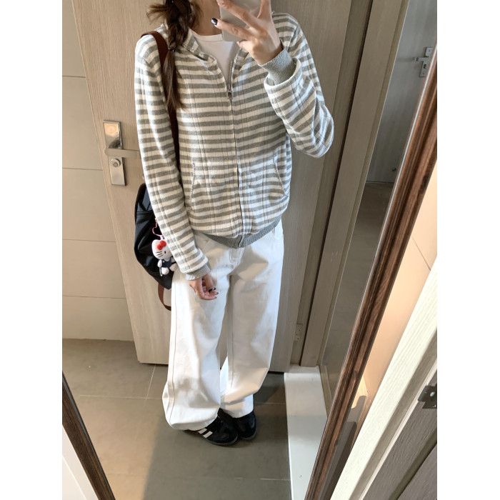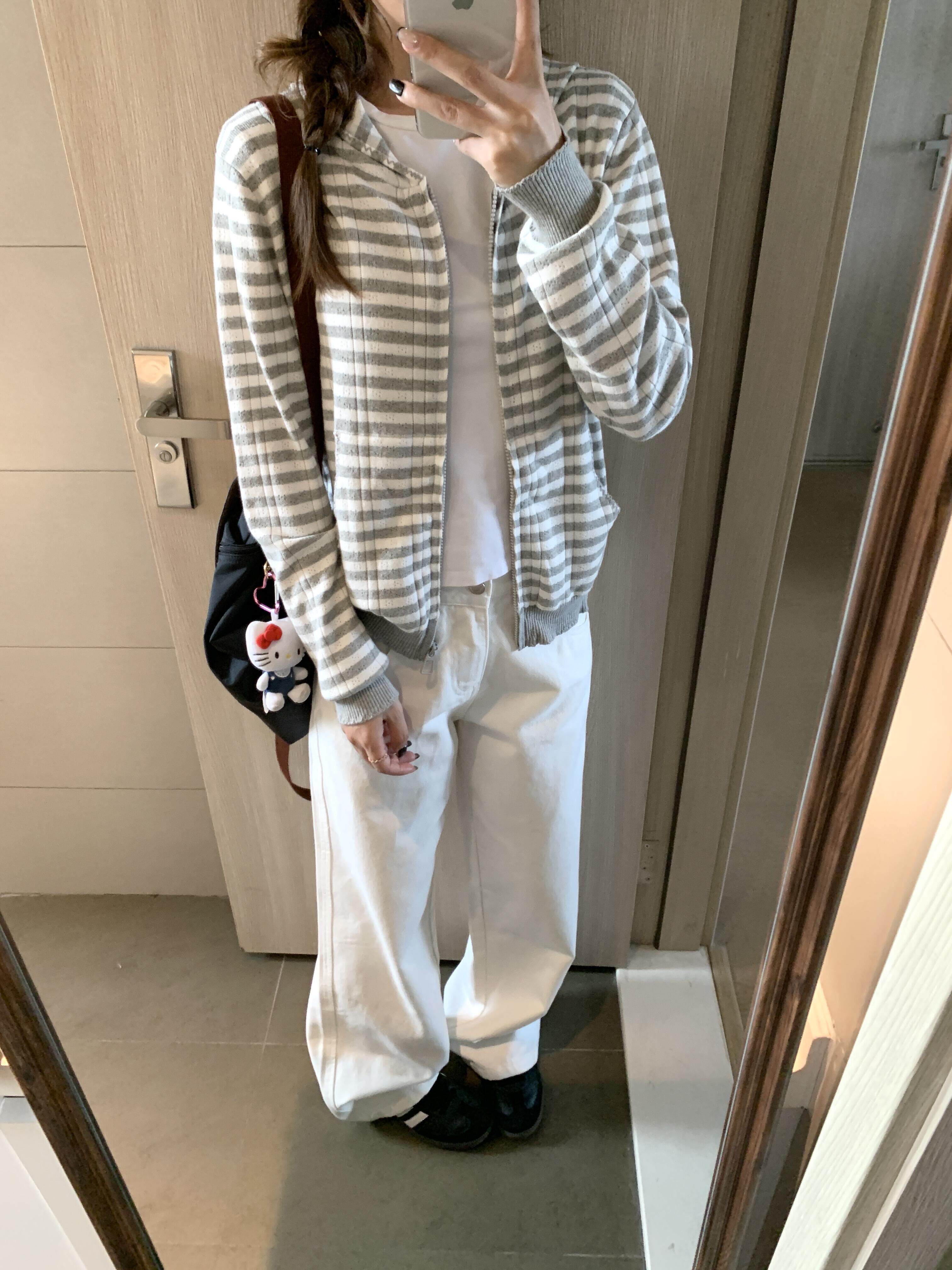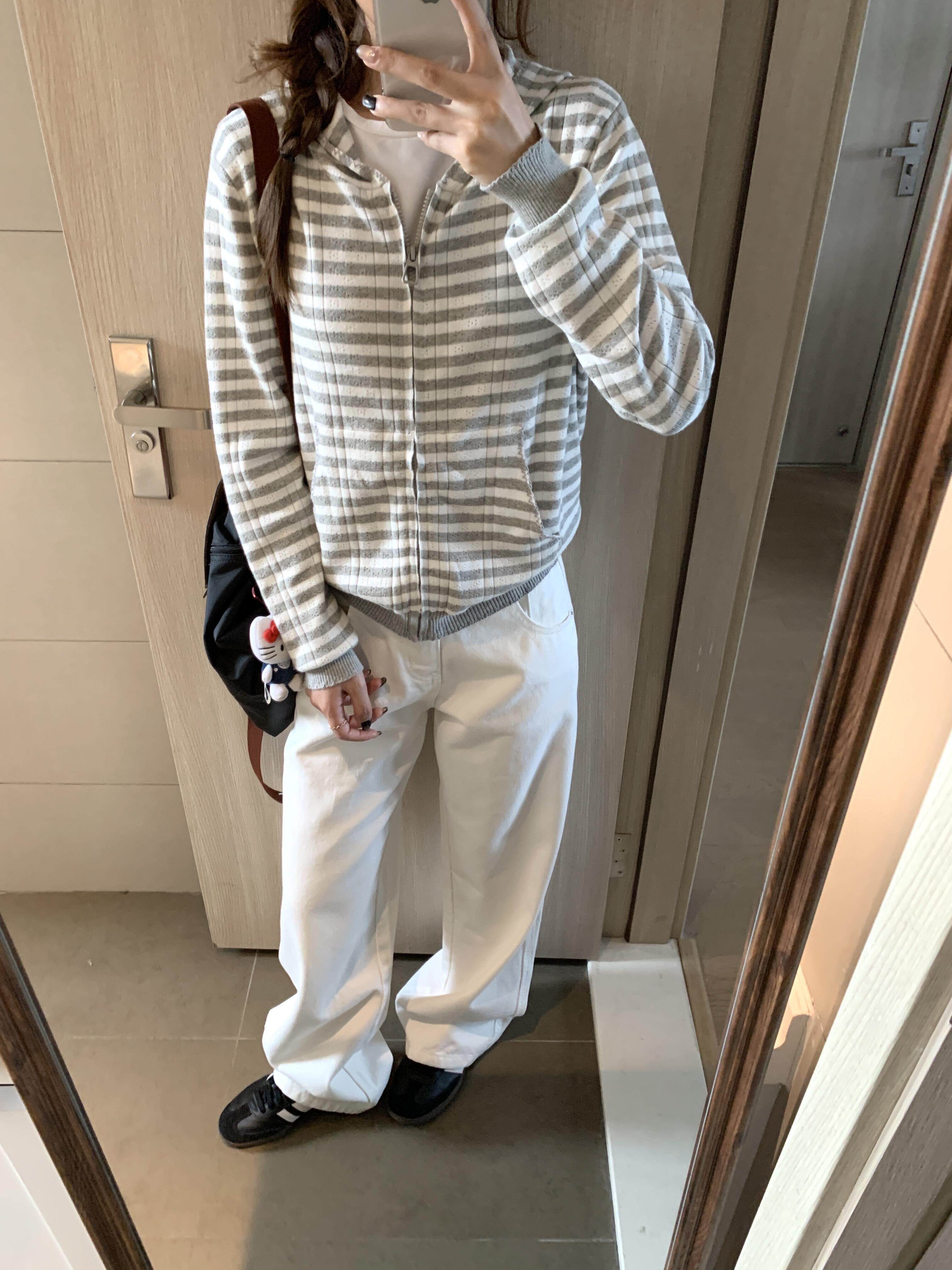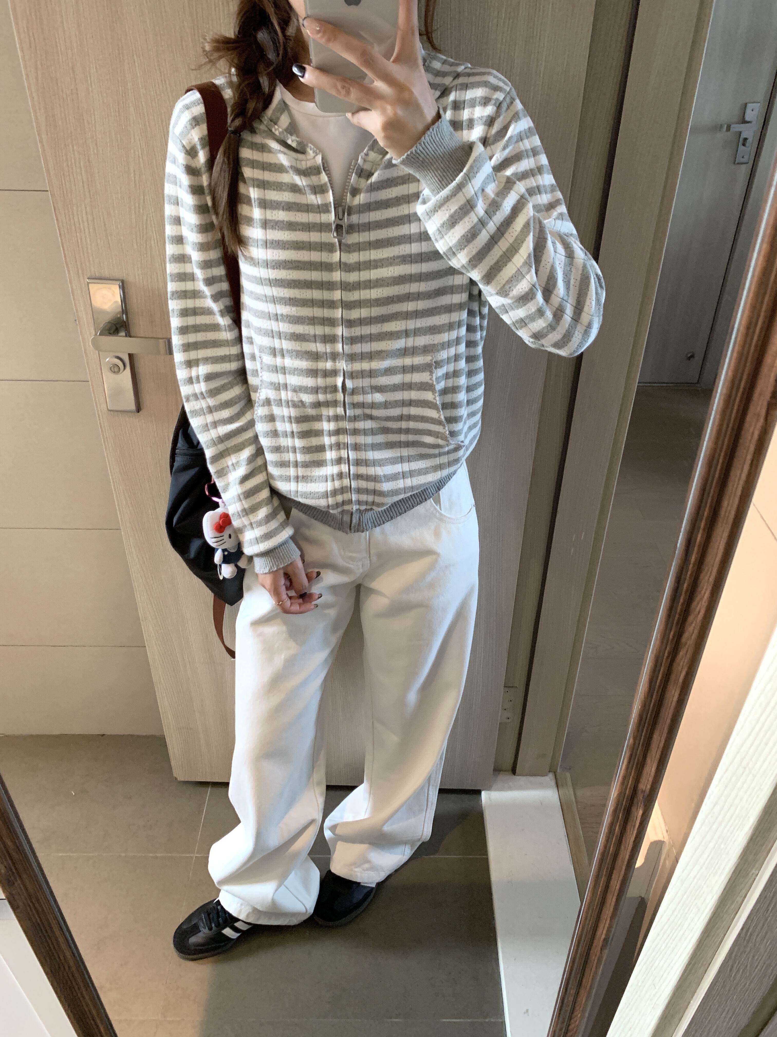 條紋連帽長袖針織衫外套女2025秋季新款韓系顯瘦短款開衫上衣chic