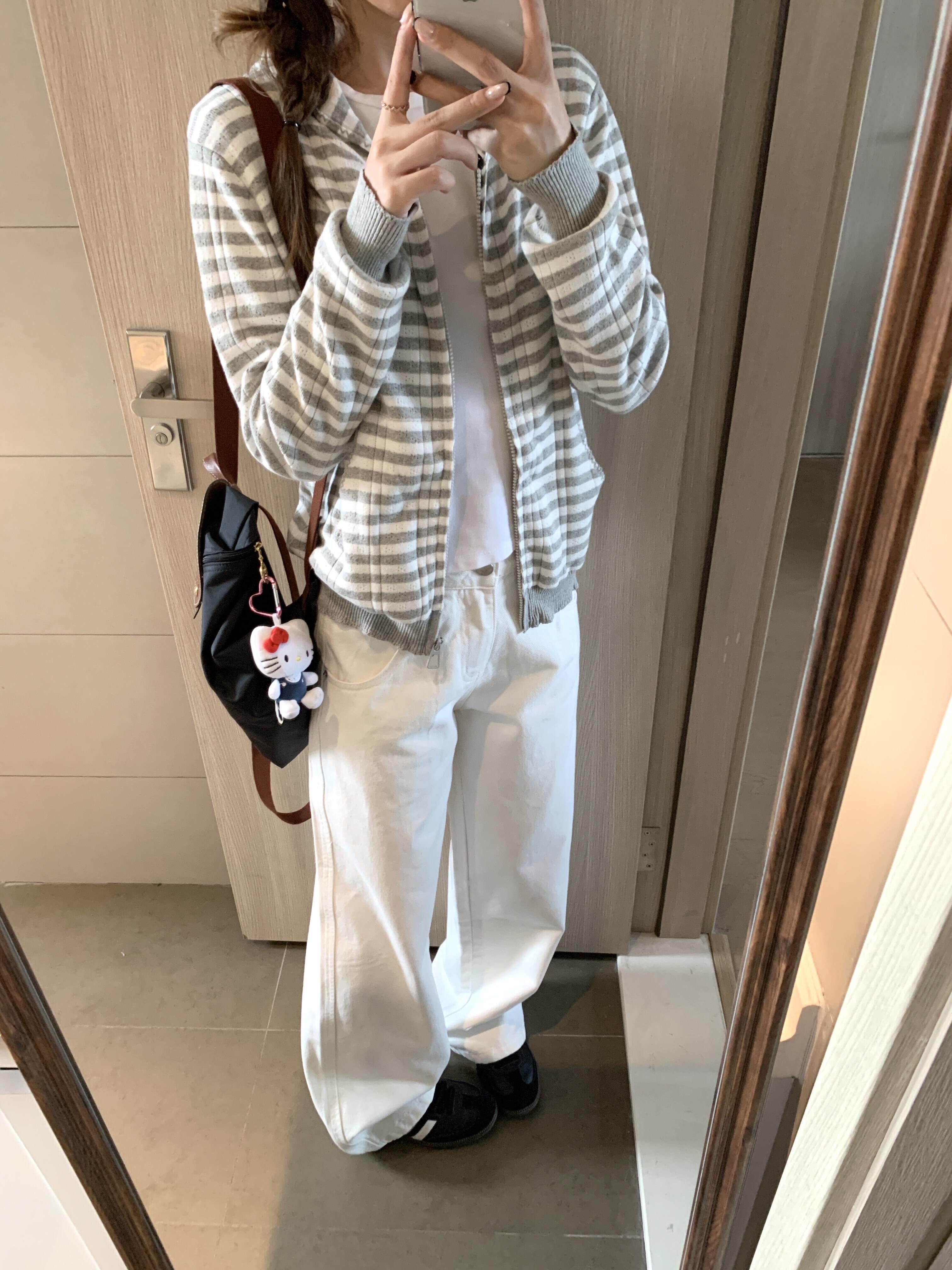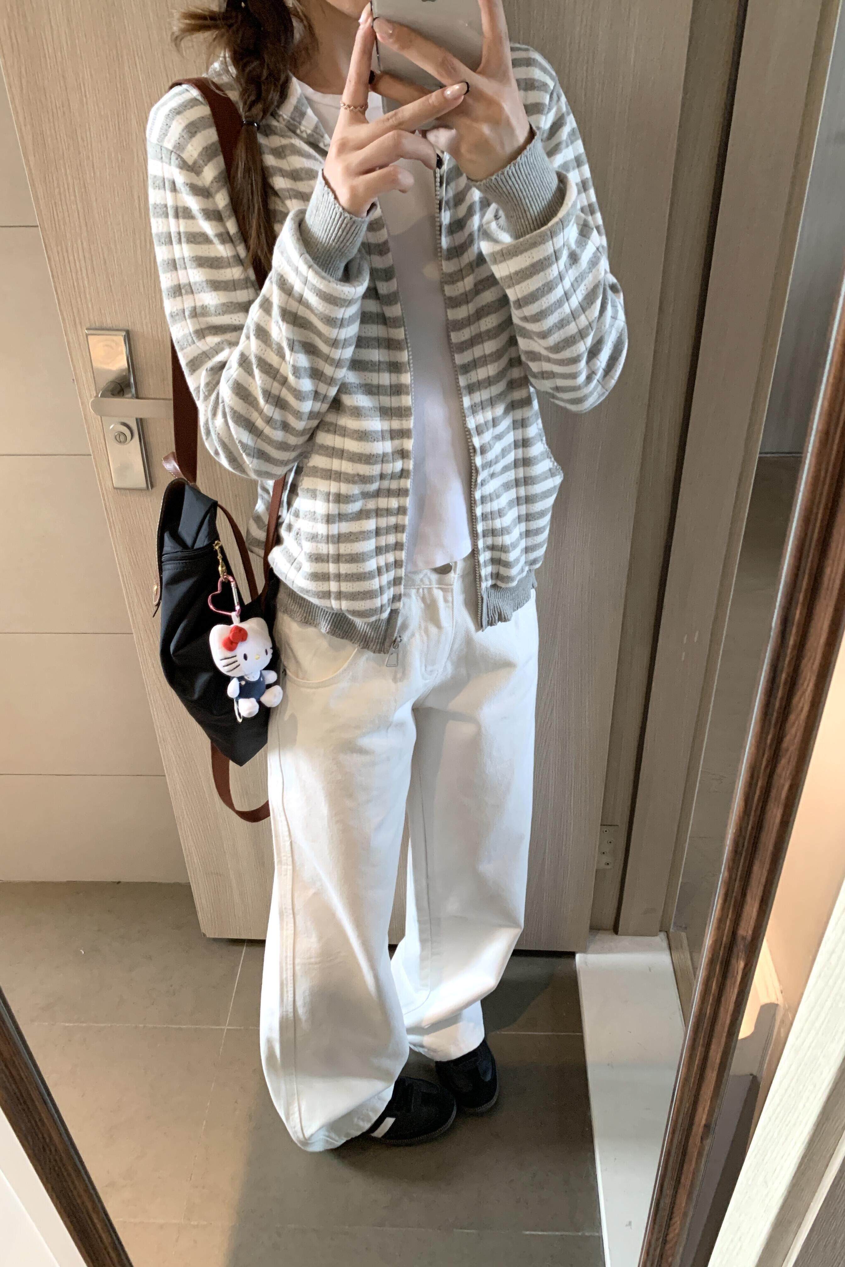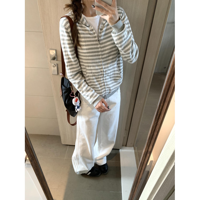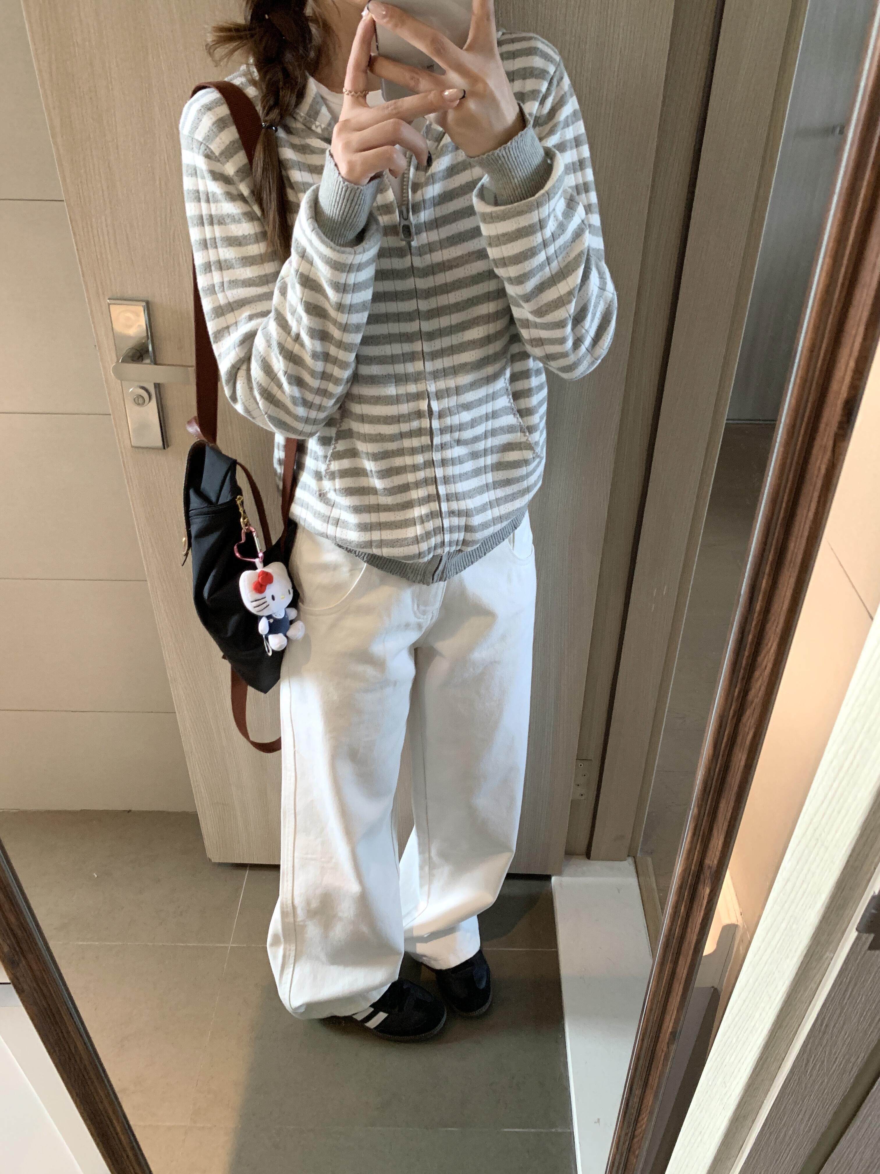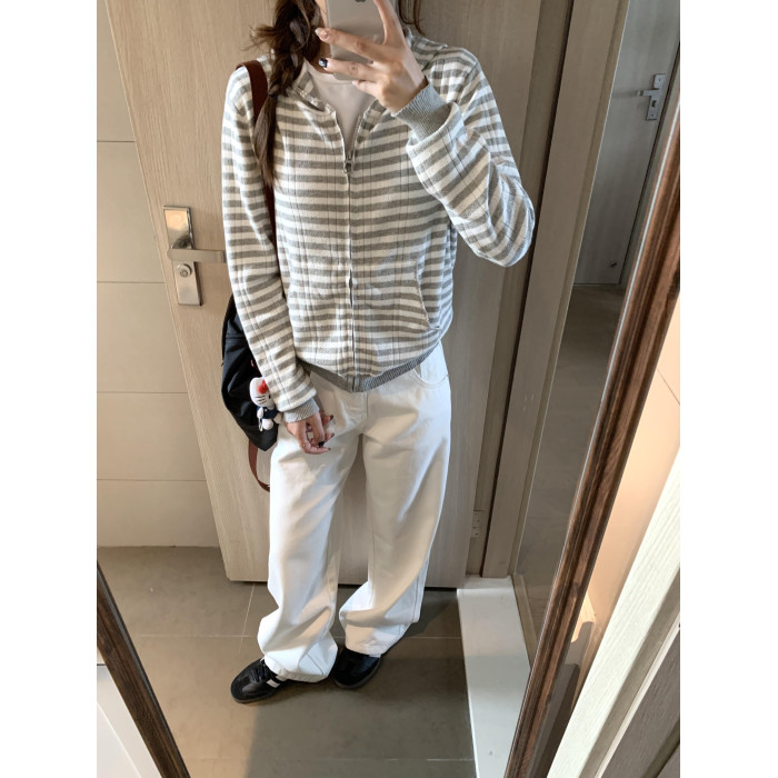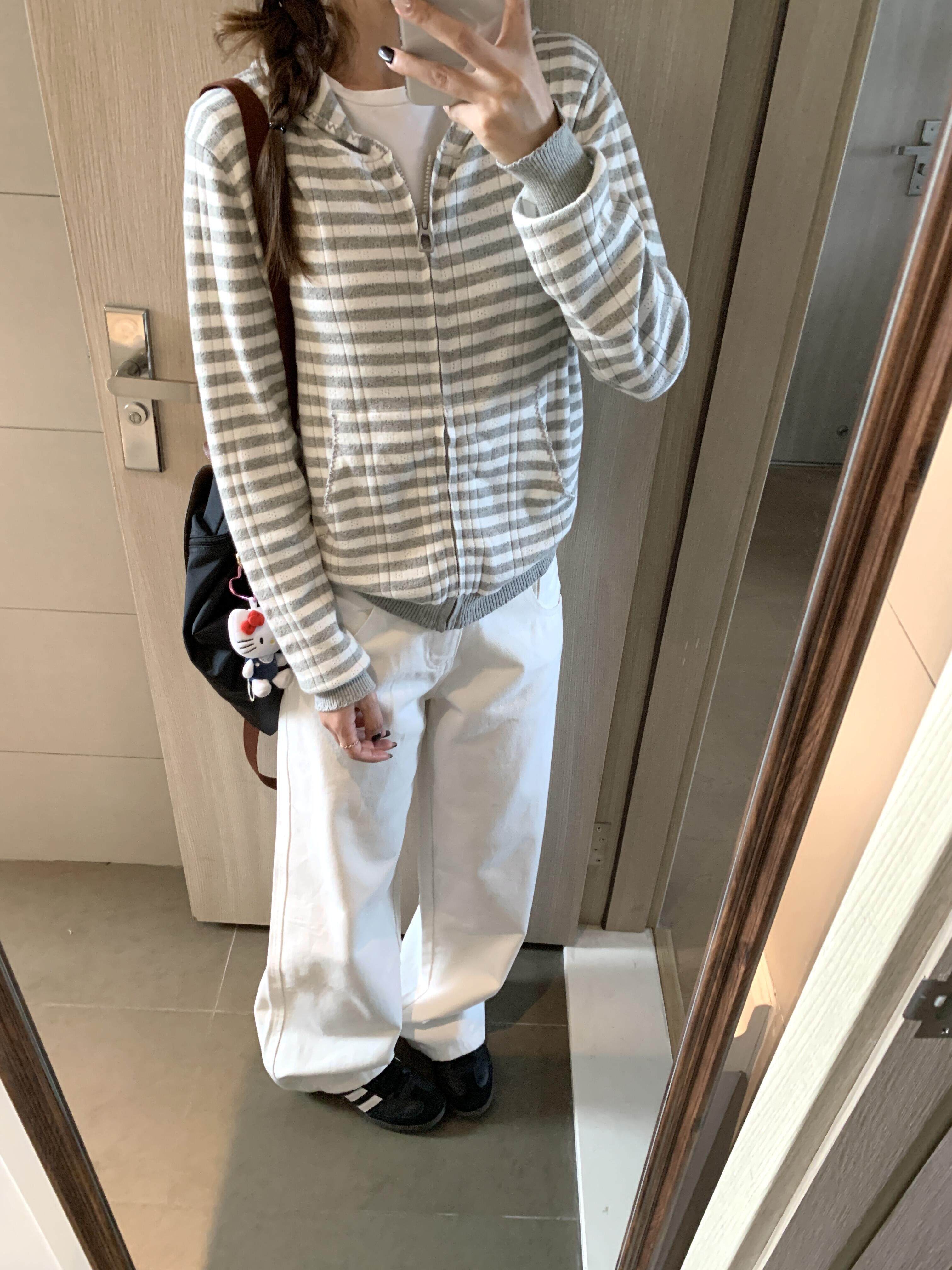 條紋連帽長袖針織衫外套女2025秋季新款韓系顯瘦短款開衫上衣chic