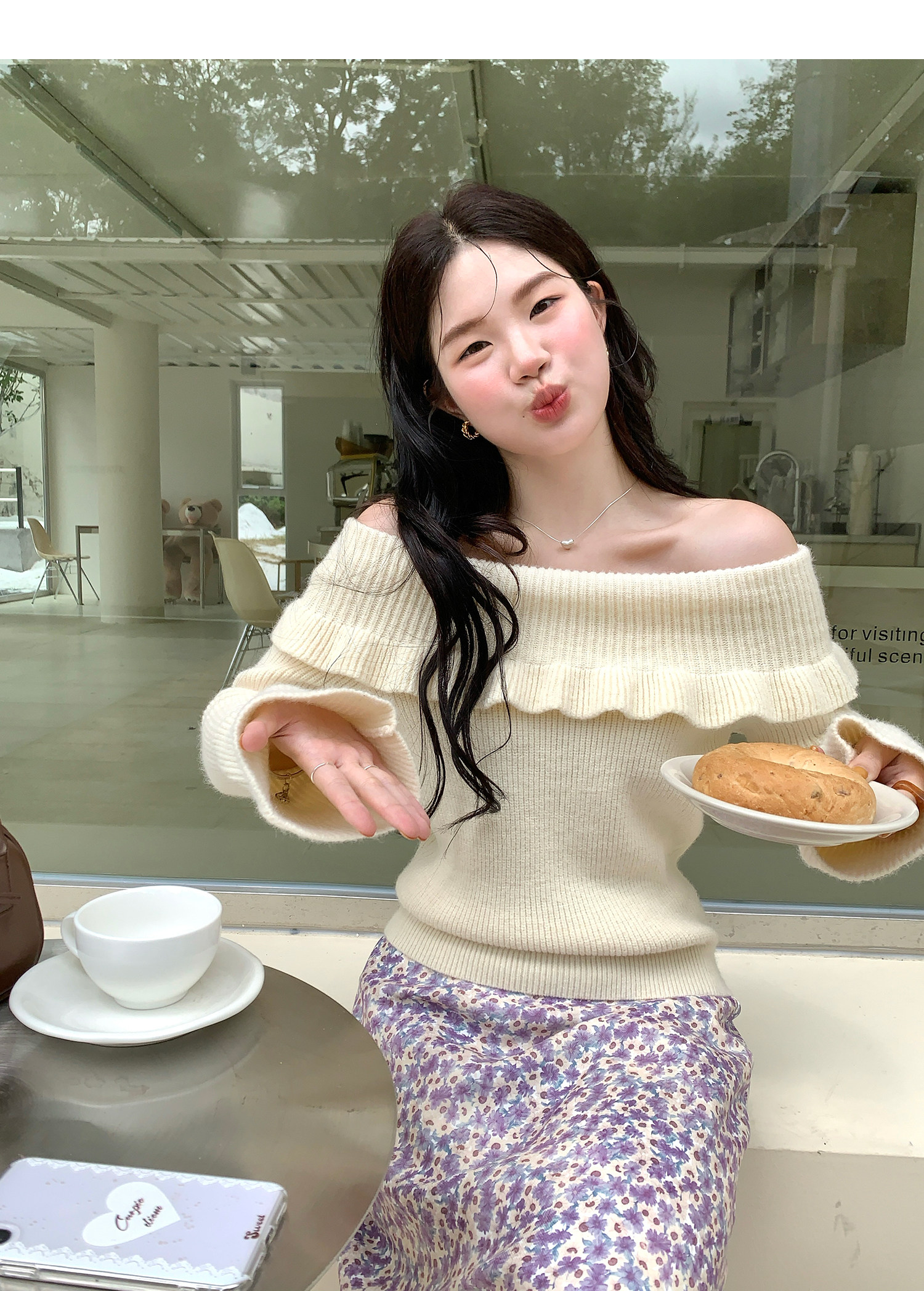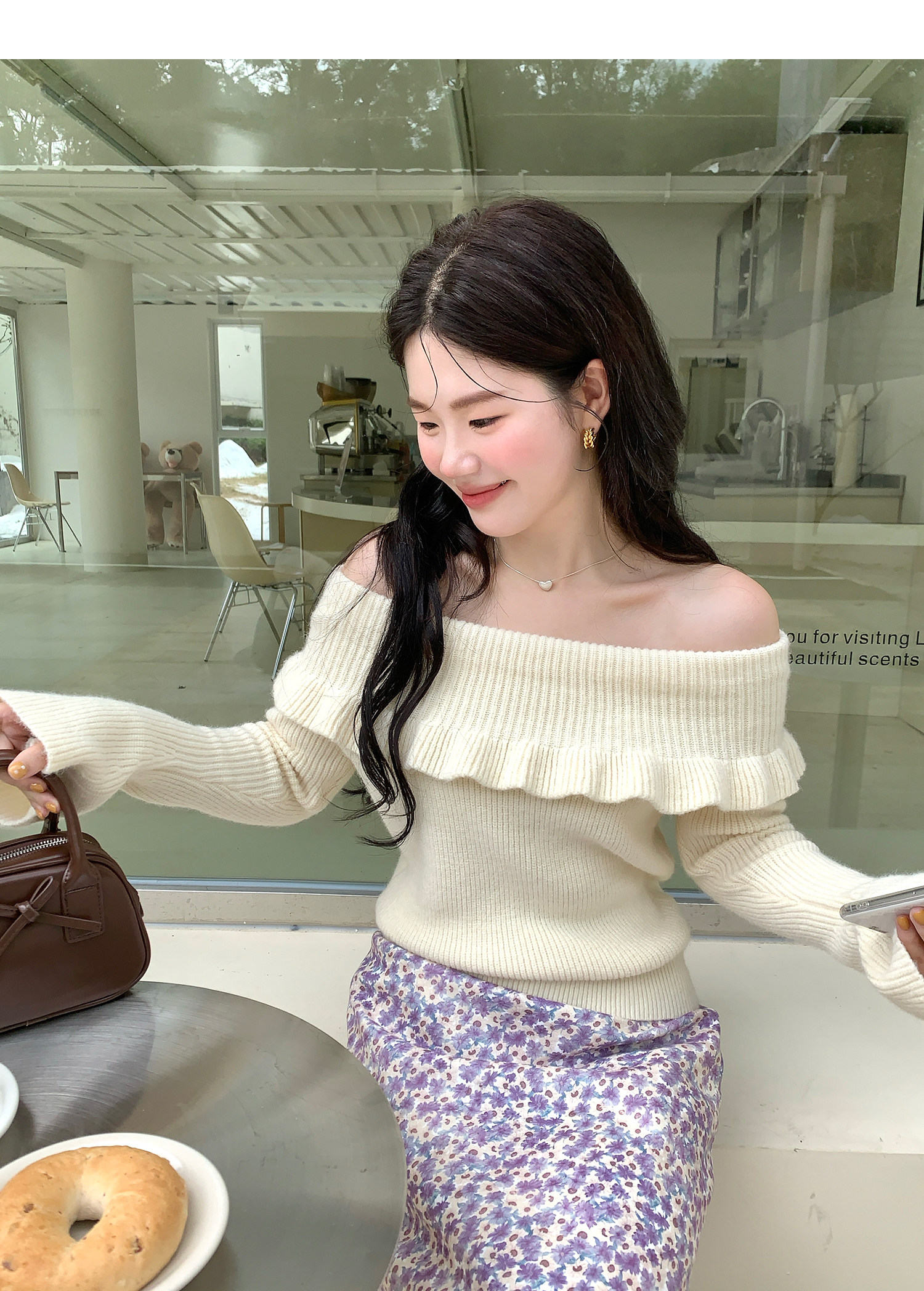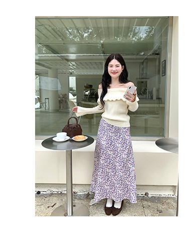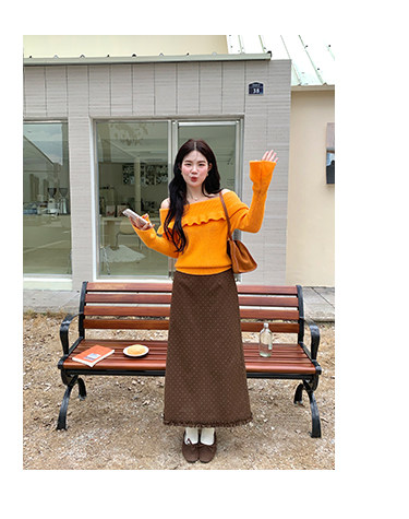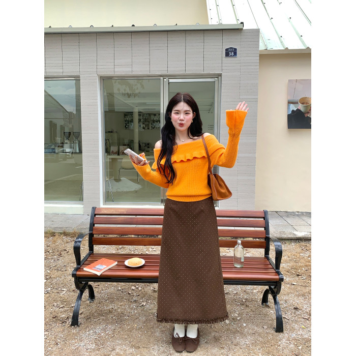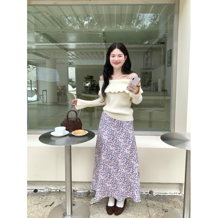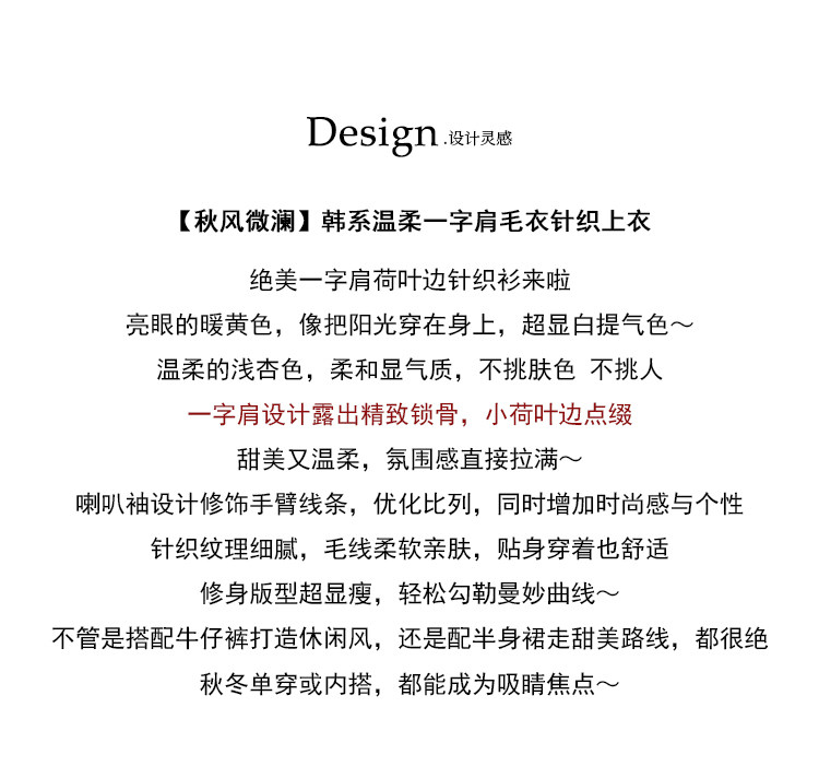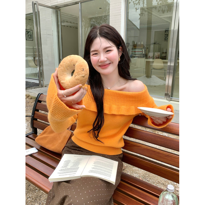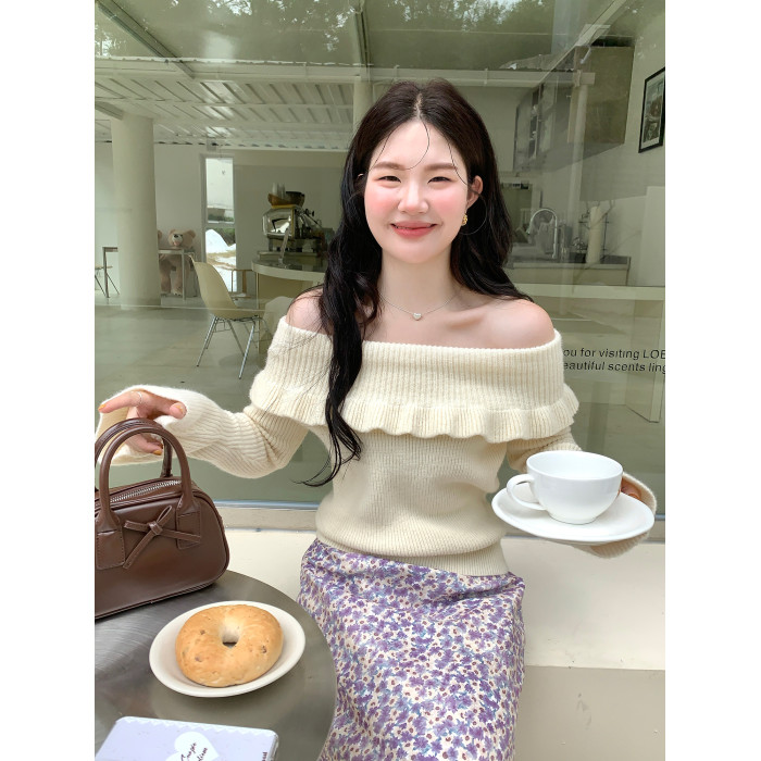 火火火【秋風微瀾】韓版溫柔風一字肩毛衣女修身露肩氣質針織衫