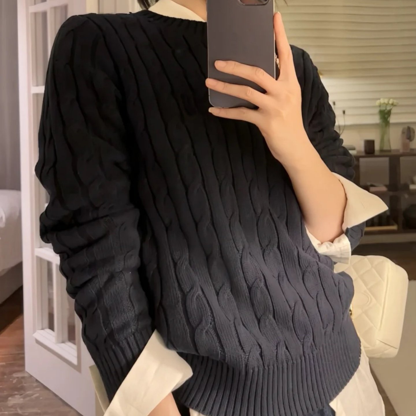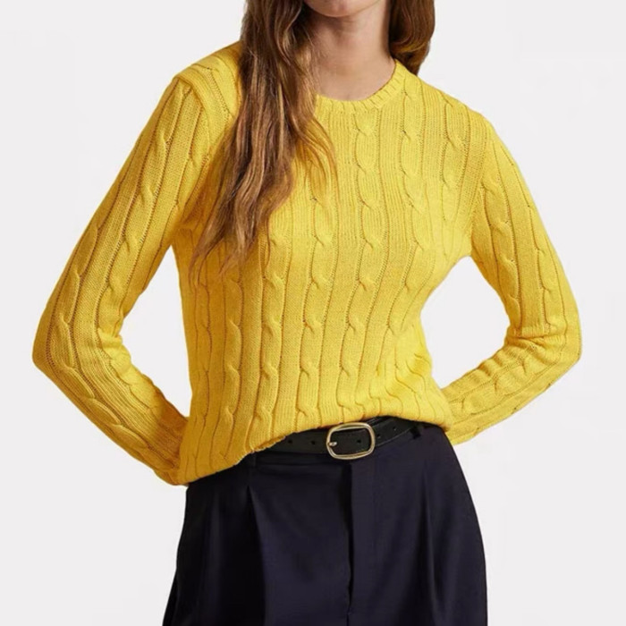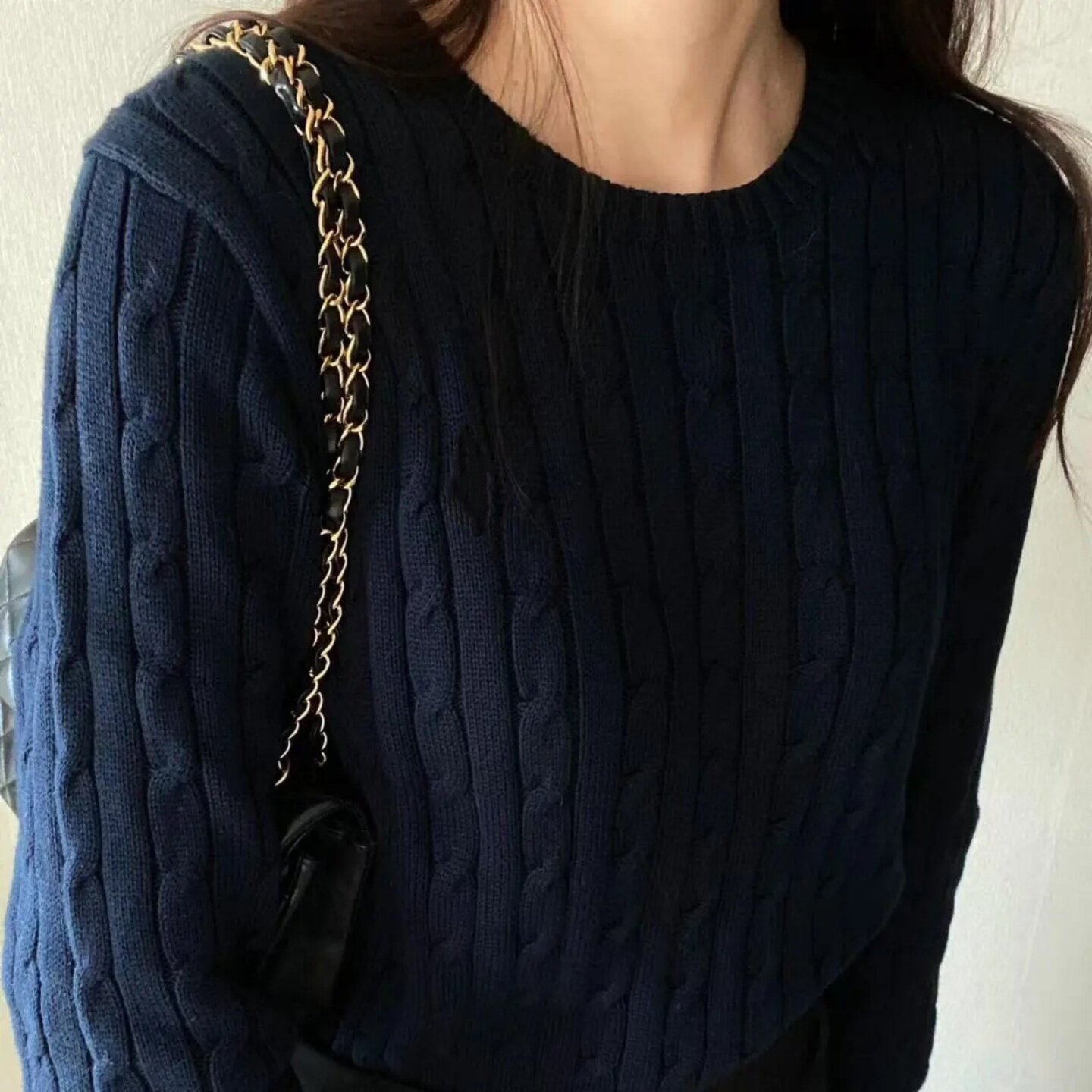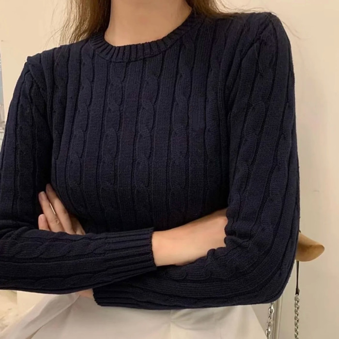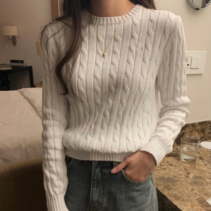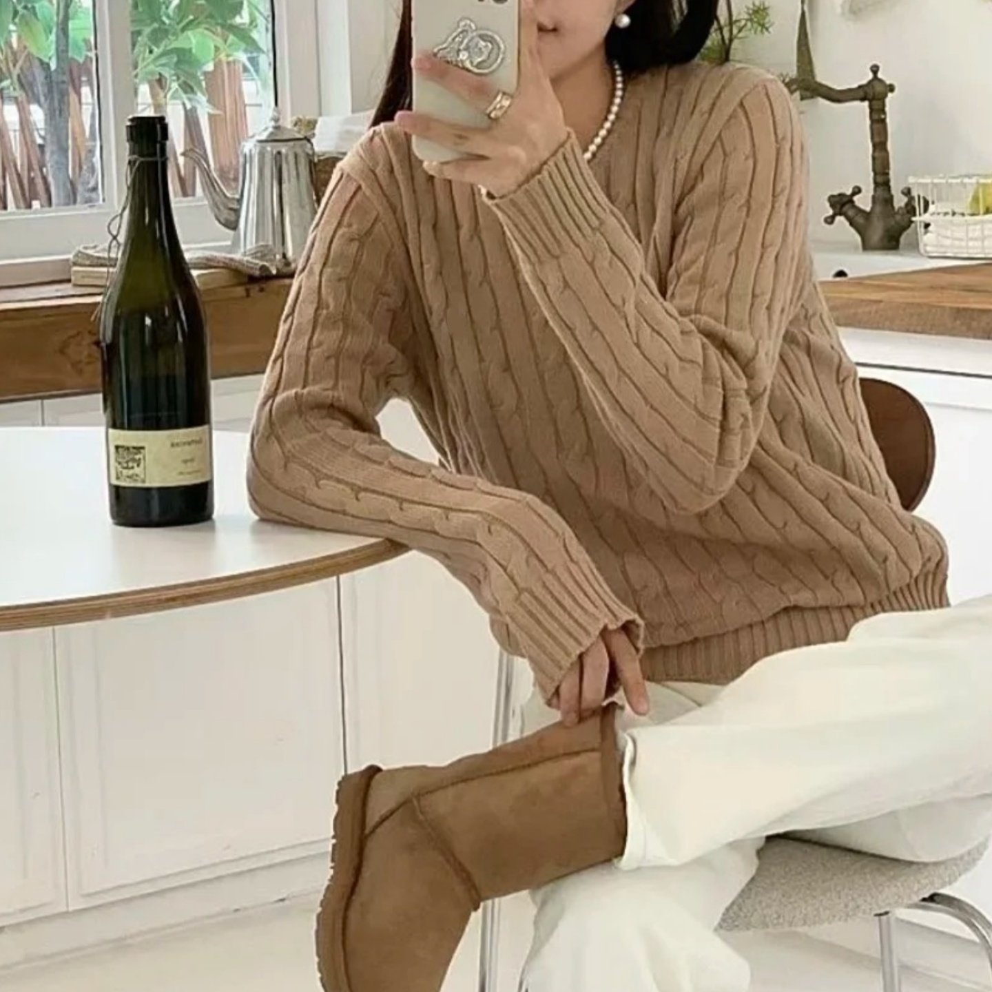妞妞家秋季新品女士純棉圓領復古麻花長袖經典百搭套頭毛衣8590