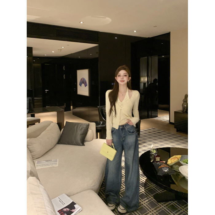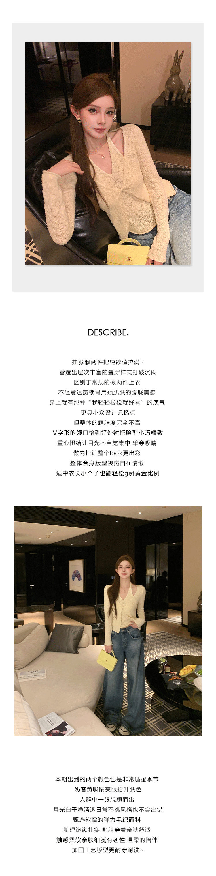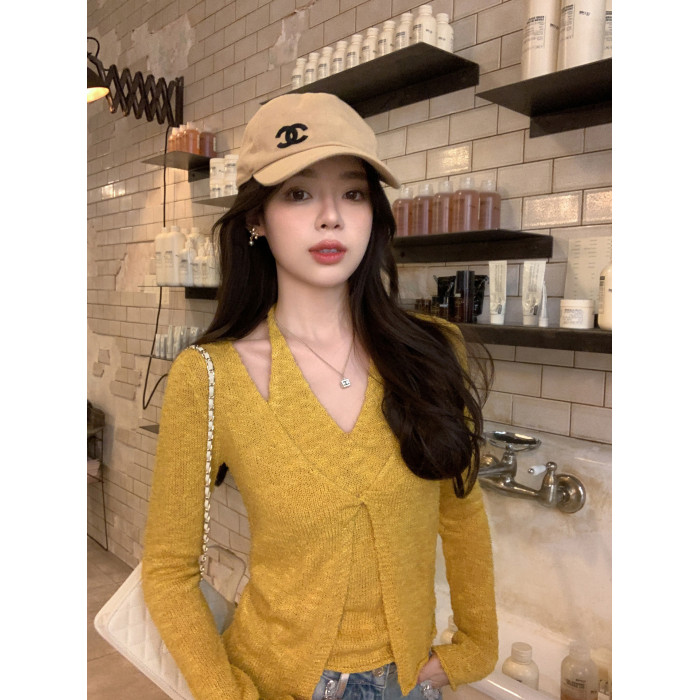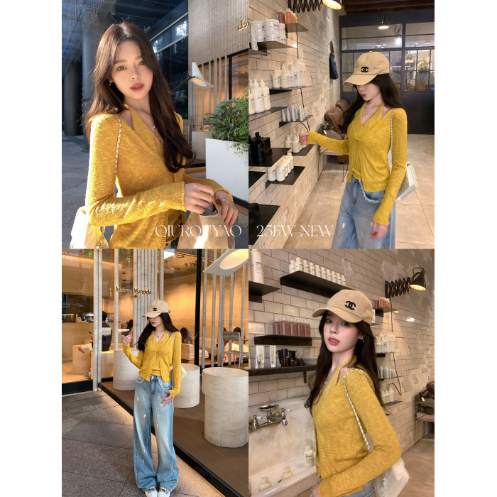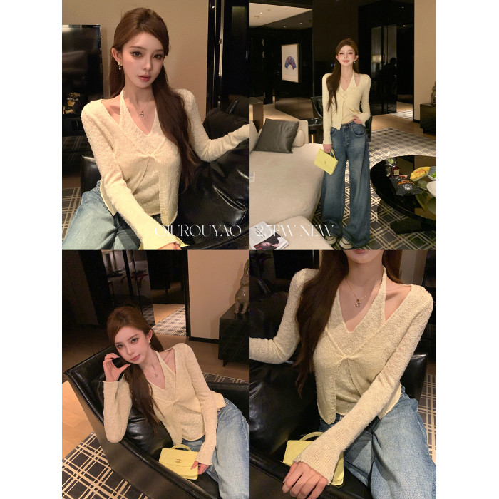邱肉瑤 扭結假兩件掛脖針織衫女露肩春季修身慵嬾風短款v領上衣