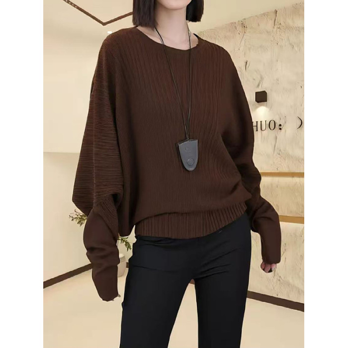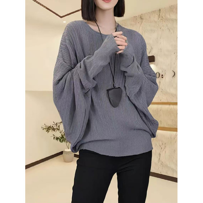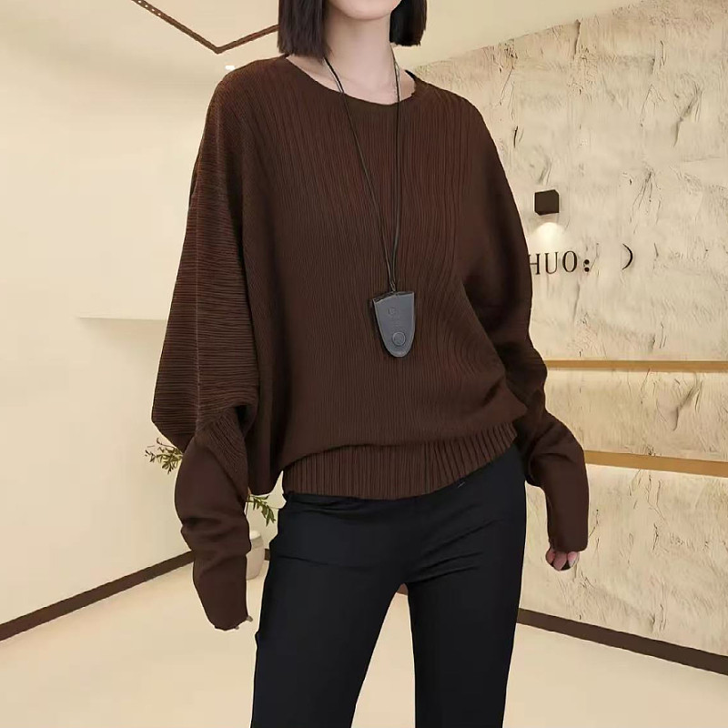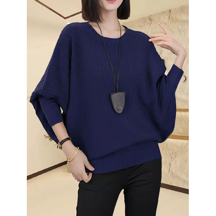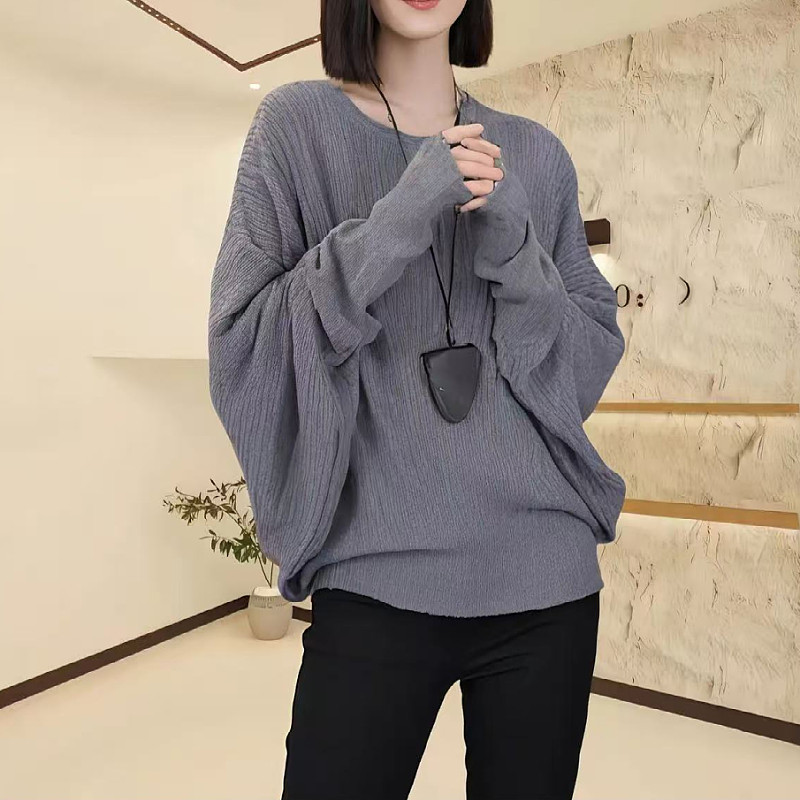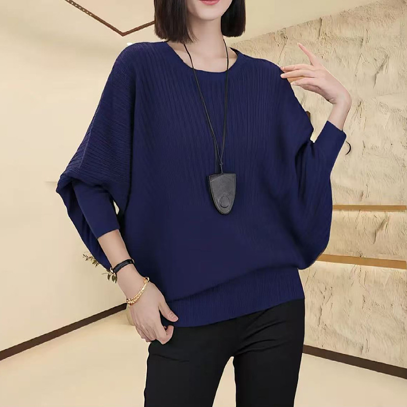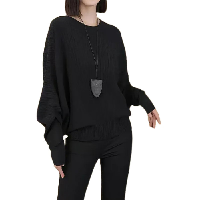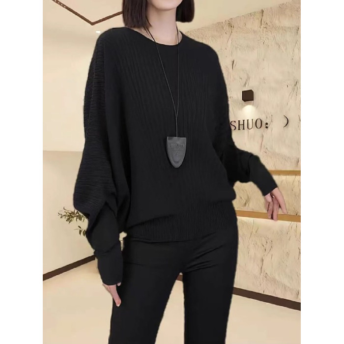 大碼女裝黑色蝙蝠袖圓領針織衫秋季新款胖mm顯瘦寬松小衫長袖上衣