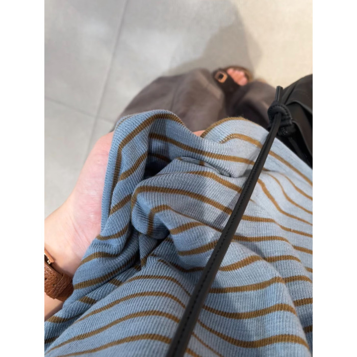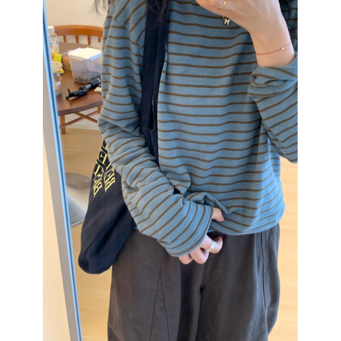 圓領撞色條紋針織長袖t恤女秋季寬松外穿百搭慵懶風顯瘦打底上衣