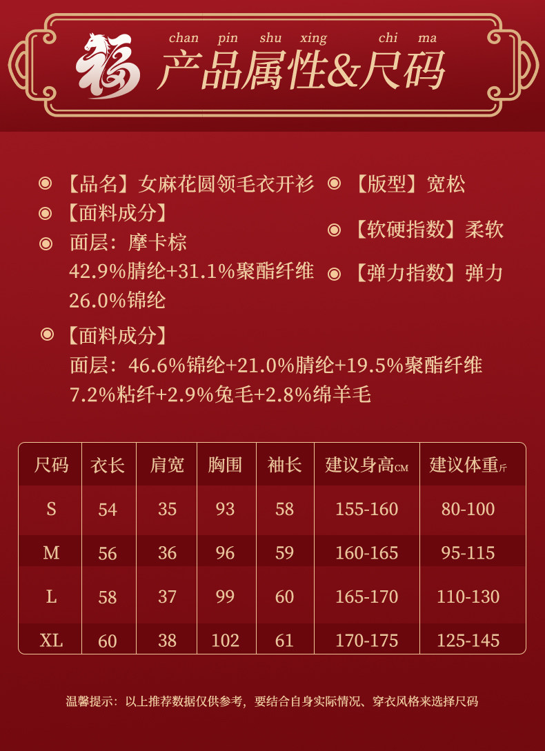 | 材質成分 | 聚醯胺纖維(錦綸)46.6% 聚丙烯腈纖維(腈綸)21% 聚酯纖維19.5% 粘膠纖維(粘纖)7.2% 兔毛2.9% 綿羊毛2.8% |