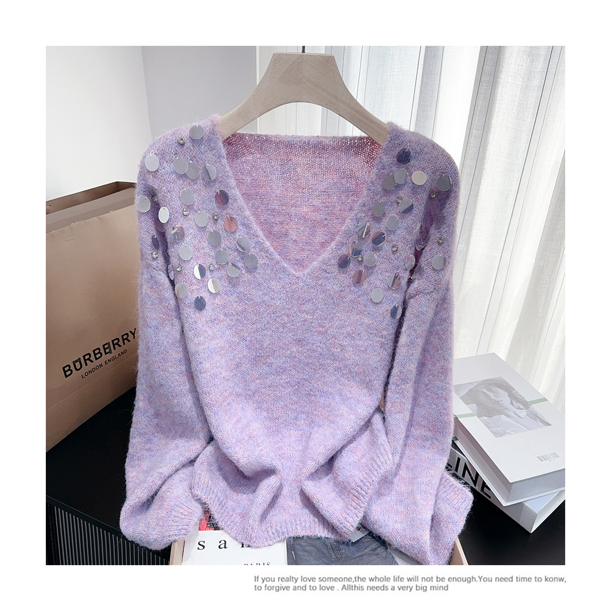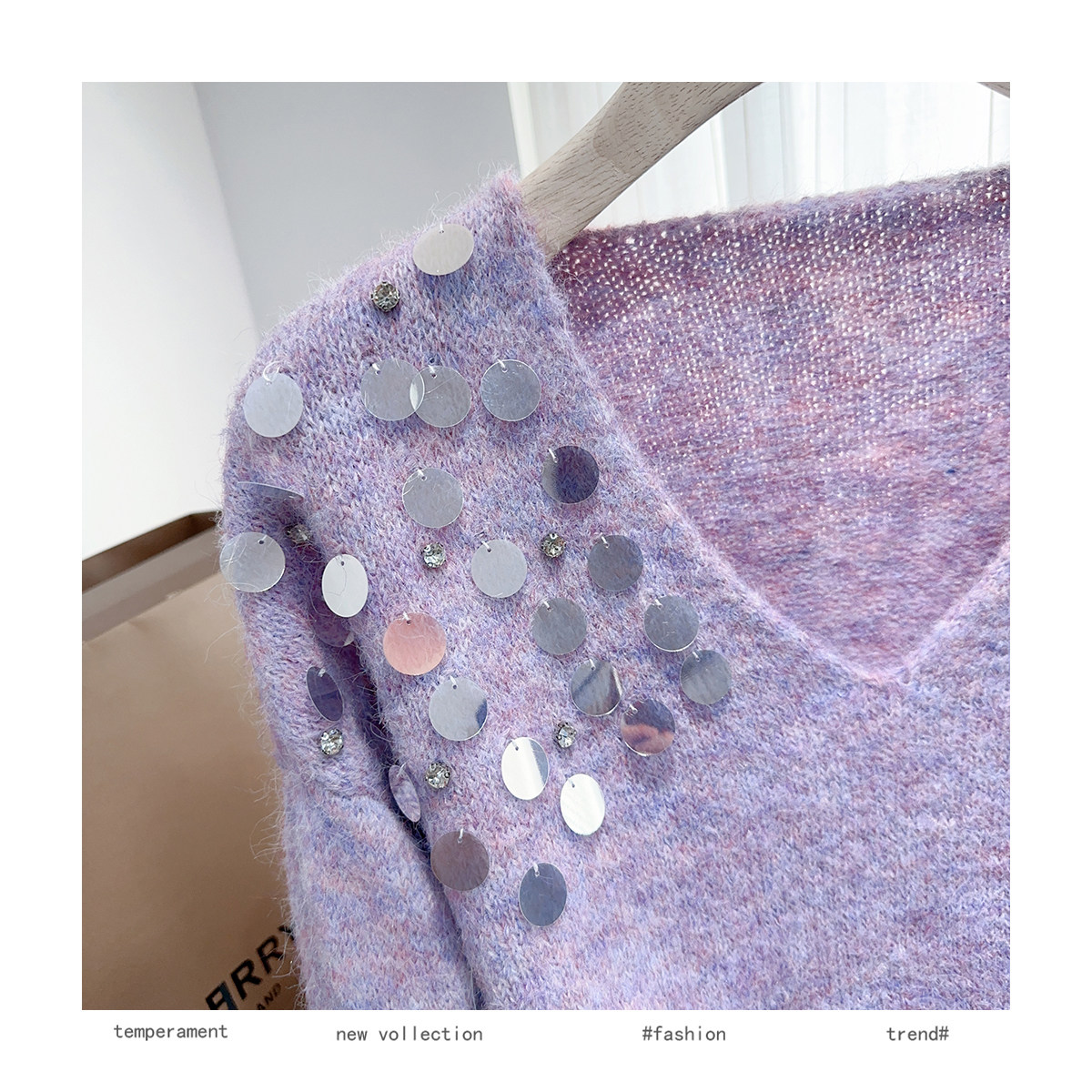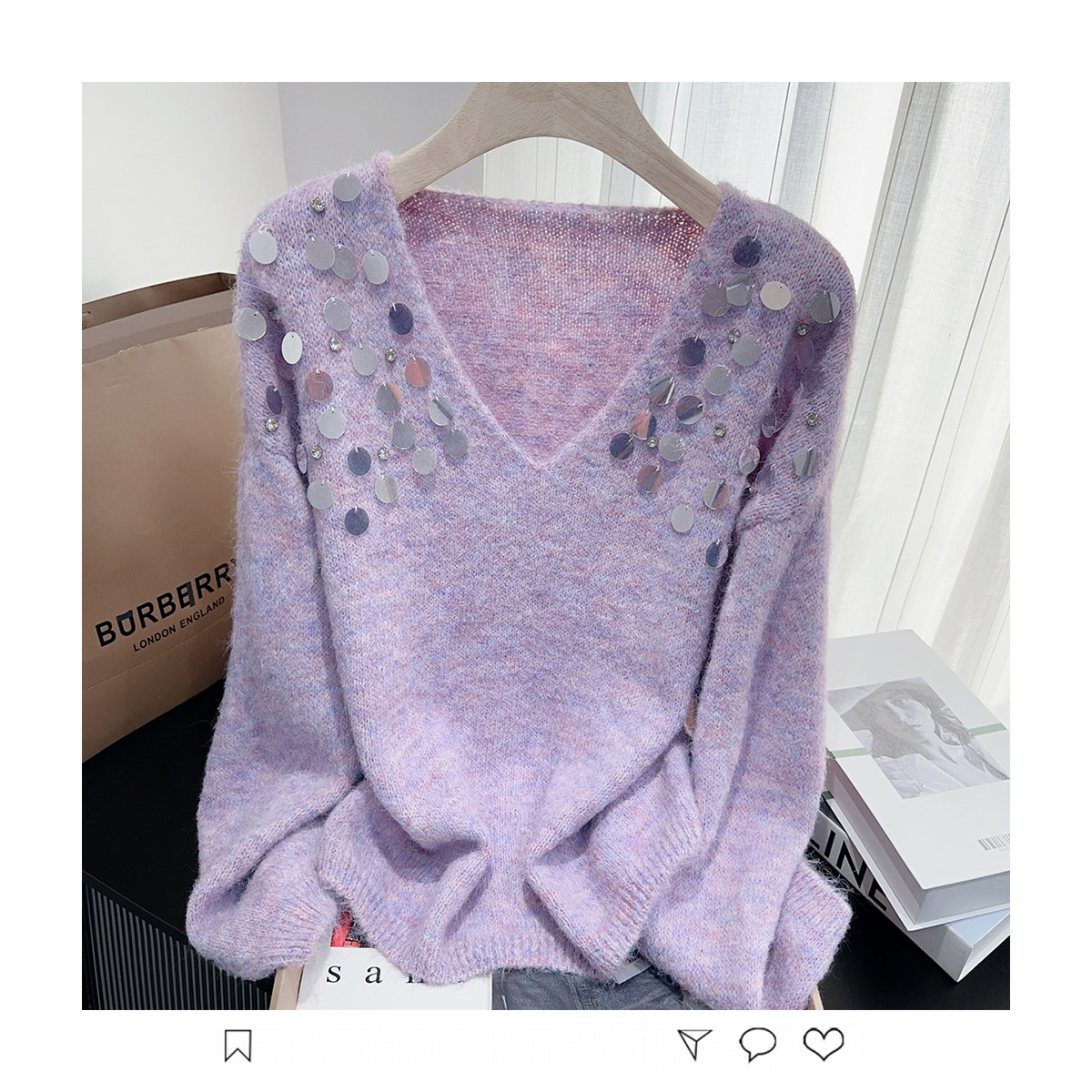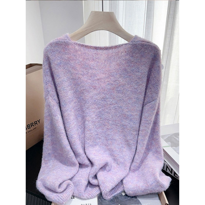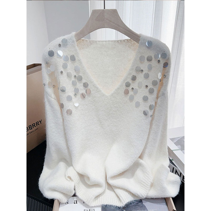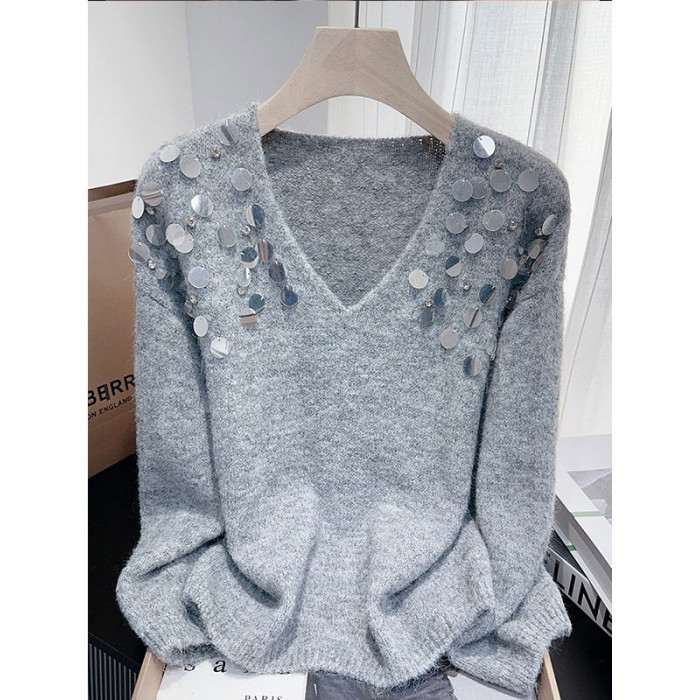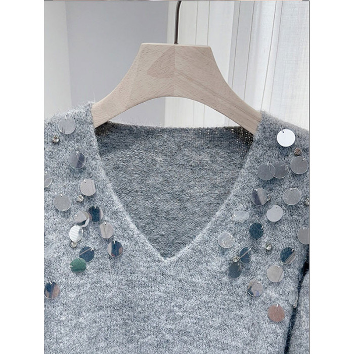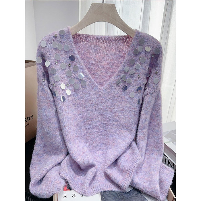 紫色亮片鑲鑽V領慵嬾毛衣女秋季寬鬆法式絕美洋氣軟糯針織衫上衣
