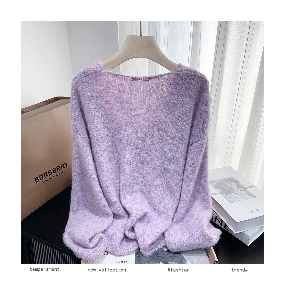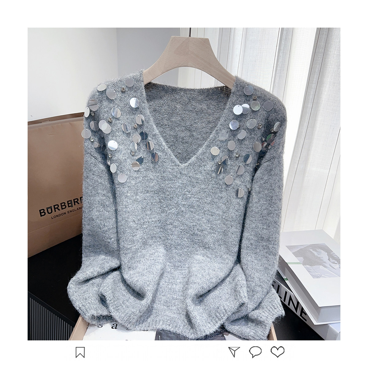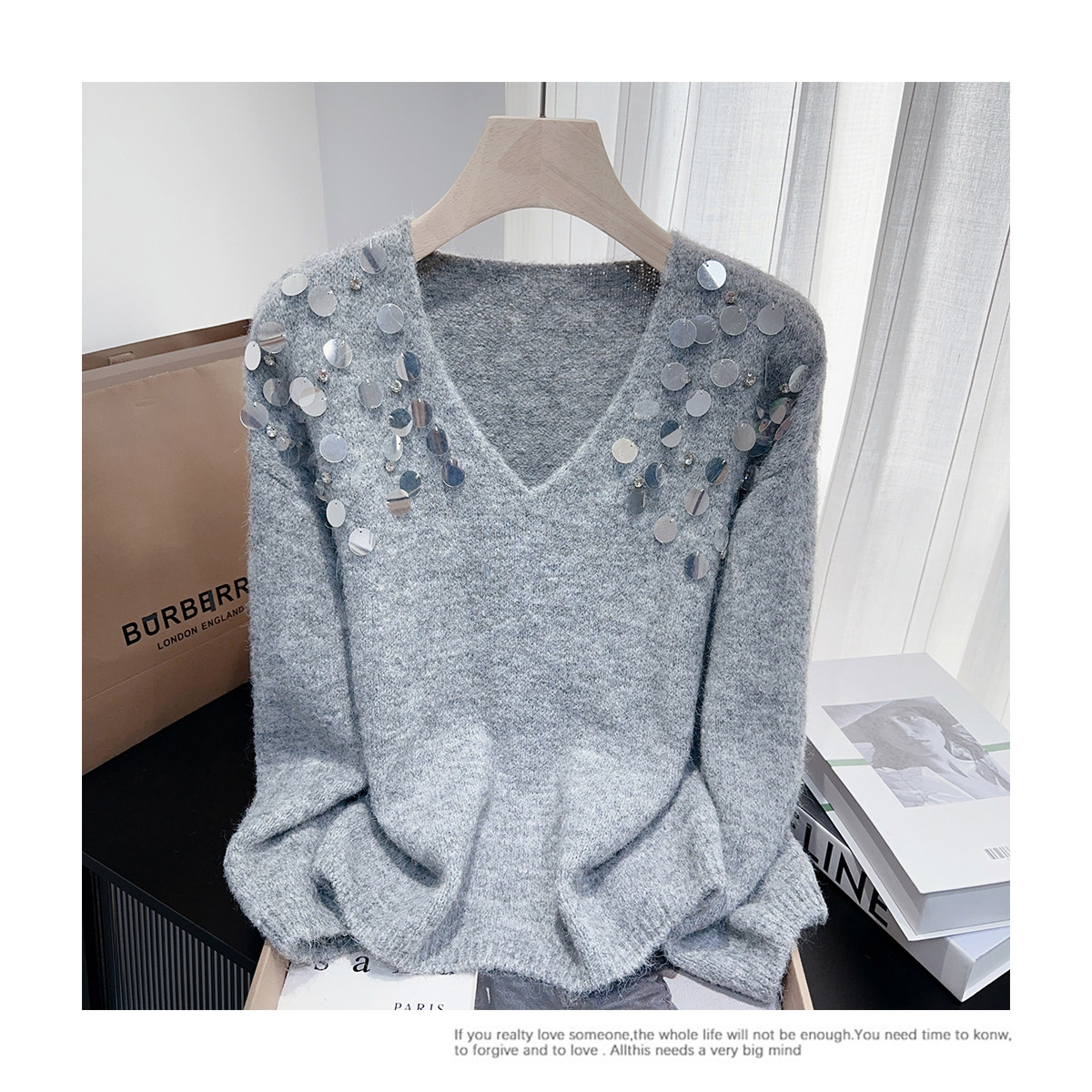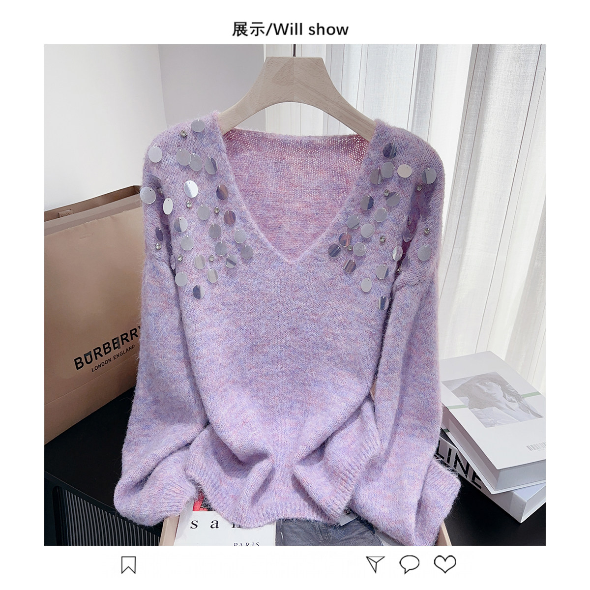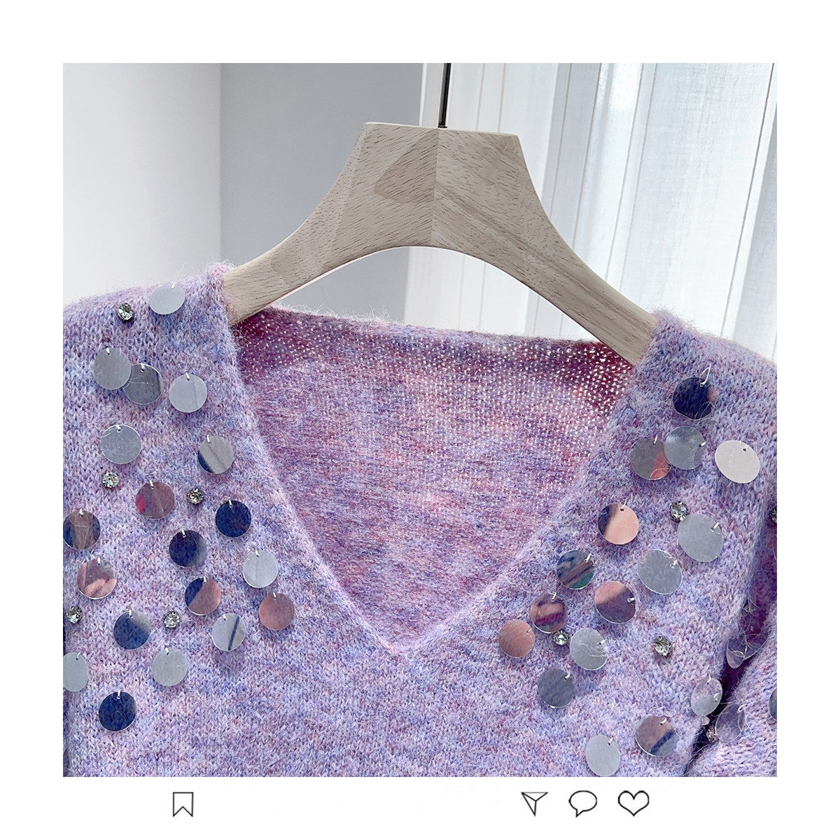 紫色亮片鑲鑽V領慵嬾毛衣女秋季寬鬆法式絕美洋氣軟糯針織衫上衣