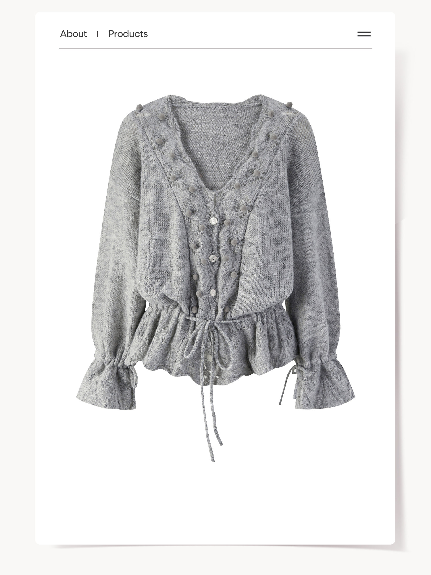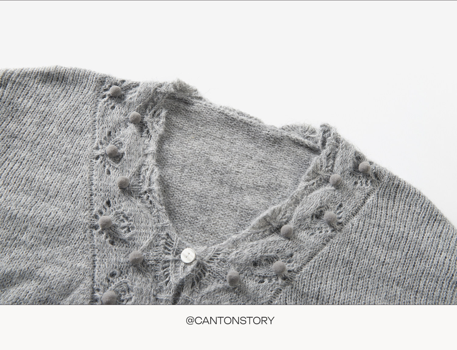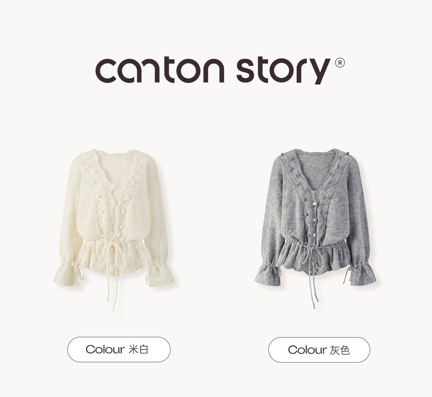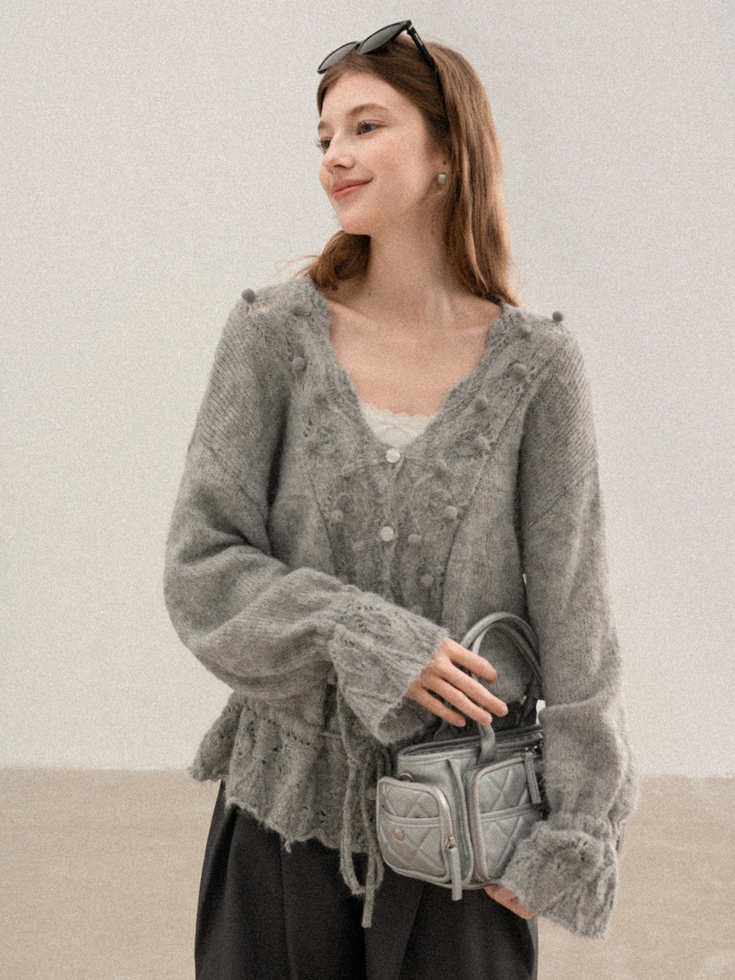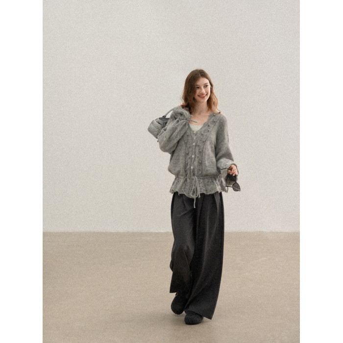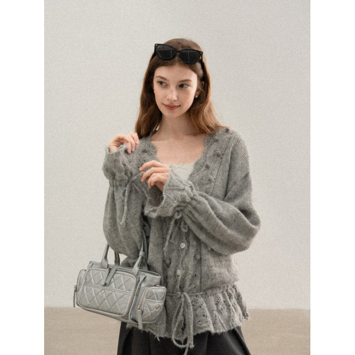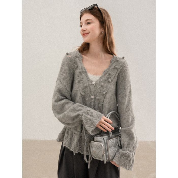 羊城故事 灰色鏤空鉤花v領長袖針織毛衣女秋季新款甜美收腰上衣