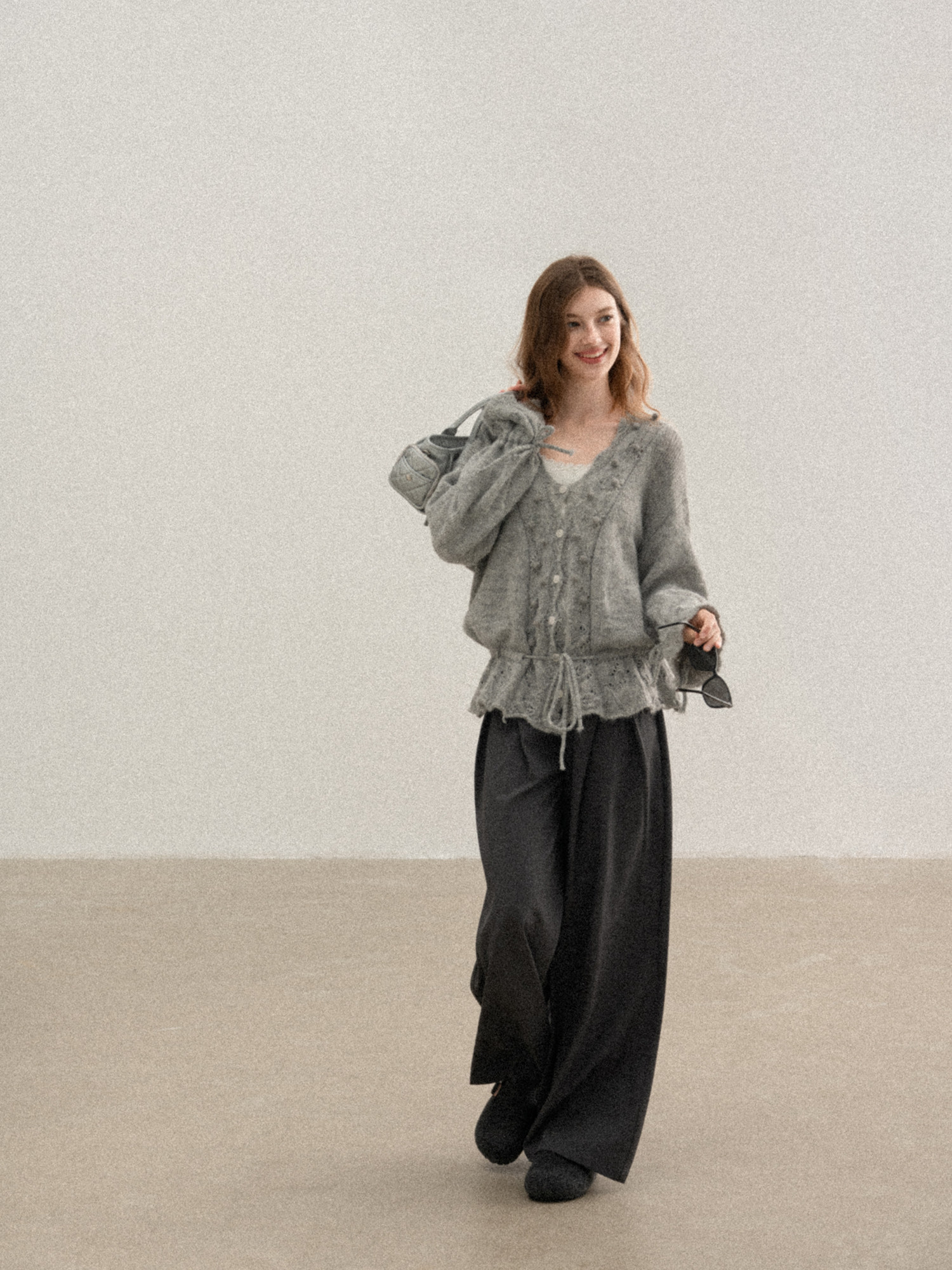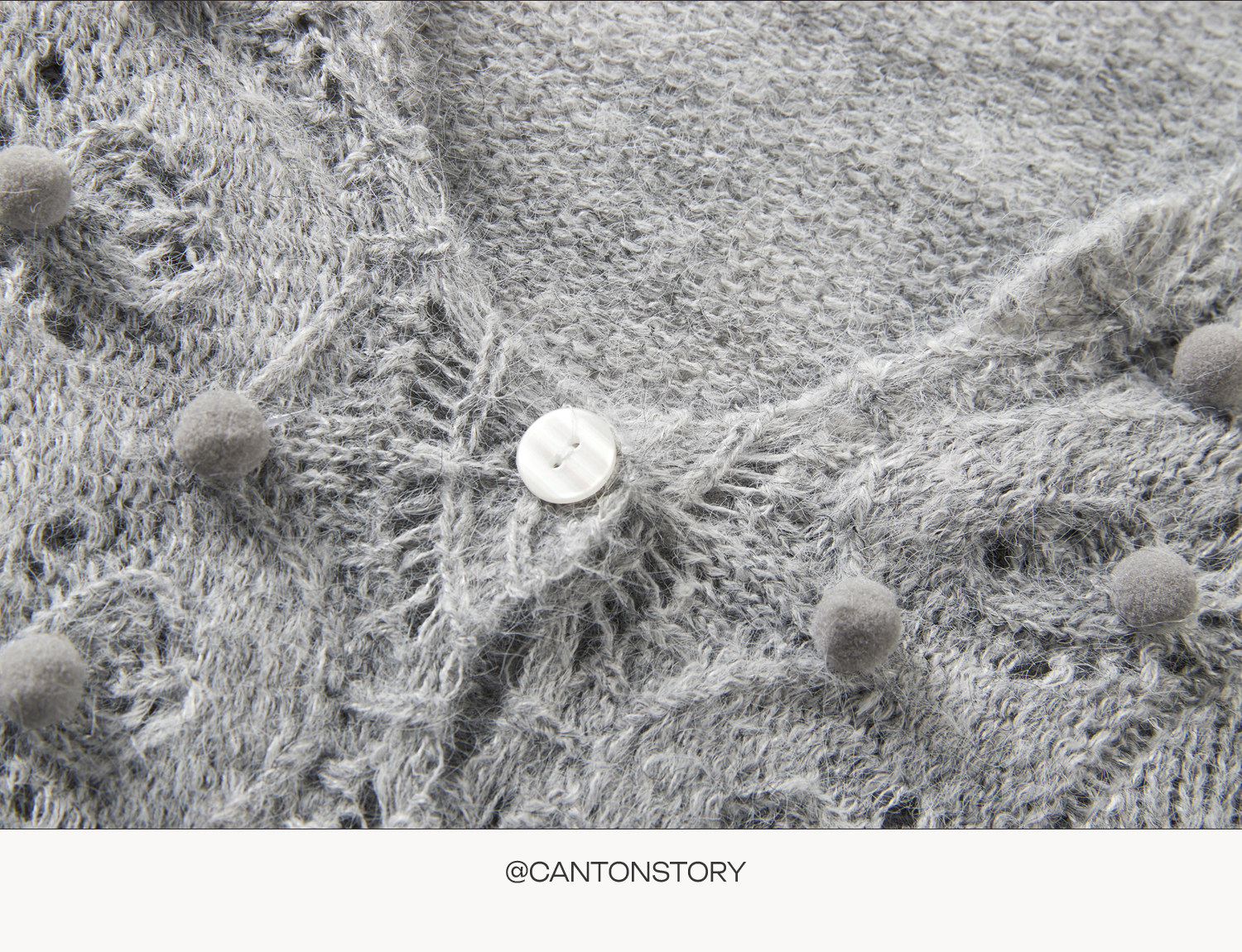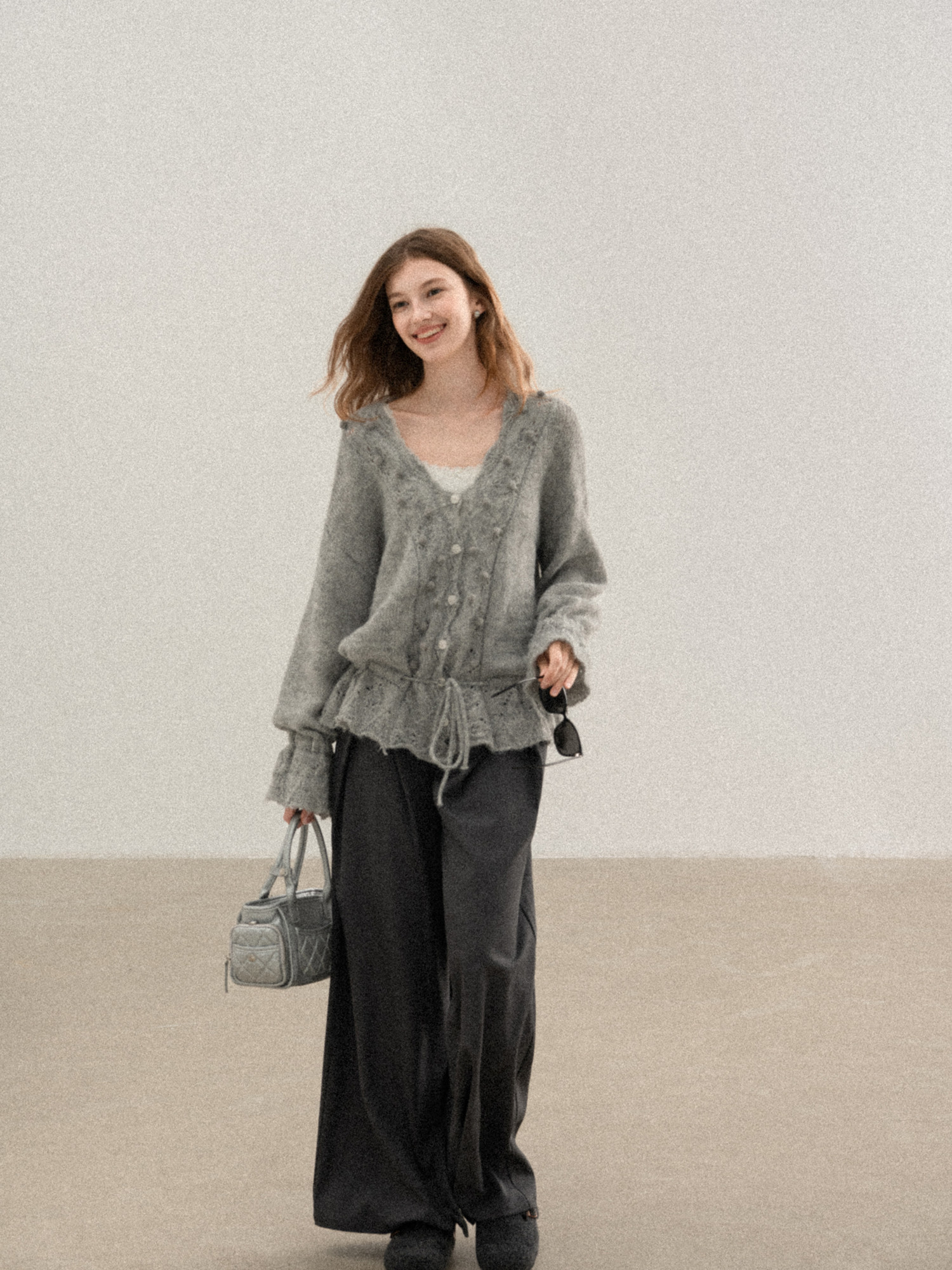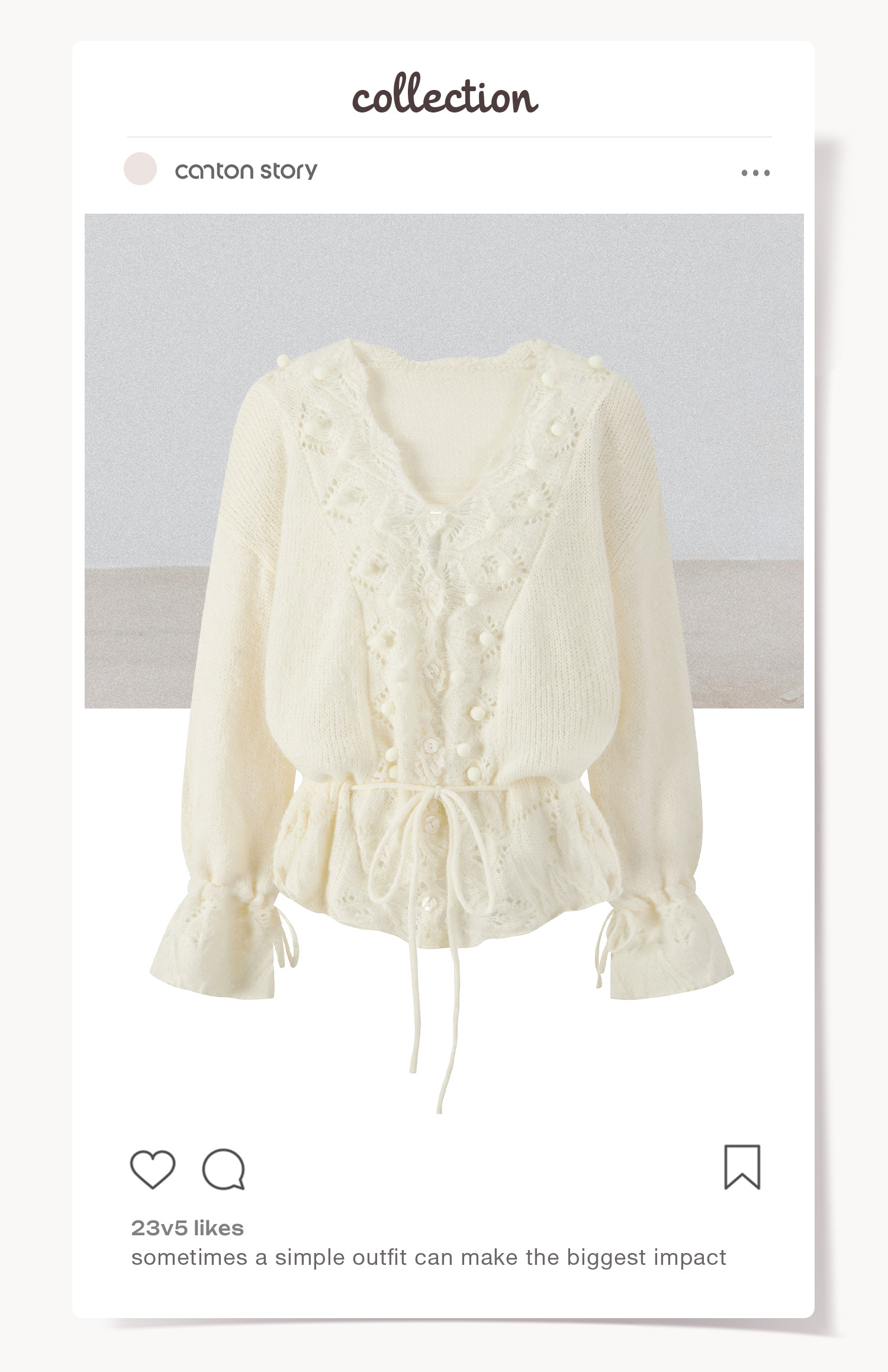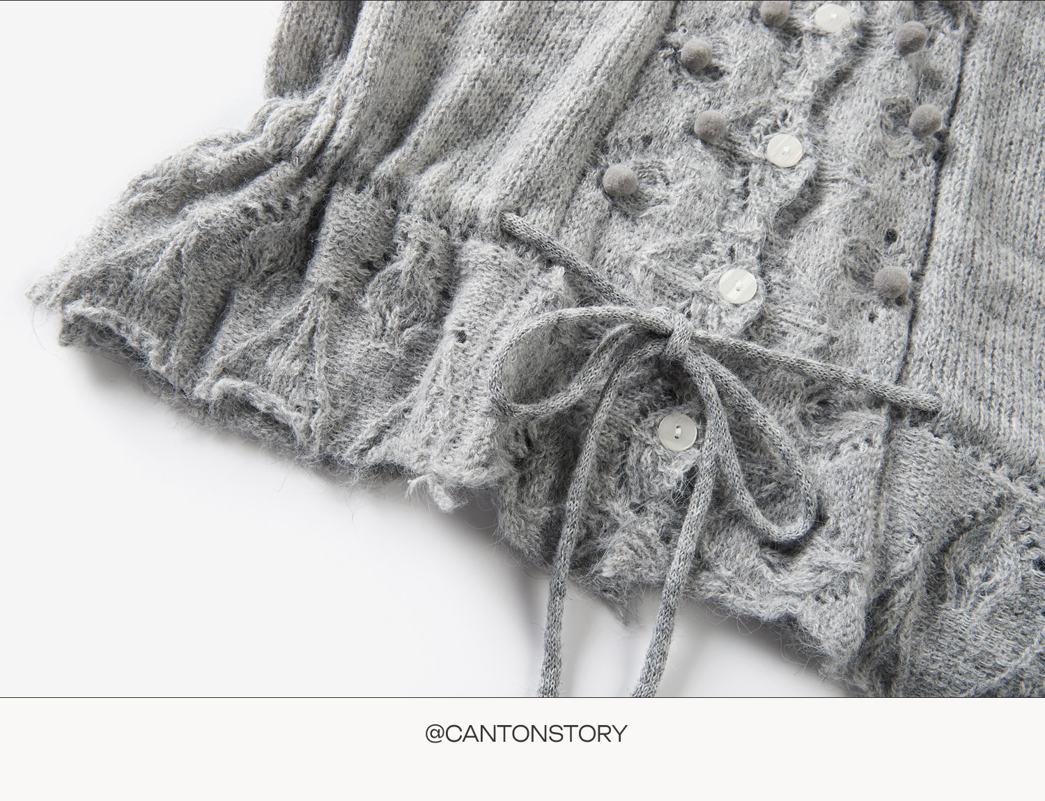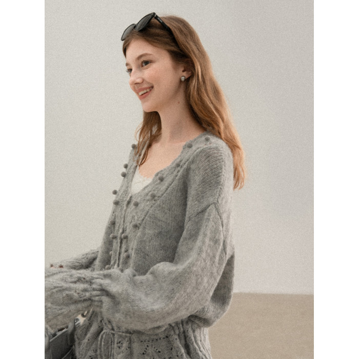 羊城故事 灰色鏤空鉤花v領長袖針織毛衣女秋季新款甜美收腰上衣