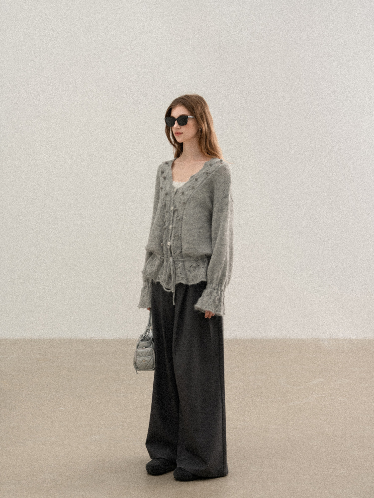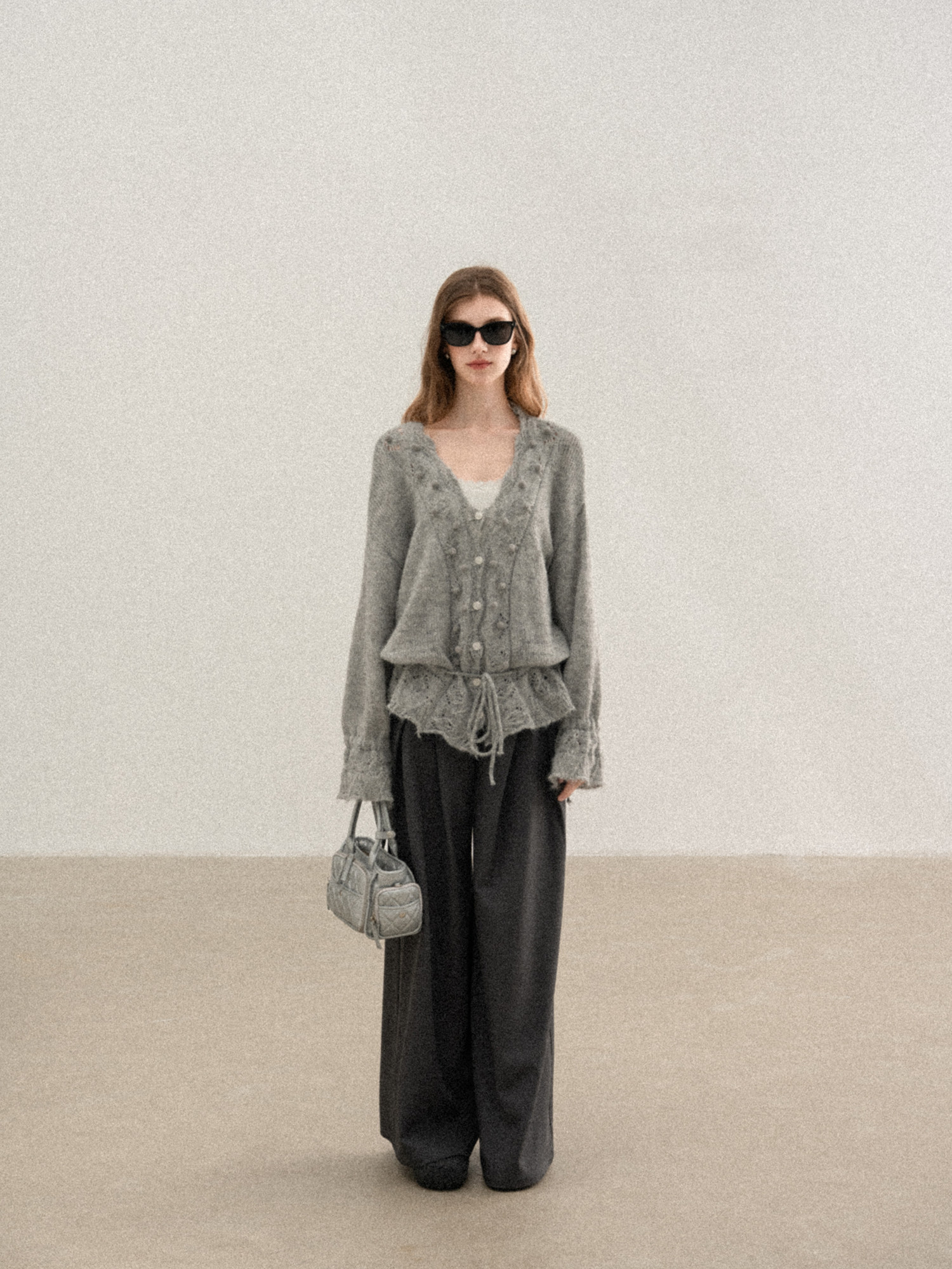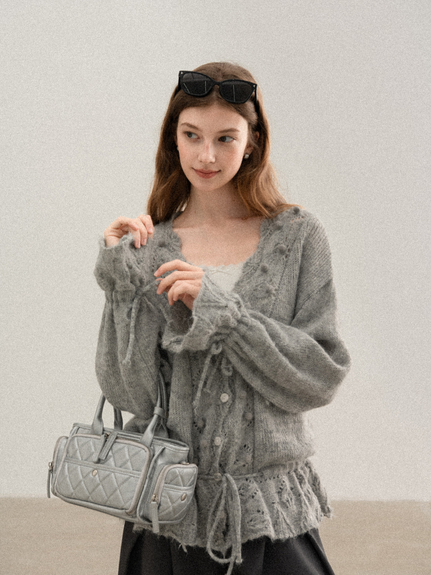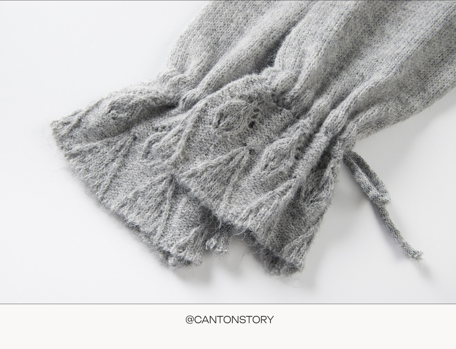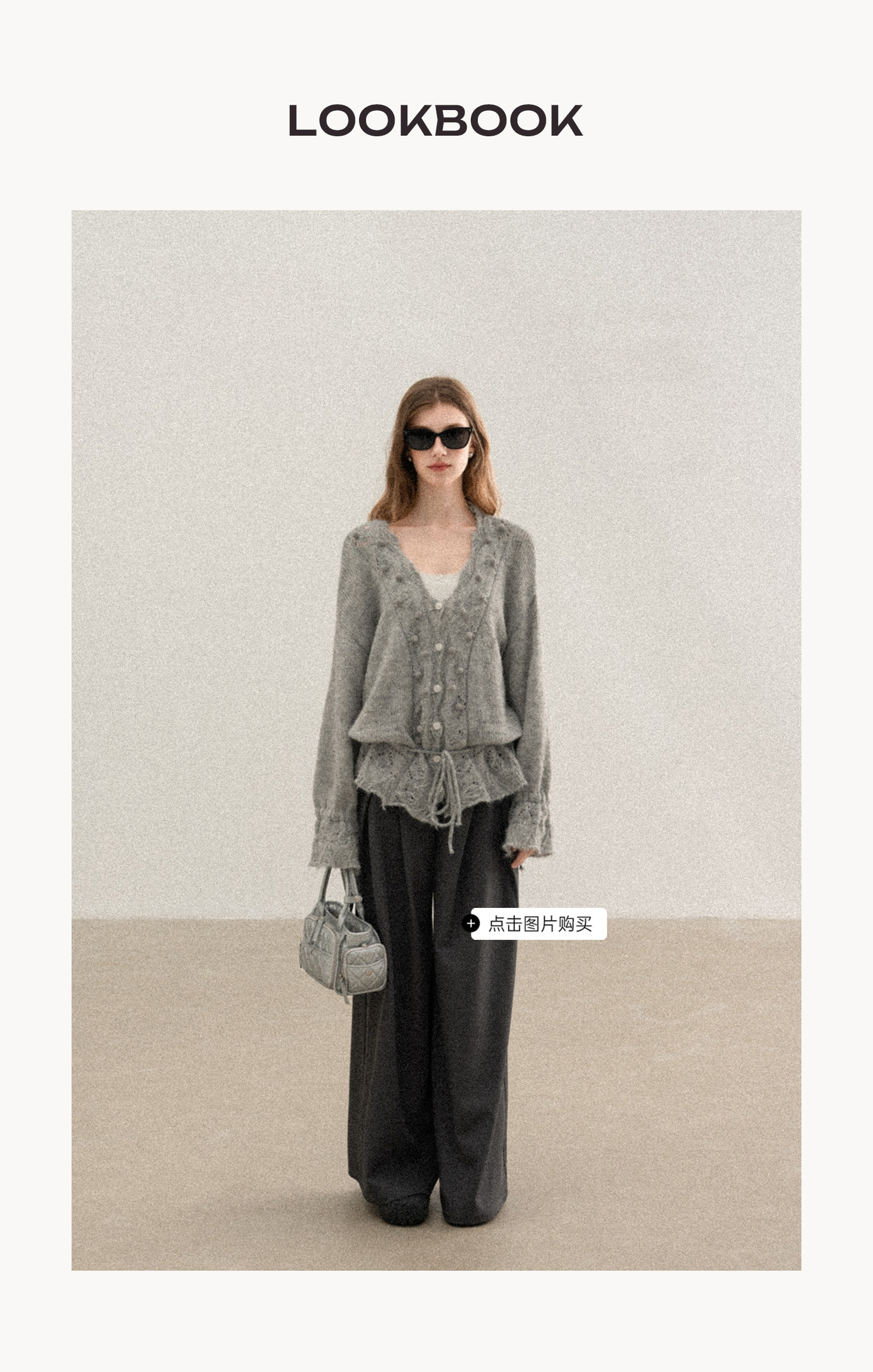 羊城故事 灰色鏤空鉤花v領長袖針織毛衣女秋季新款甜美收腰上衣