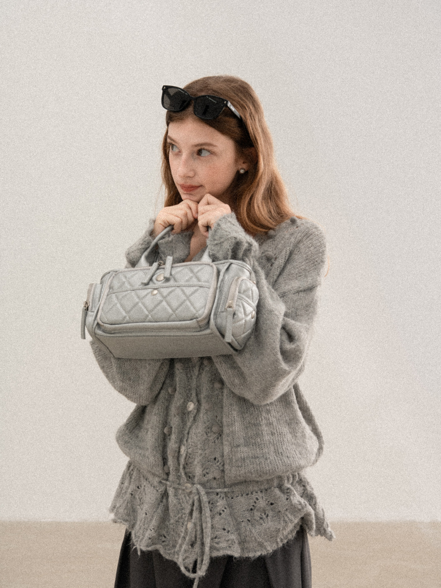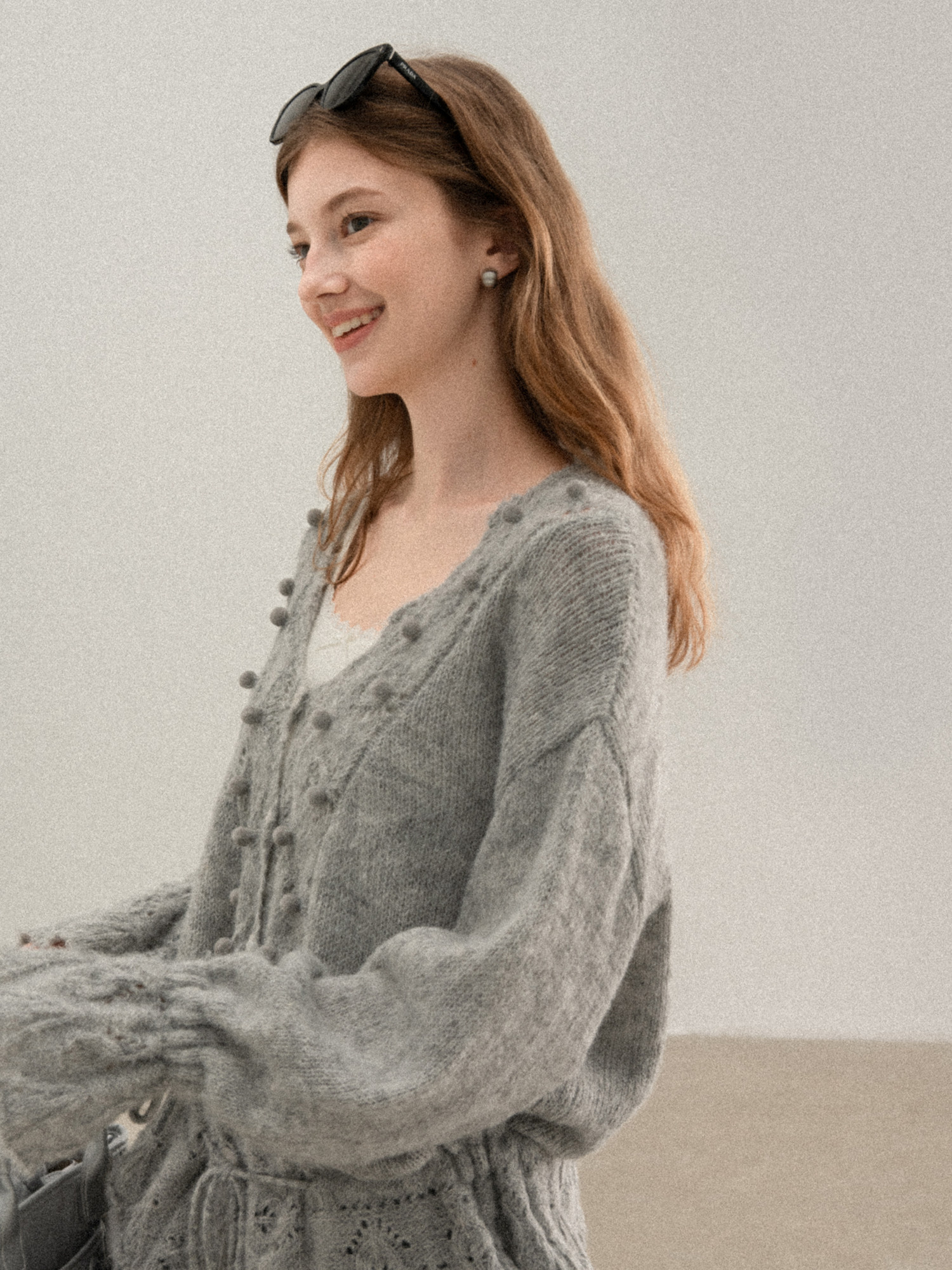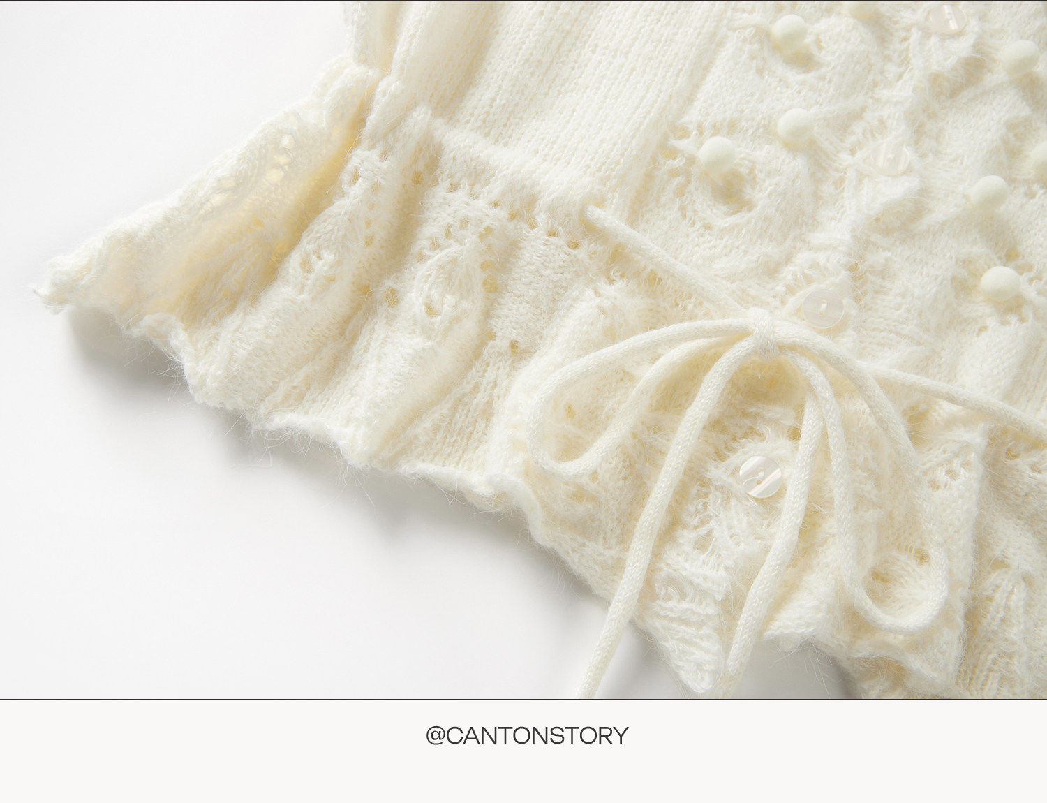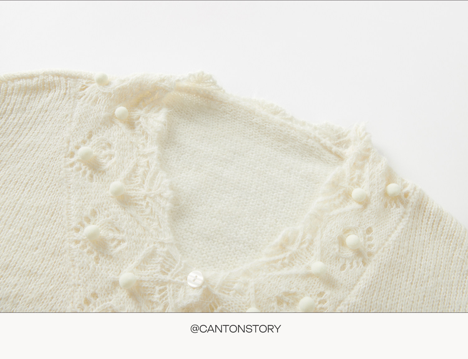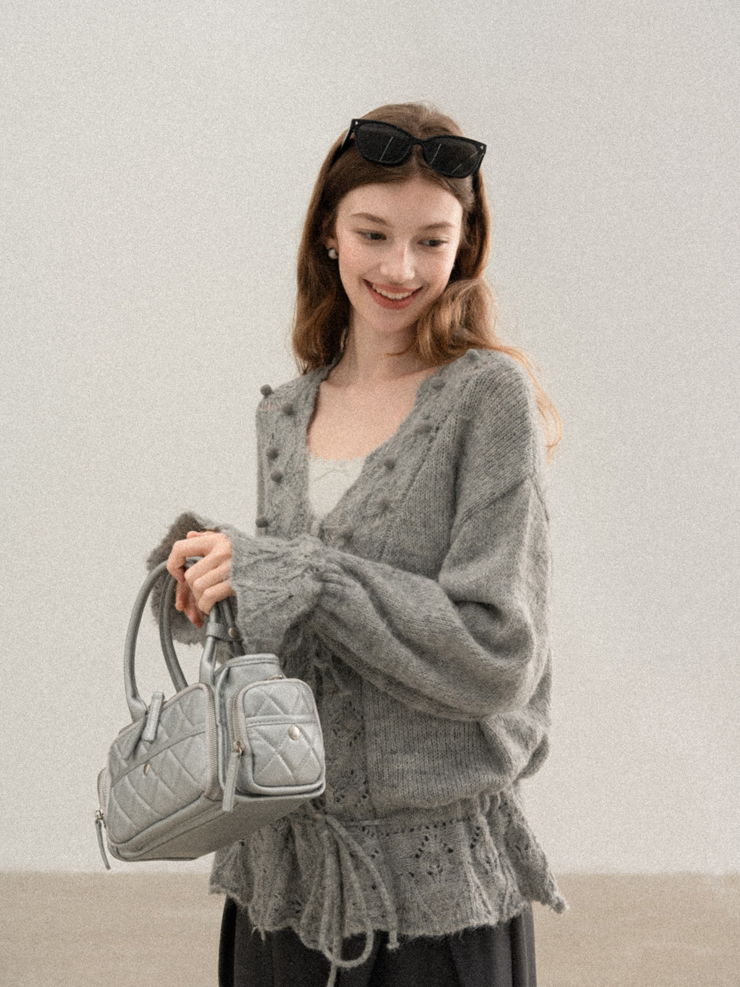 羊城故事 灰色鏤空鉤花v領長袖針織毛衣女秋季新款甜美收腰上衣