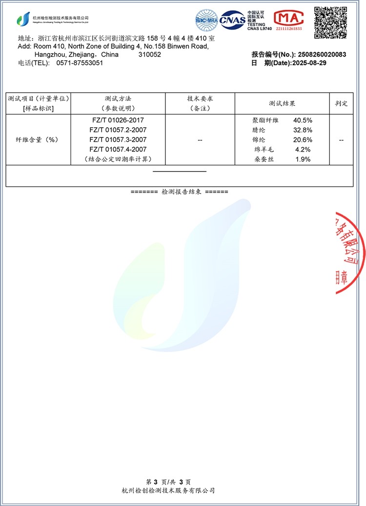 | 材質成分 | 聚酯纖維40.5% 聚丙烯腈纖維(腈綸)32.8% 聚醯胺纖維(錦綸)20.6% 羊毛4.2% 桑蠶絲1.9% |