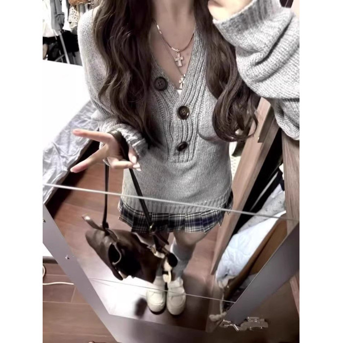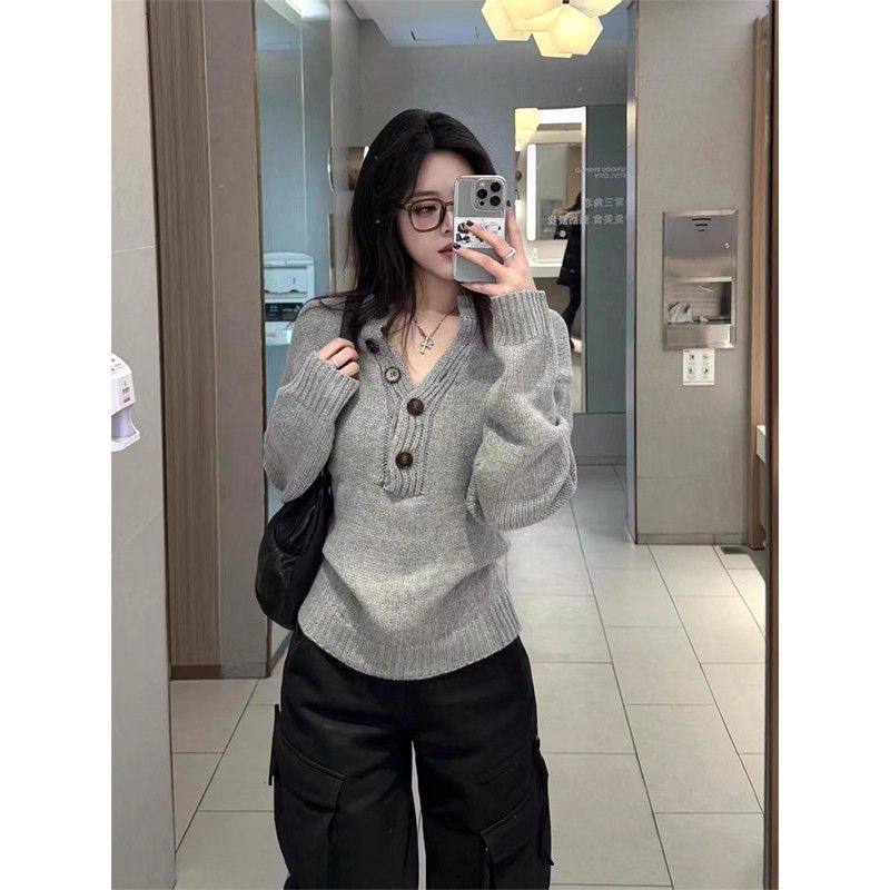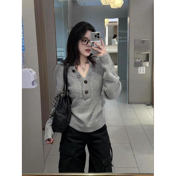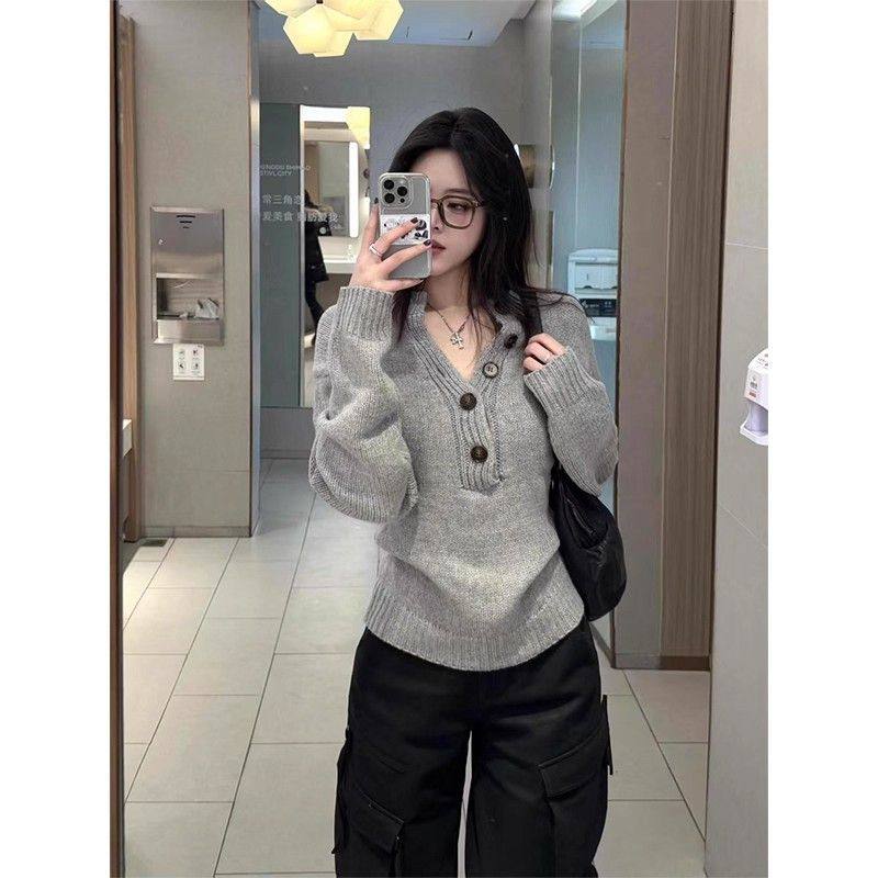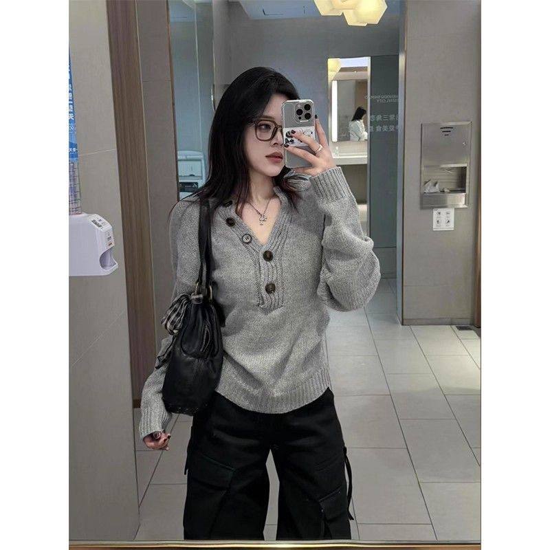 美式灰色亨利領長袖針織衫女秋季新款修身顯瘦辣妹內搭打底衫上衣