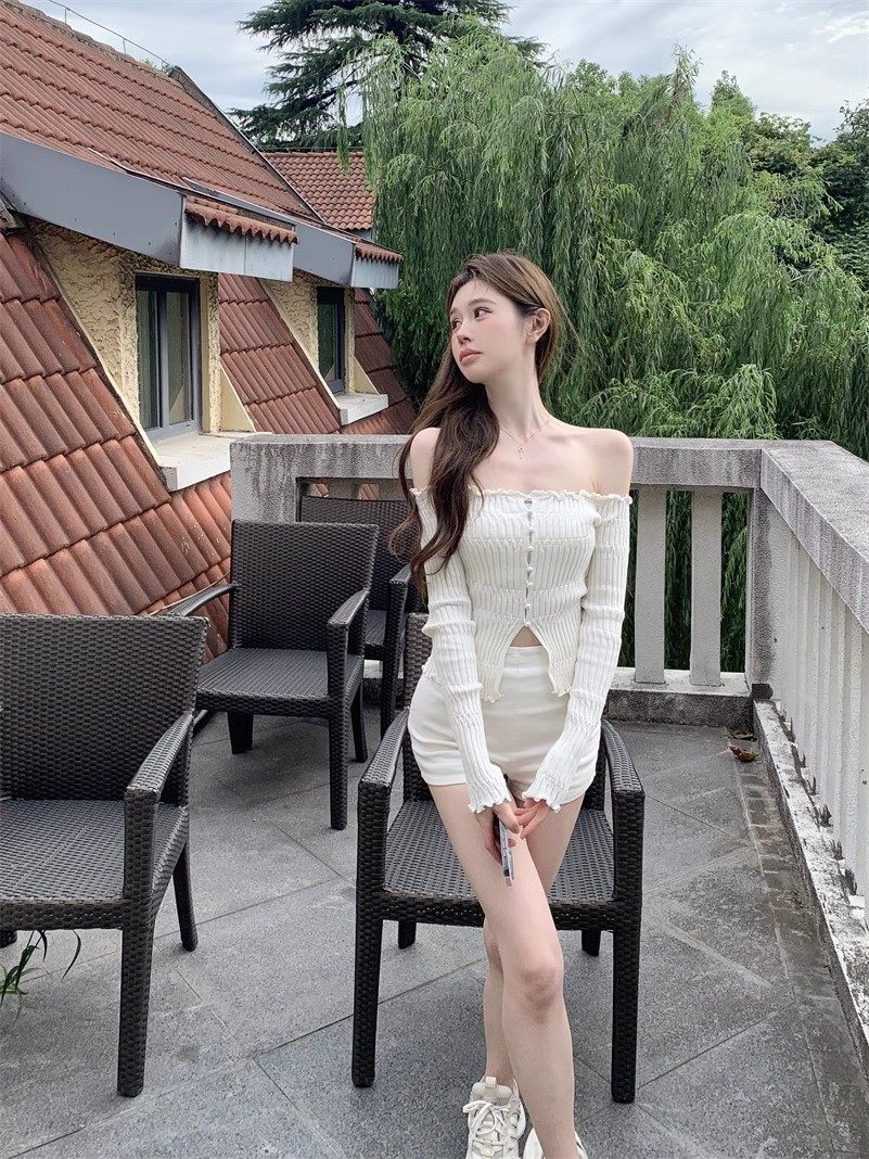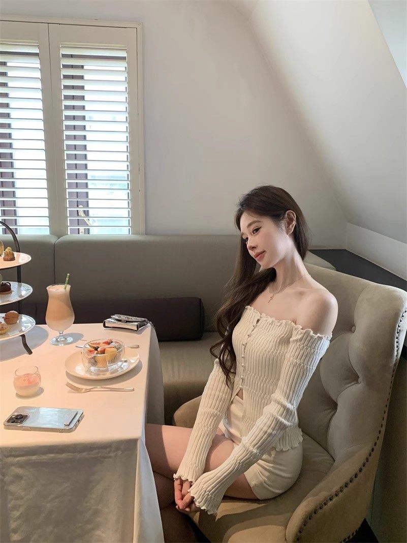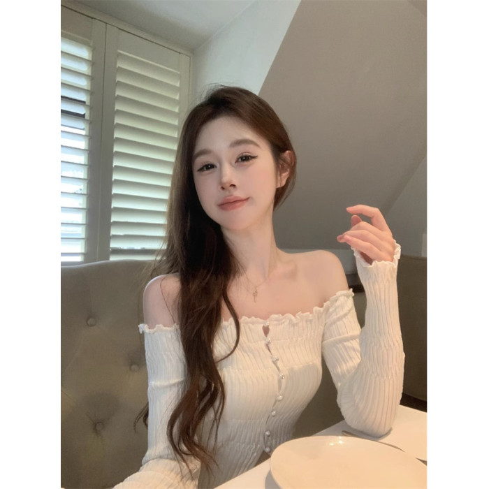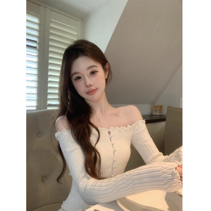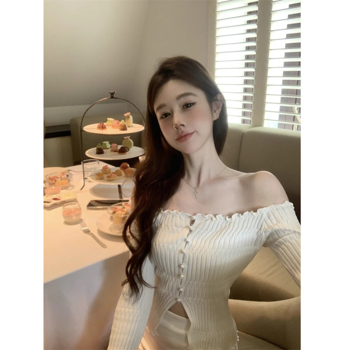 白色一字肩長袖針織衫女秋季純欲風收腰修身毛衣鏤空短款露肩上衣