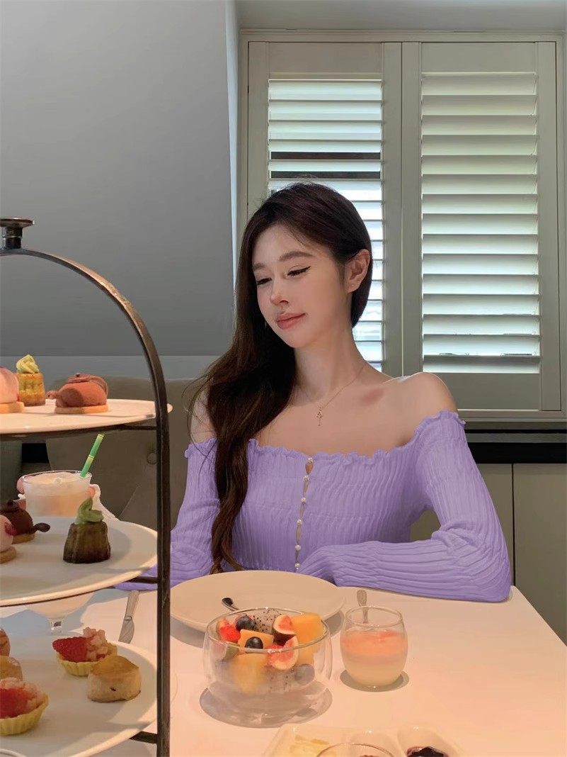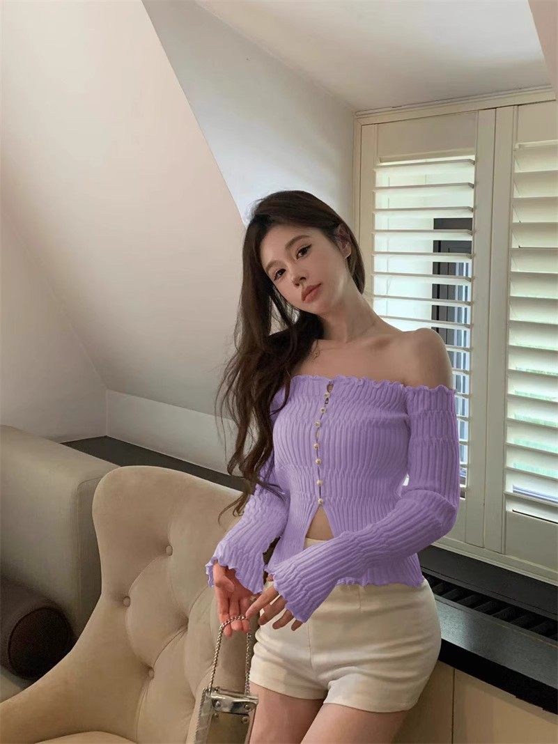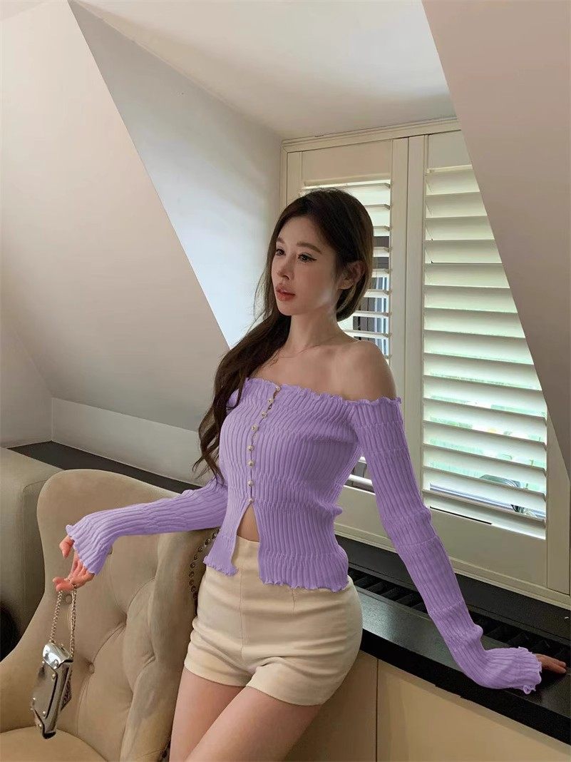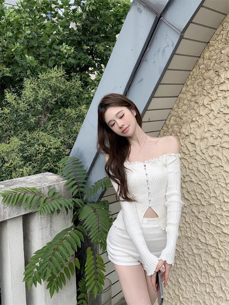 白色一字肩長袖針織衫女秋季純欲風收腰修身毛衣鏤空短款露肩上衣