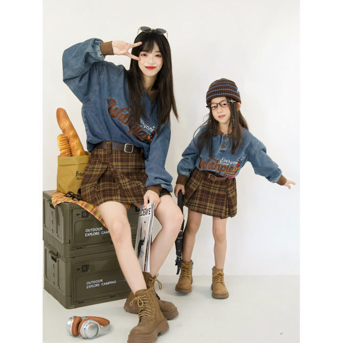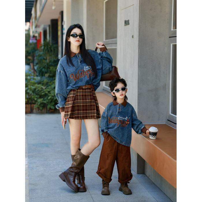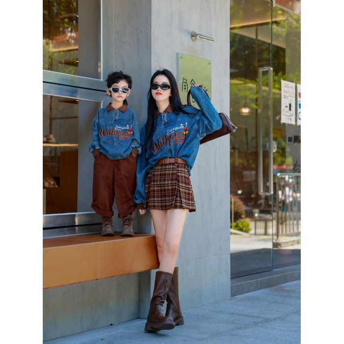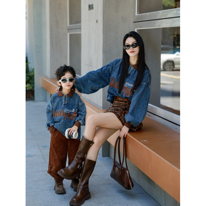 又潮又酷親子裝母子美式復古襯衫秋季新款兒童翻領字母刺綉牛仔衣