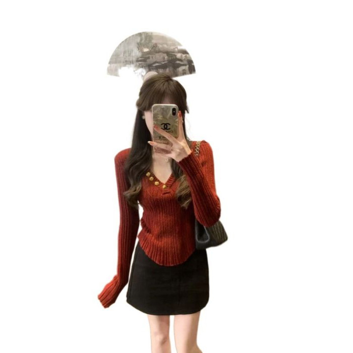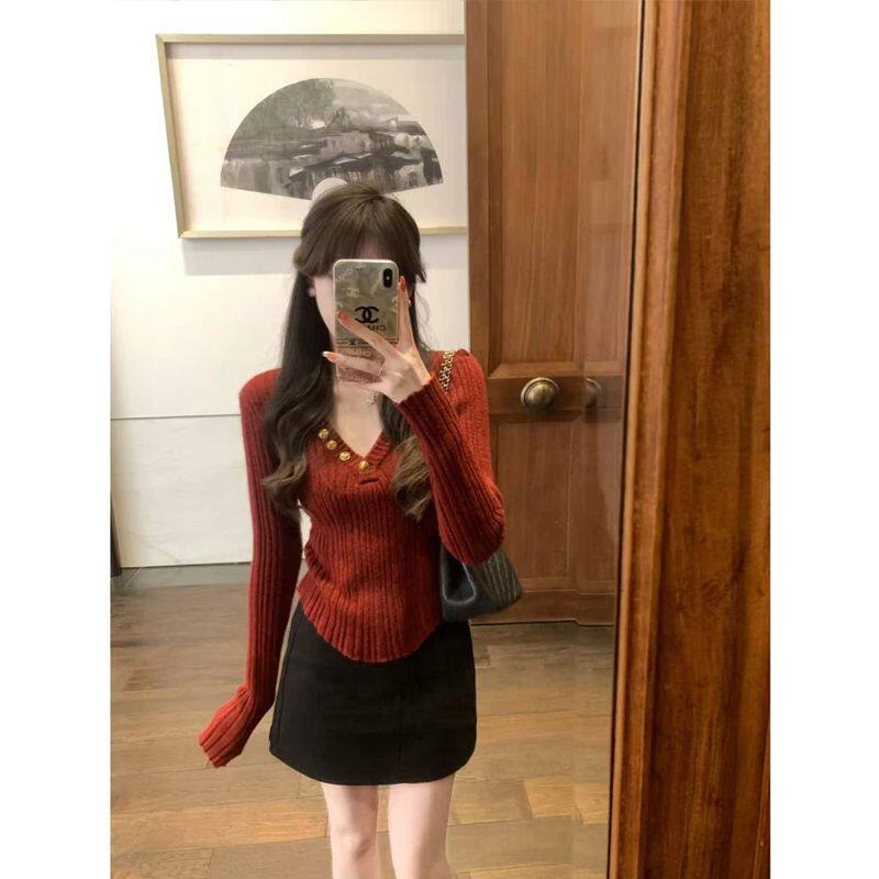 新年聖誕紅色v領針織毛衣女秋冬高級感不規則洋氣內搭打底衫上衣